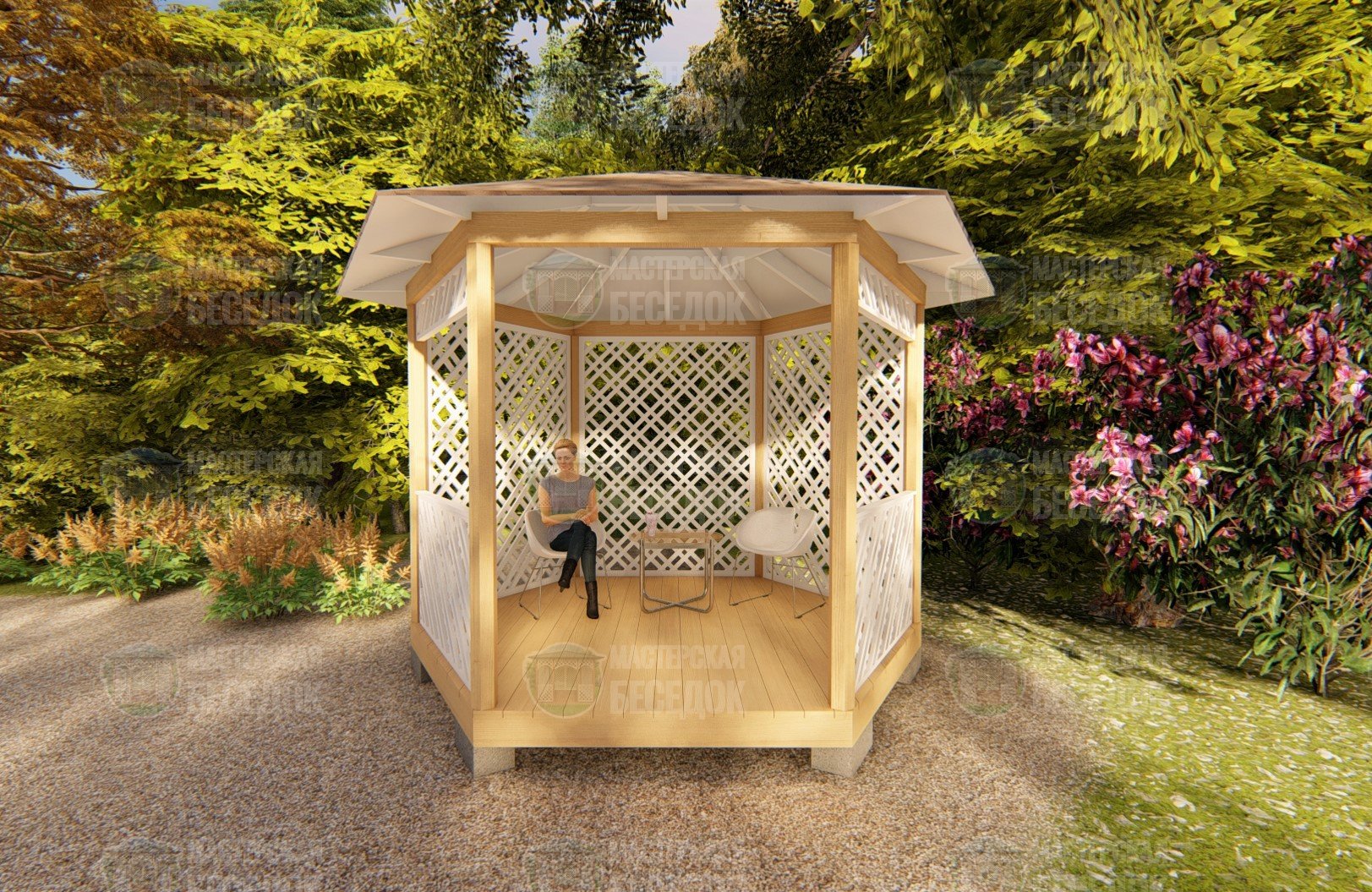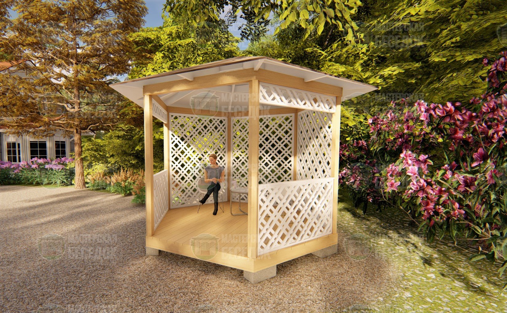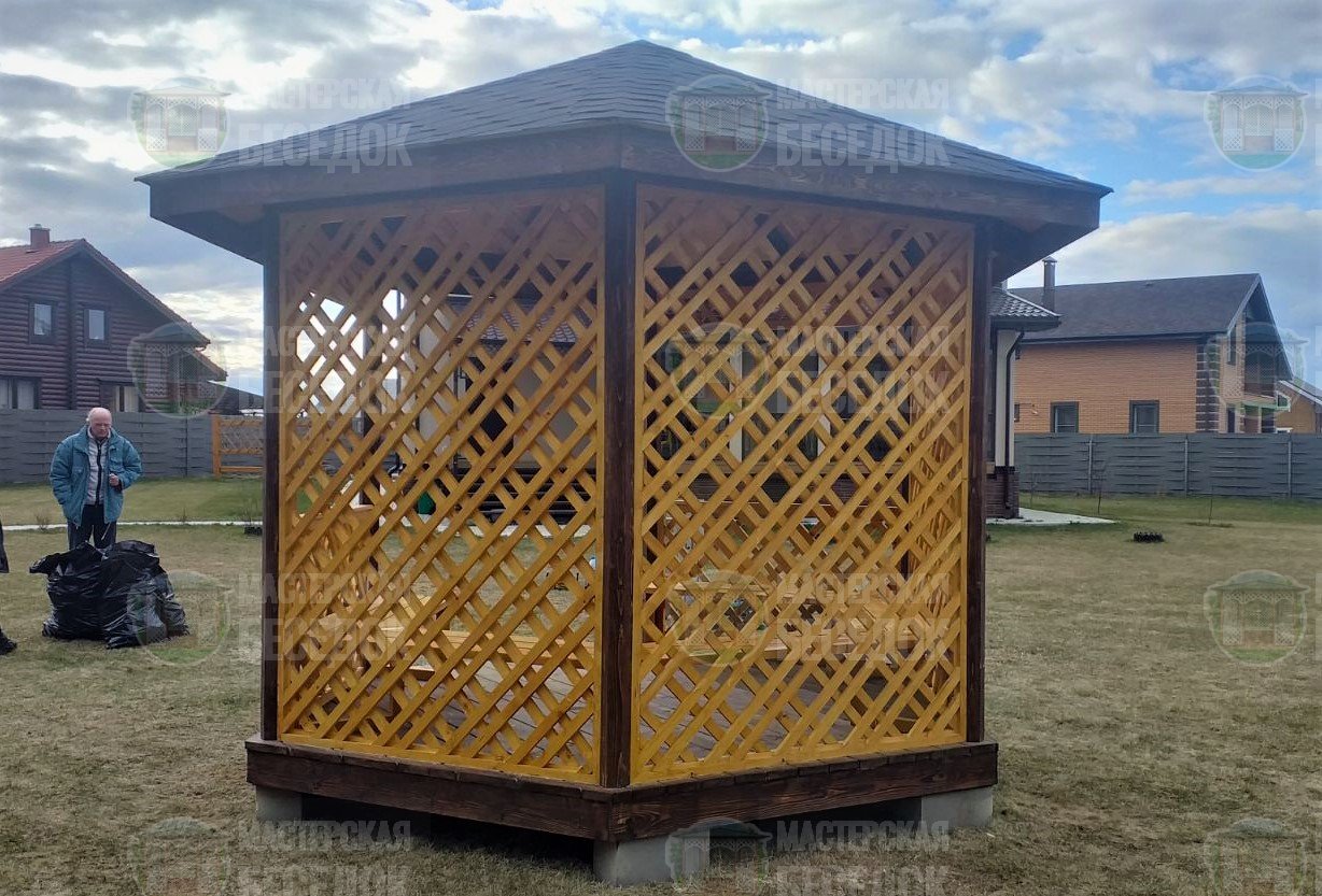Деревянная беседка “Павлин” отличается от других беседок оригинальной формой декоративных пергол-решеток. Сдвоенные узкие рейки из сухой древесины камерной сушки придают особый шарм этой конструкции. На фотографиях беседка обработана бесцветной пропиткой класса Пинотекс, что защищает ее от атмосферных воздействий и одновременно подчеркивает натуральный цвет дерева.