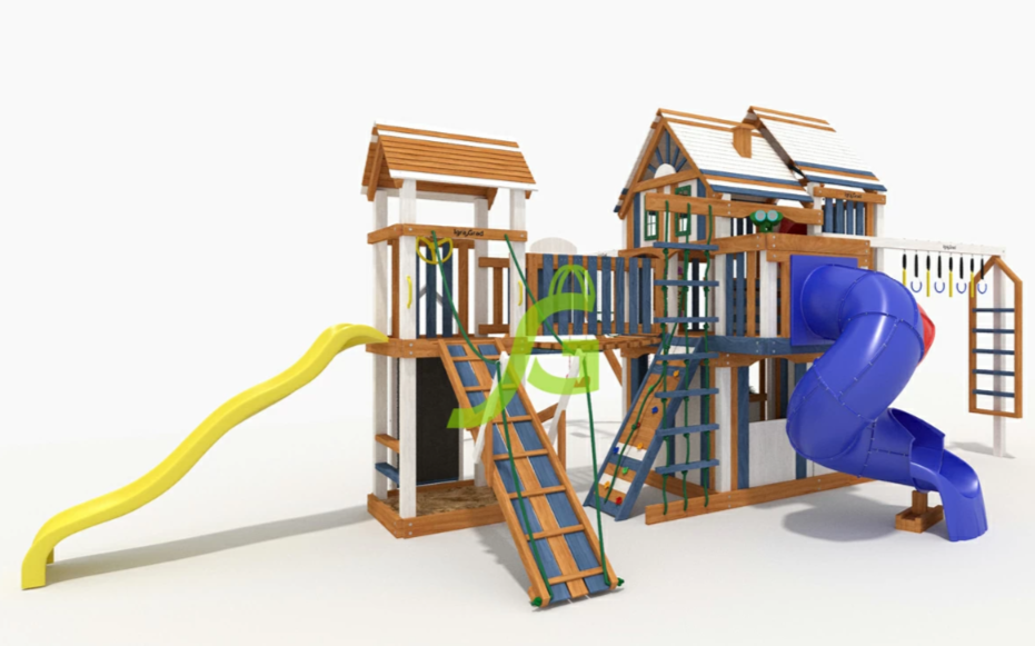 Можно кататься с горки, при этом дети не будут спорить, чья очередь скатываться. Ведь здесь присутствует сразу 4 разных горки: 2 волнообразные, 2 в виде трубы. Но возникает вопрос, как взобраться на желаемую горку? А вот это, самое интересное! Чтобы прокатиться с горки нужно сначала преодолевать путь препятствий. Но, всё зависит от предпочтений ребёнка, он может выбрать сложный или лёгкий путь, взбираясь только по деревянной лестнице или взбираясь по скалодрому, верёвочной лестнице.