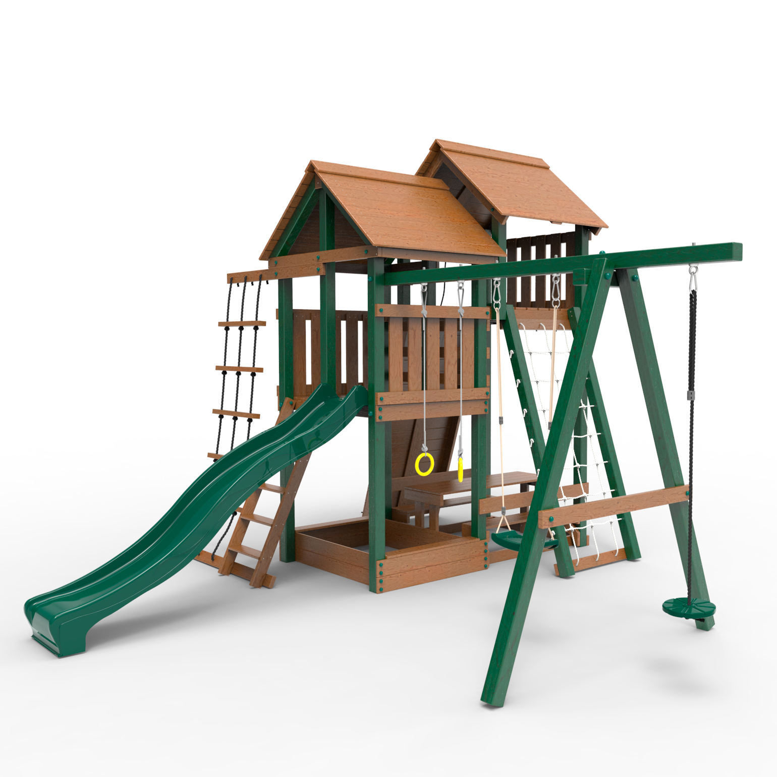Детская площадка «Пикник » представляет собой двухуровневую конструкцию. На первом уровне расположена песочница, на специальной перекладине расположены навесные элементы-качели. Второй этаж представляет собой игровое пространство под деревянной крышей или тентом(тент выполнен из яркой ,плотной, устойчивой к ультрафиолету ПВХ ткани). Праздничное настроение в любую погоду создают яркие тона тента, флага и ярко окрашенного пластика.