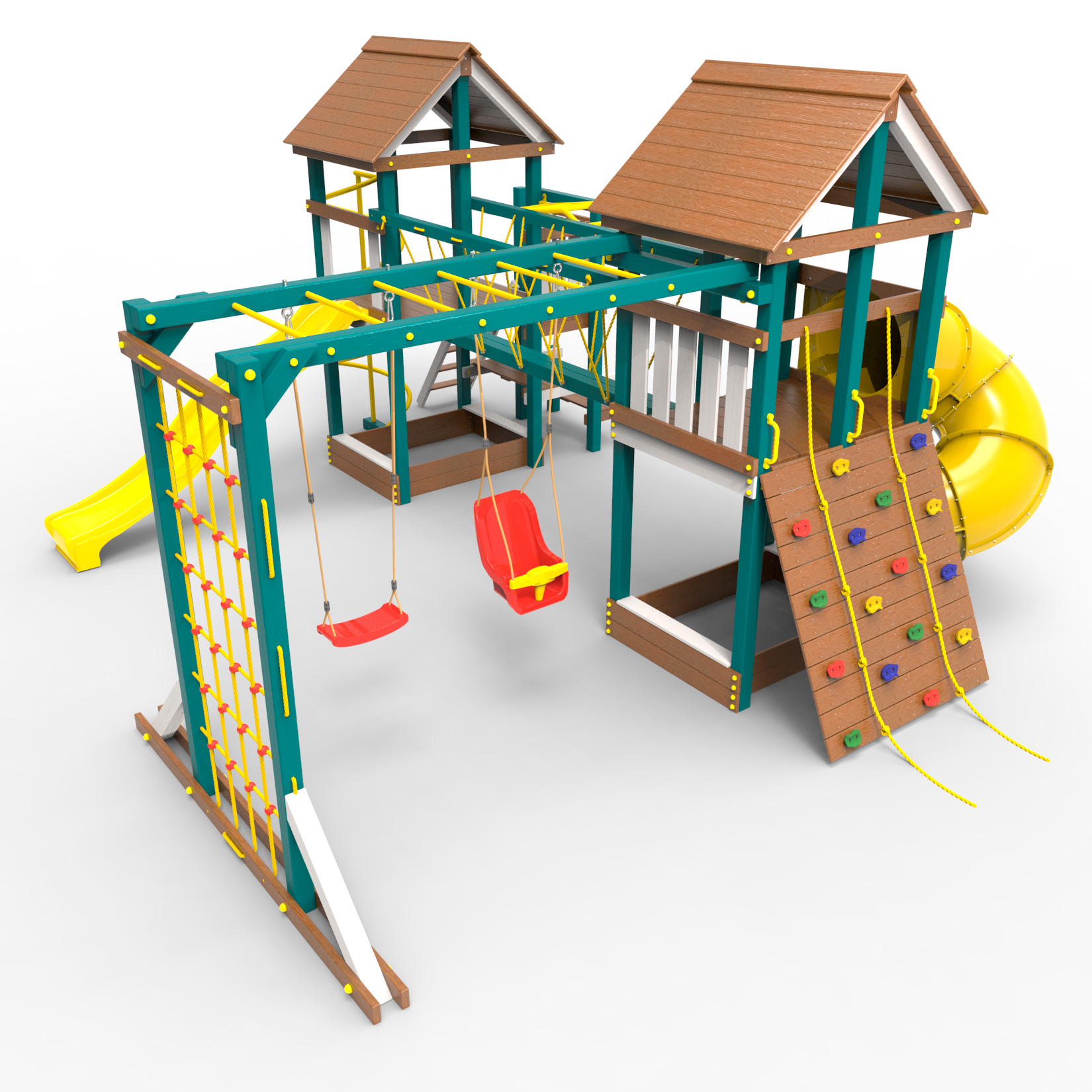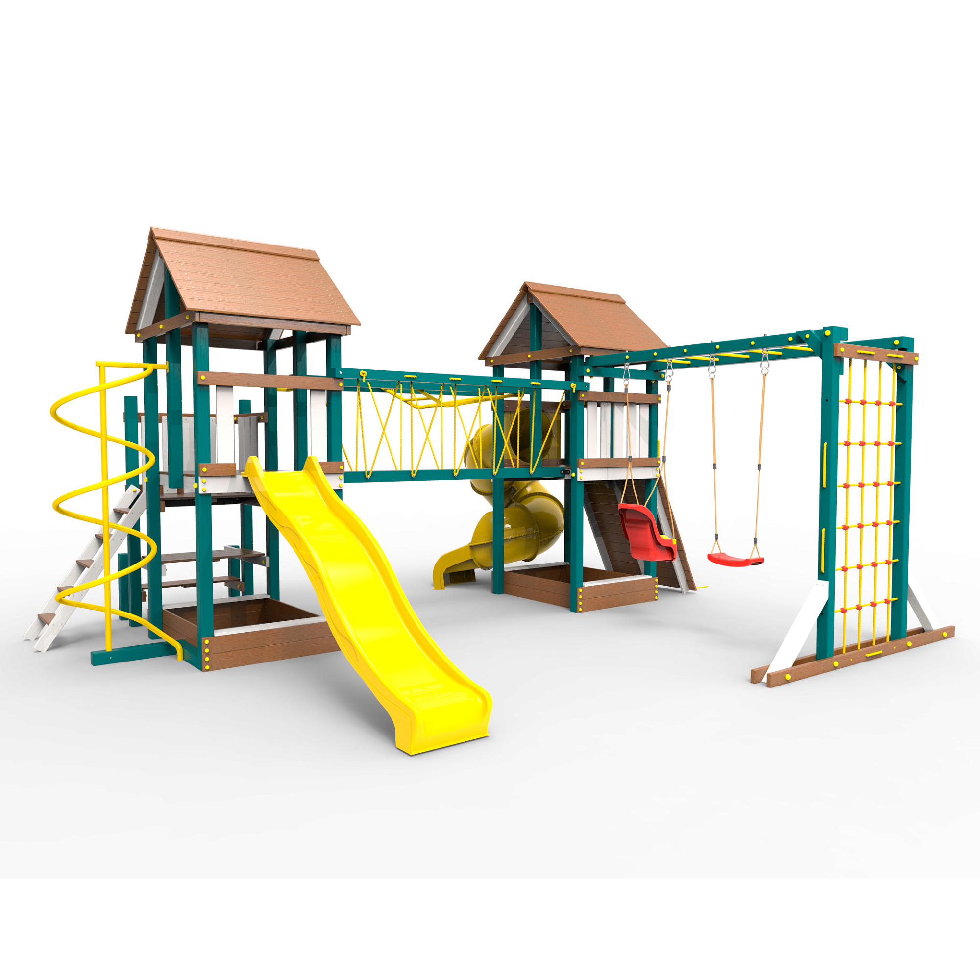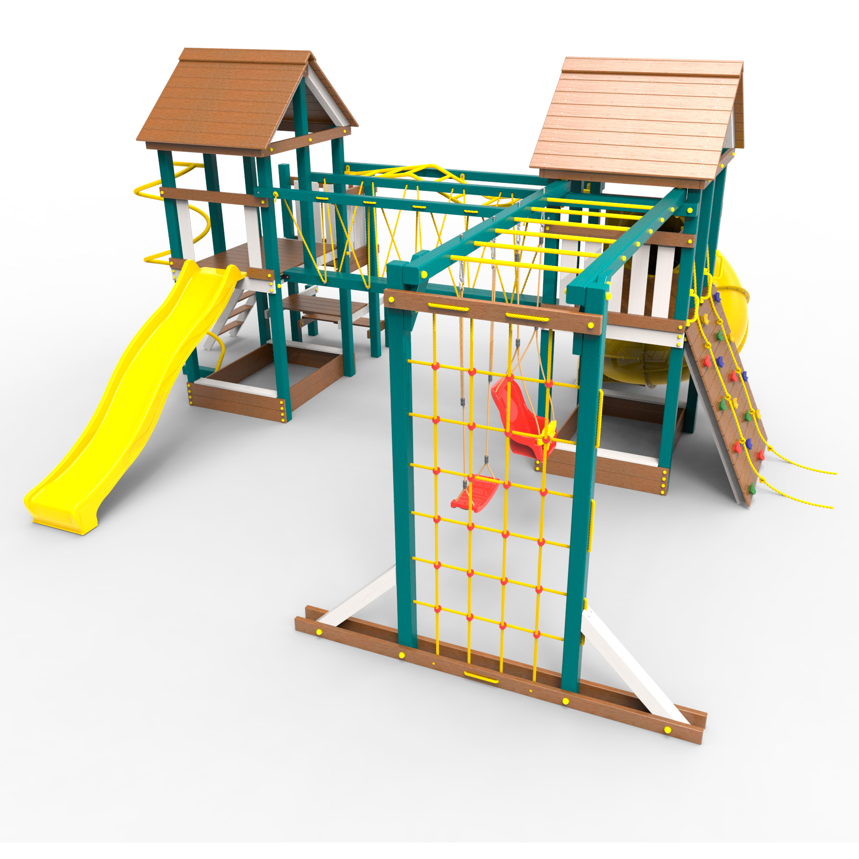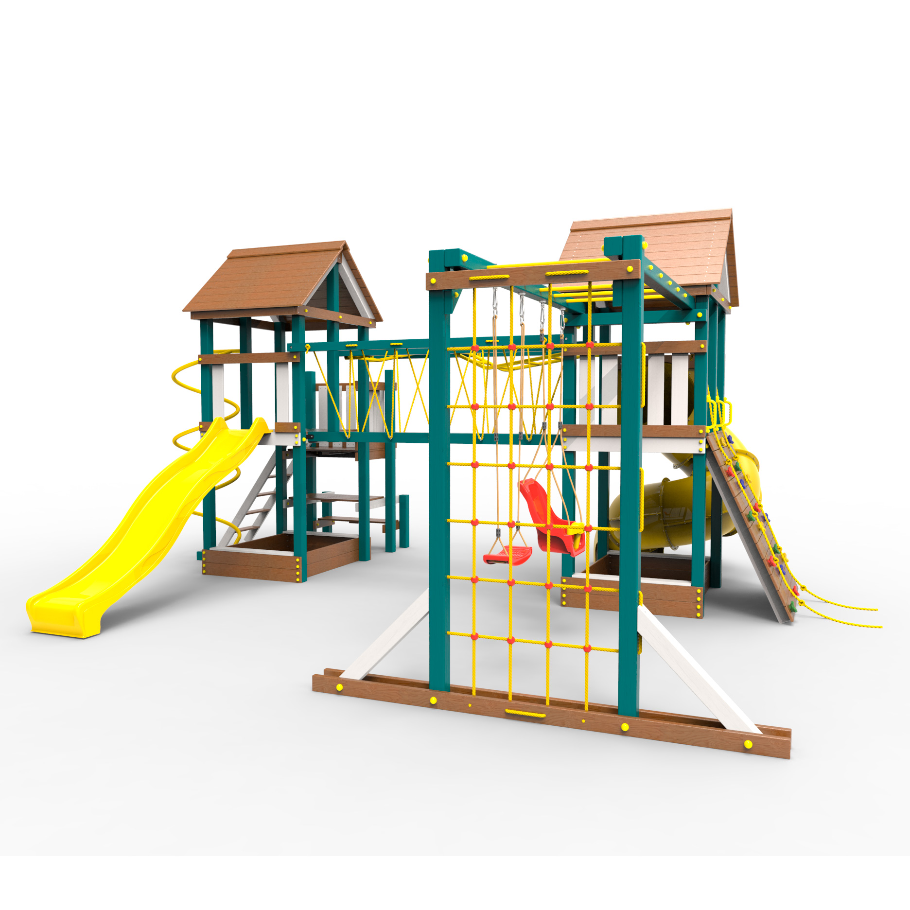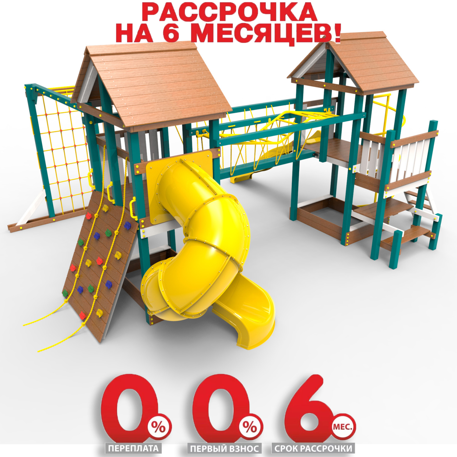 Обращаем Ваше внимание, что фактический цвет детской площадки может отличаться от представленных фото на сайте. Специфика окраски нетоксичными пропитками и красителями допускает отклонения в цветовой гамме отгружаемых изделий. Также обратите внимание, что фактический цвет может отличаться из-за цветопередачи устройства на котором Вы смотрите фото. Производитель оставляет за собой право менять цвет отдельных деталей и комплектующих(включая пластик, канаты и пр.), при этом сохраняя весь функционал и характеристики товара.
