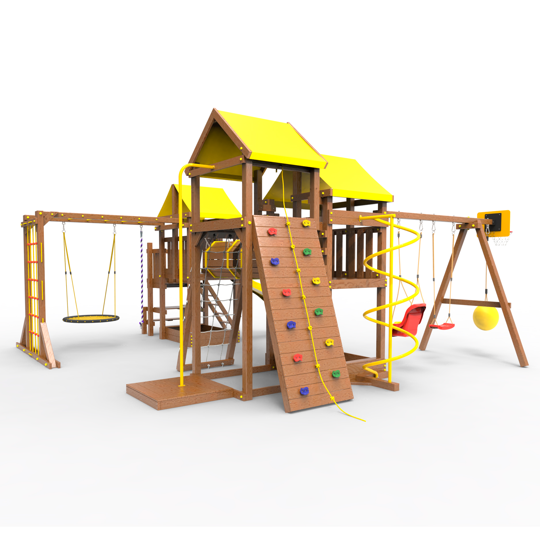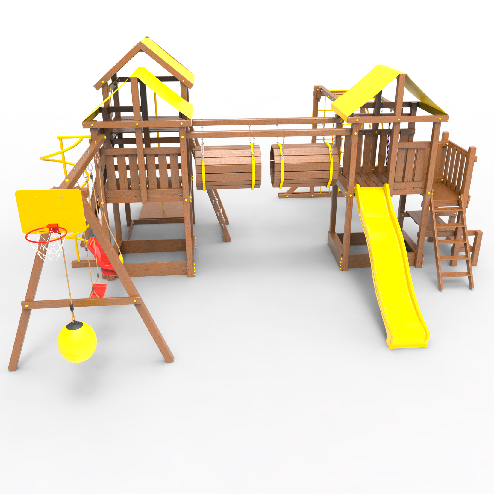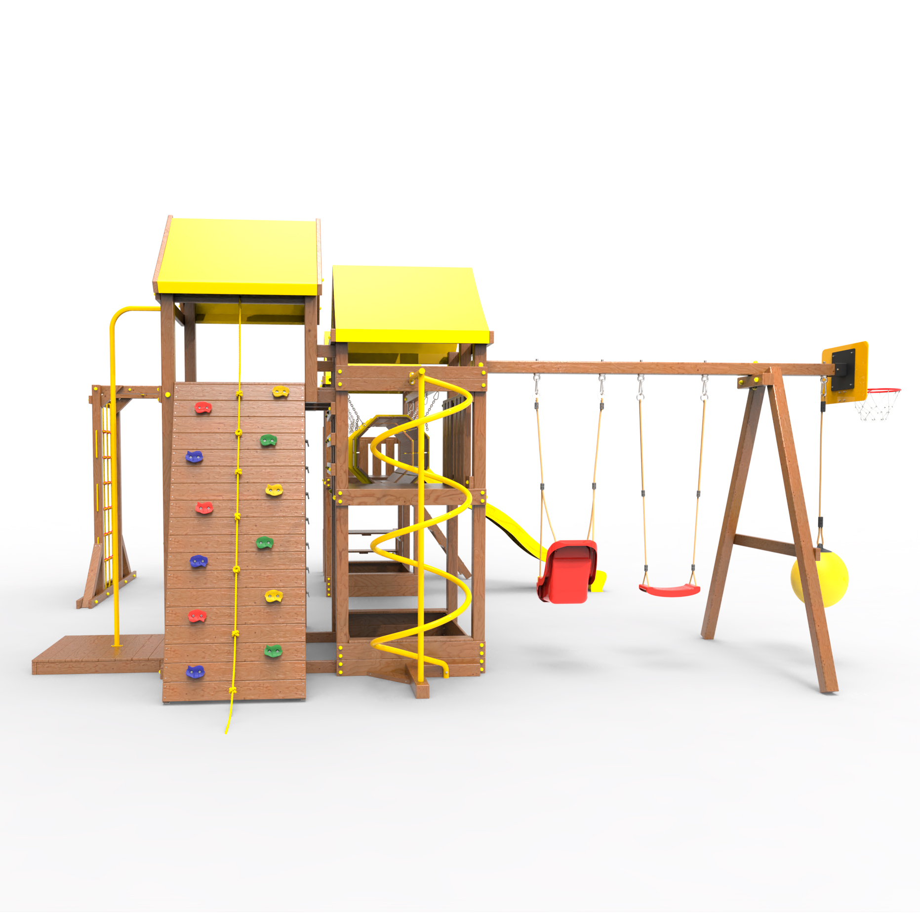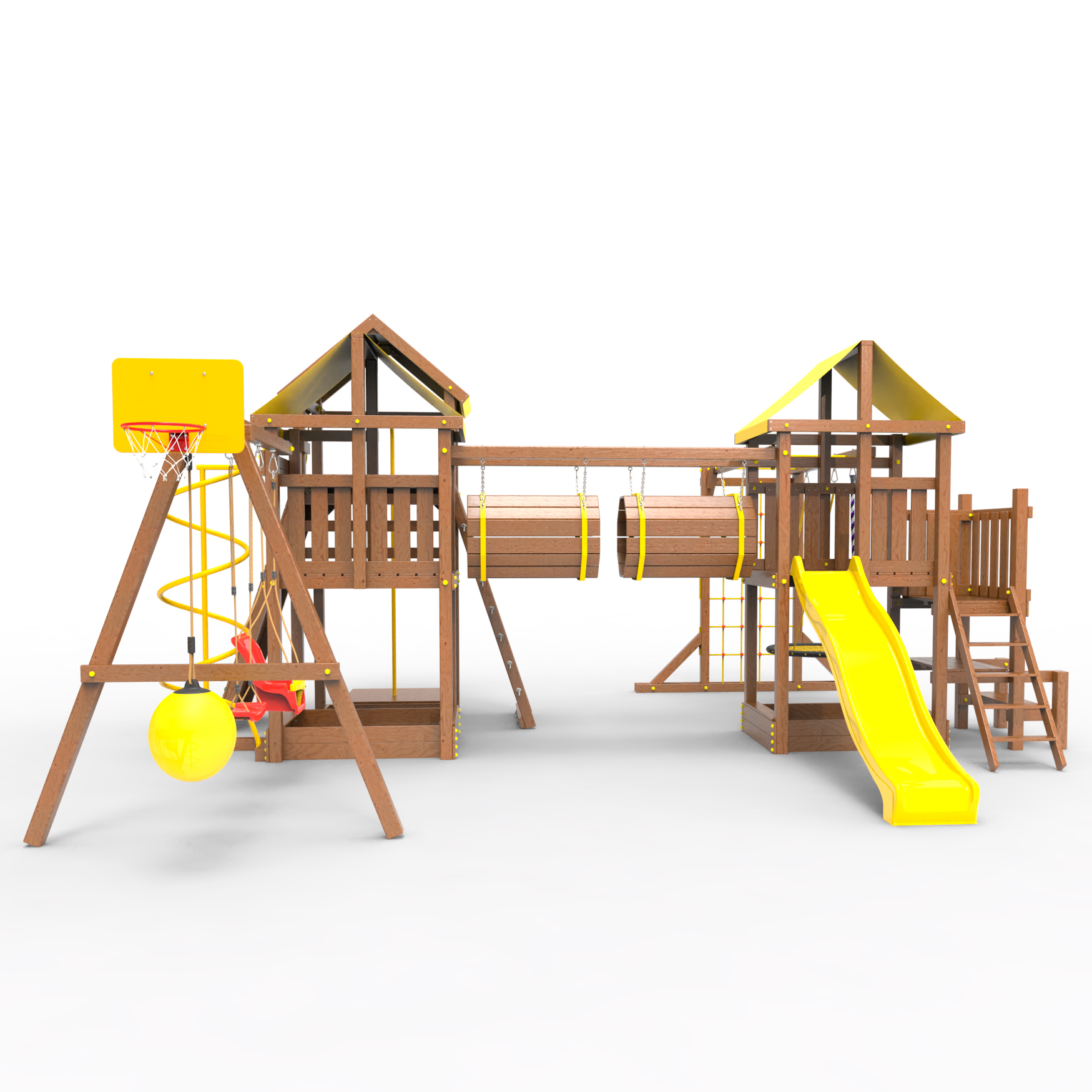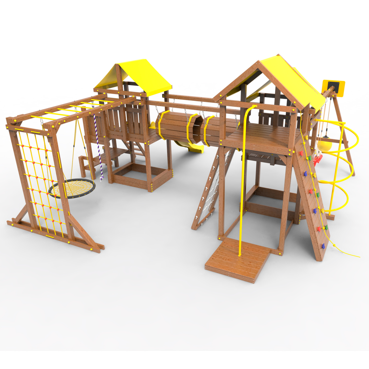 Два домика|Песочница|Лестница|Шторм-трап|Скалодром|Рукоход|Шведская стенка|Турник|Руфер|Баскетбольная корзина|Мостик|Горка|Спираль|Волна|Сеть для лазания|Качели