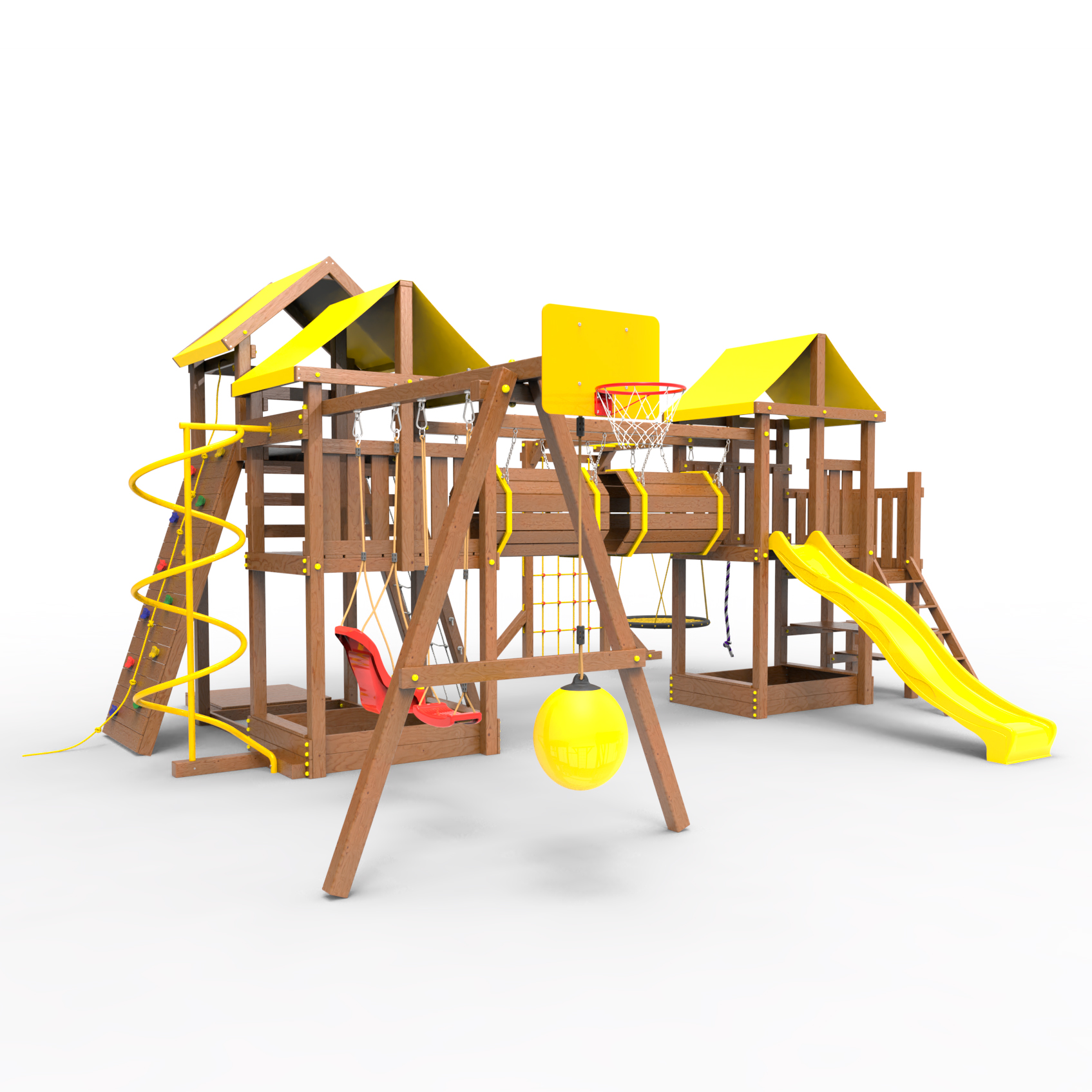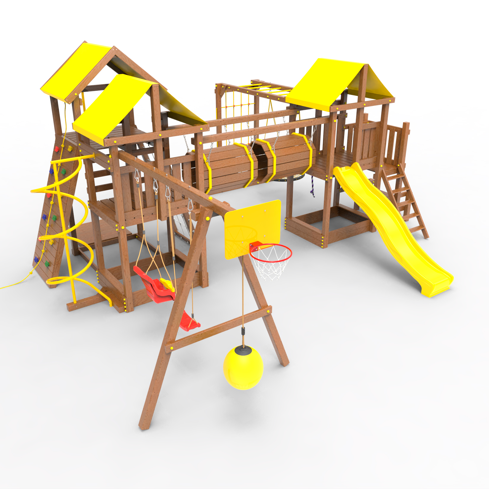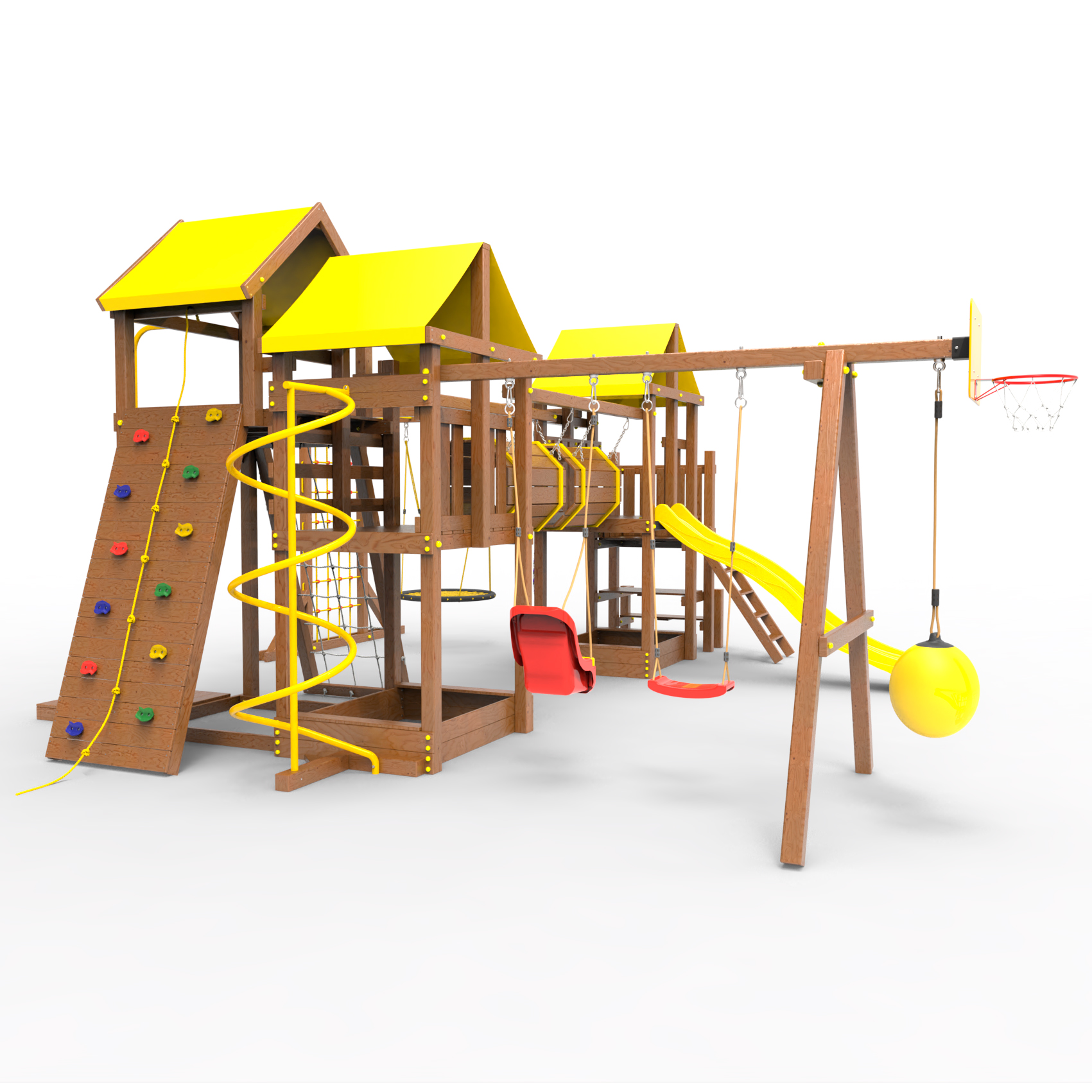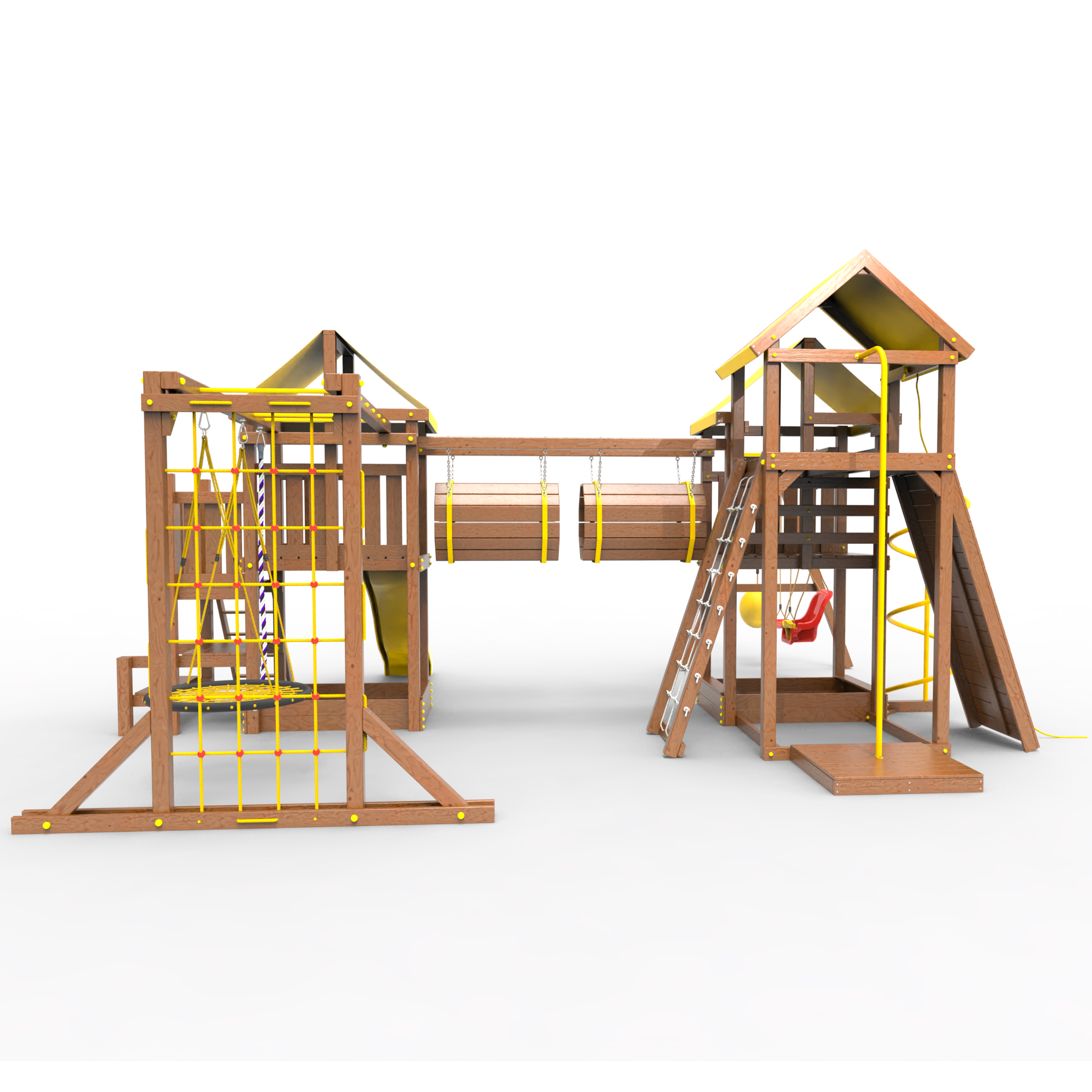 Два домика|Песочница|Лестница|Шторм-трап|Скалодром|Рукоход|Шведская стенка|Турник|Руфер|Баскетбольная корзина|Мостик|Горка|Спираль|Волна|Сеть для лазания|Качели