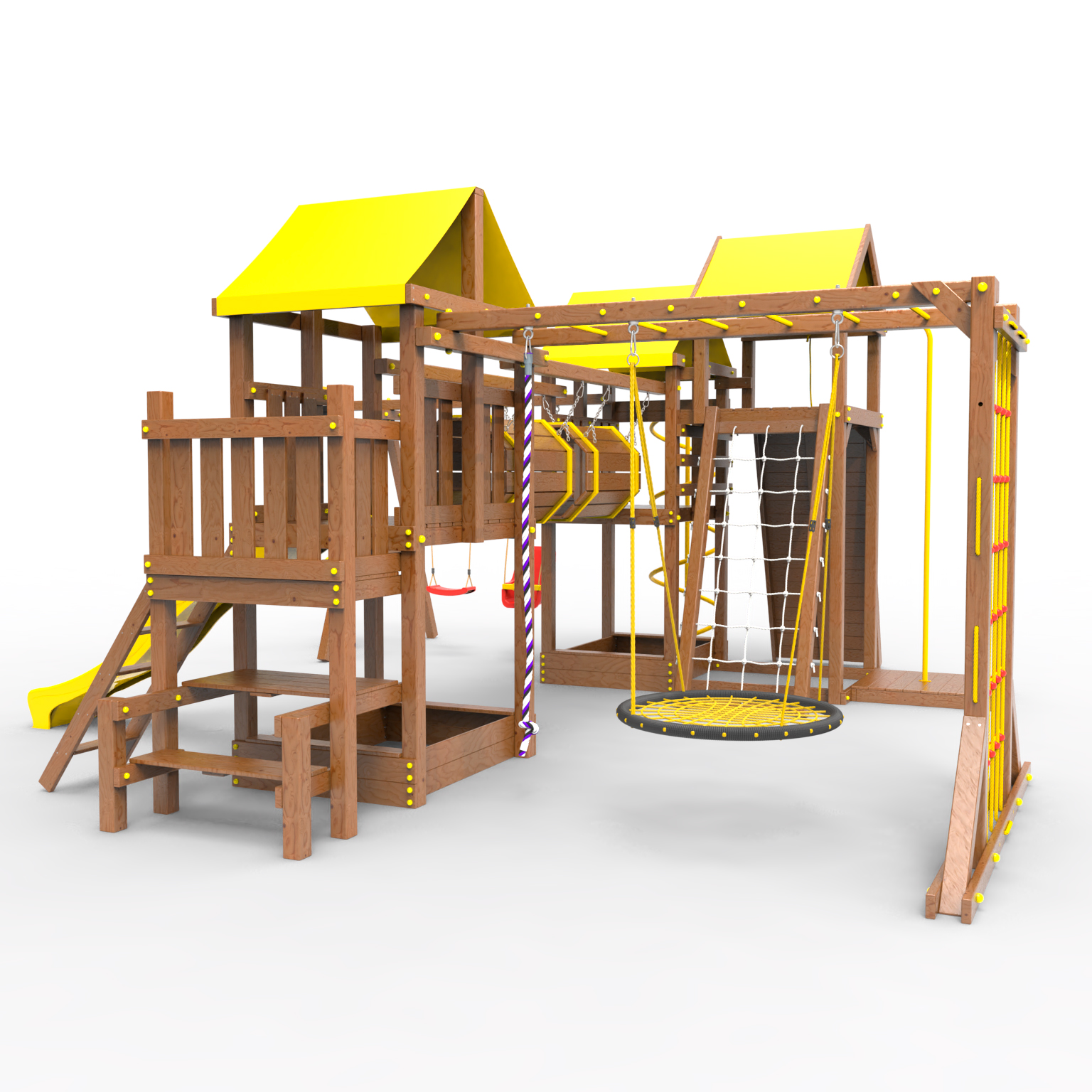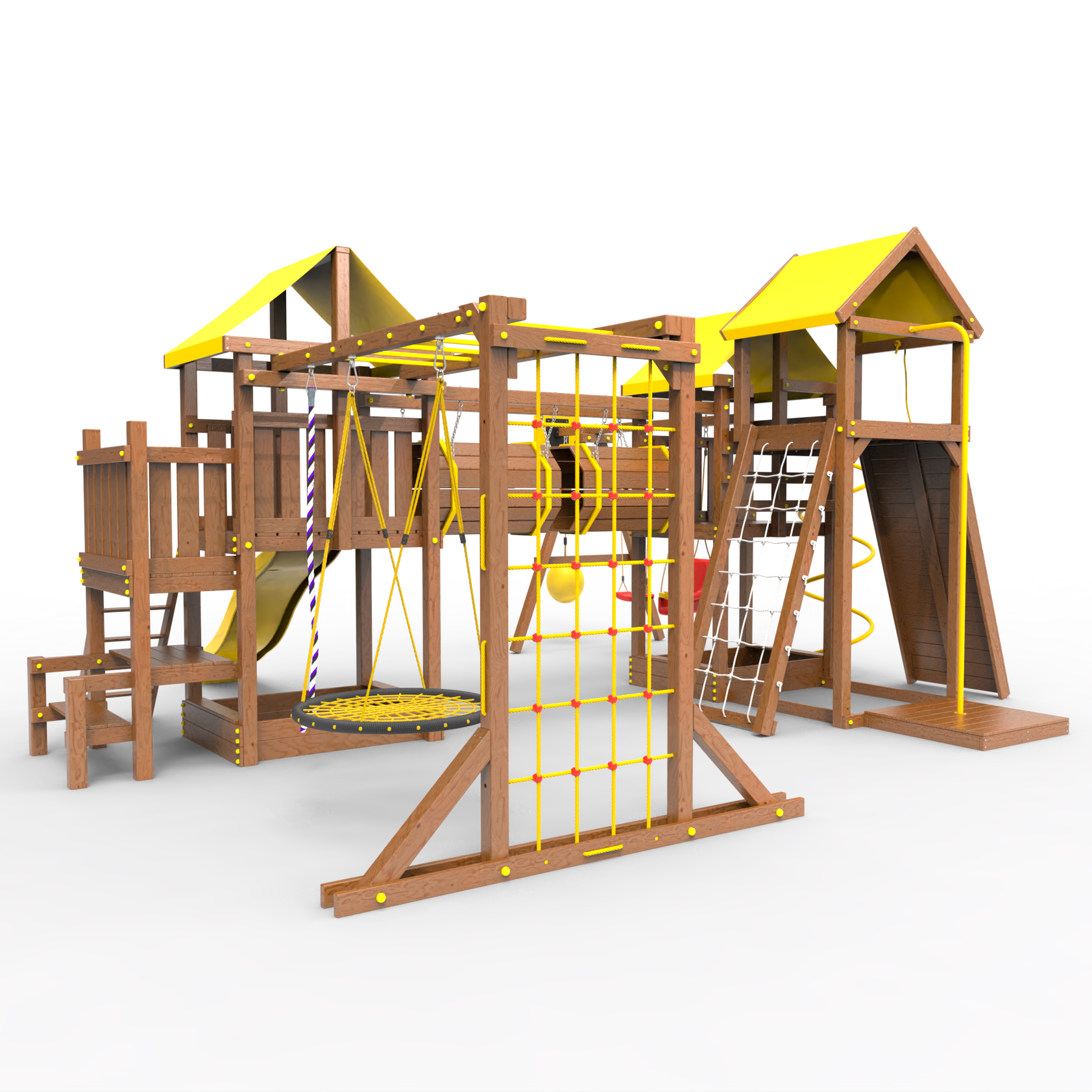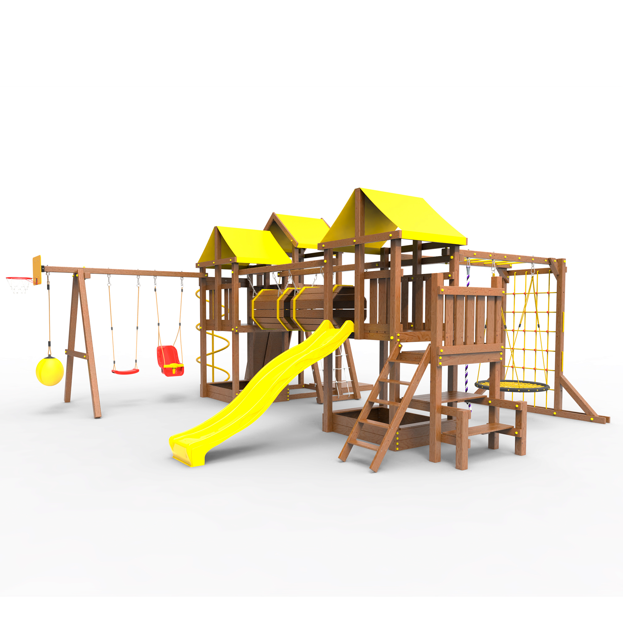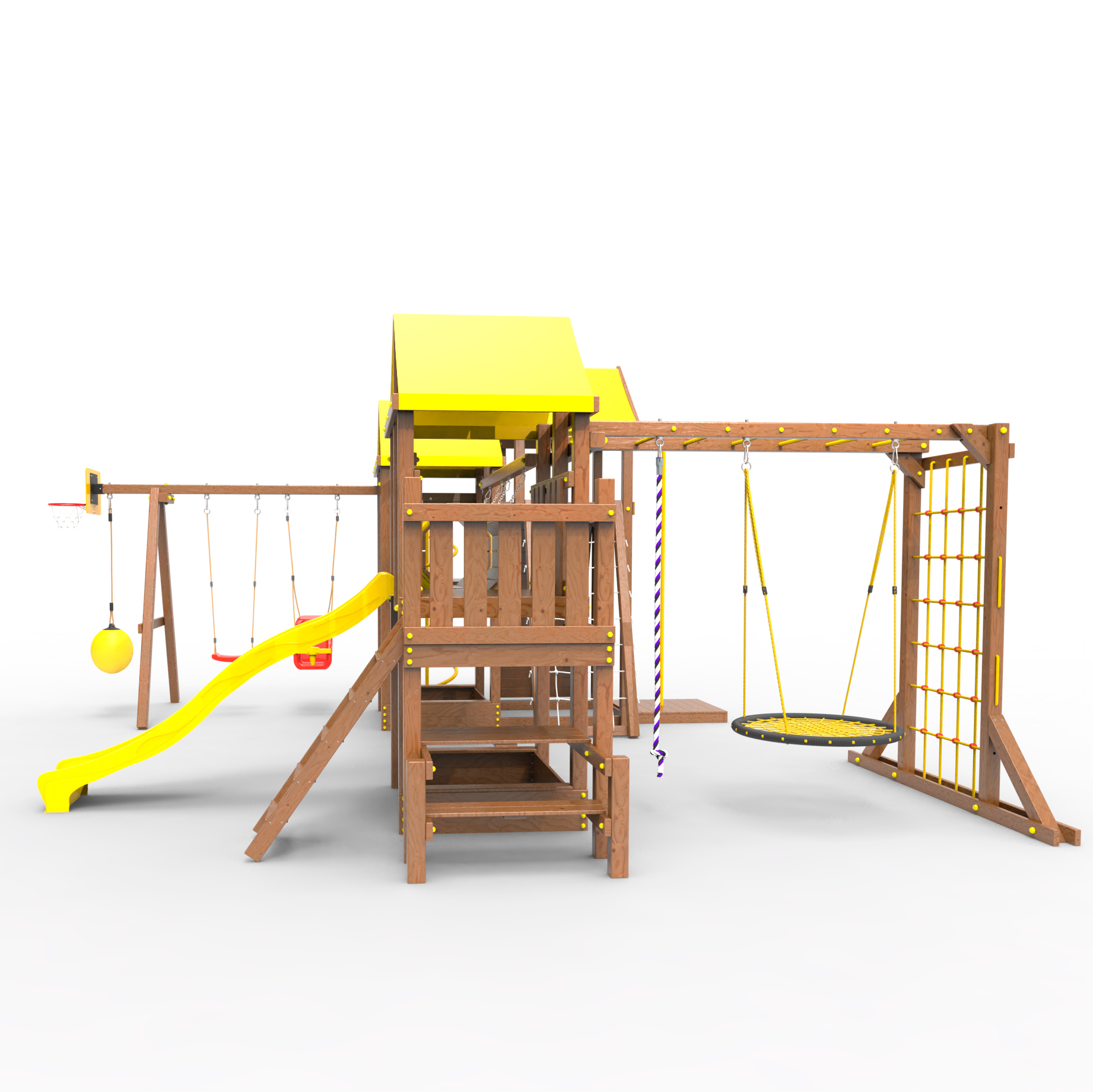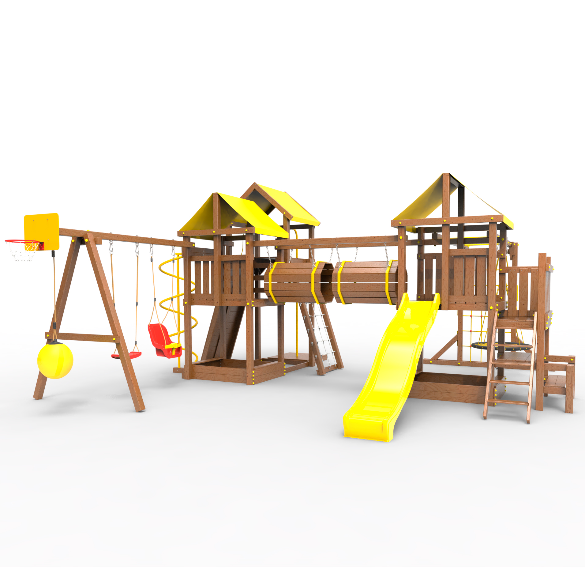 Два домика|Песочница|Лестница|Шторм-трап|Скалодром|Рукоход|Шведская стенка|Турник|Руфер|Баскетбольная корзина|Мостик|Горка|Спираль|Волна|Сеть для лазания|Качели