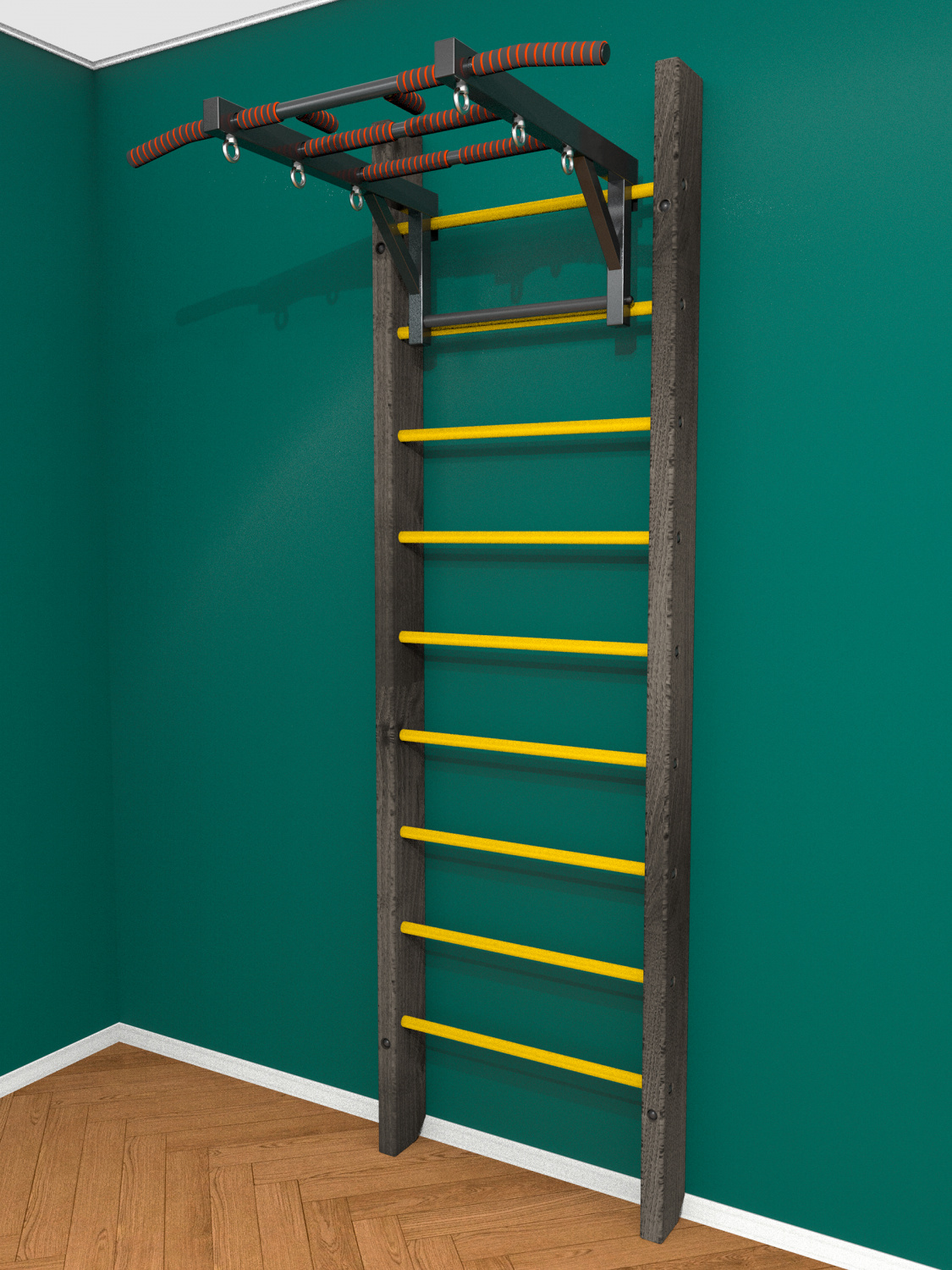 картинка Брашированная шведская стенка "Кастерли" Black с турником (Желтые ступени) от магазина Лазалка