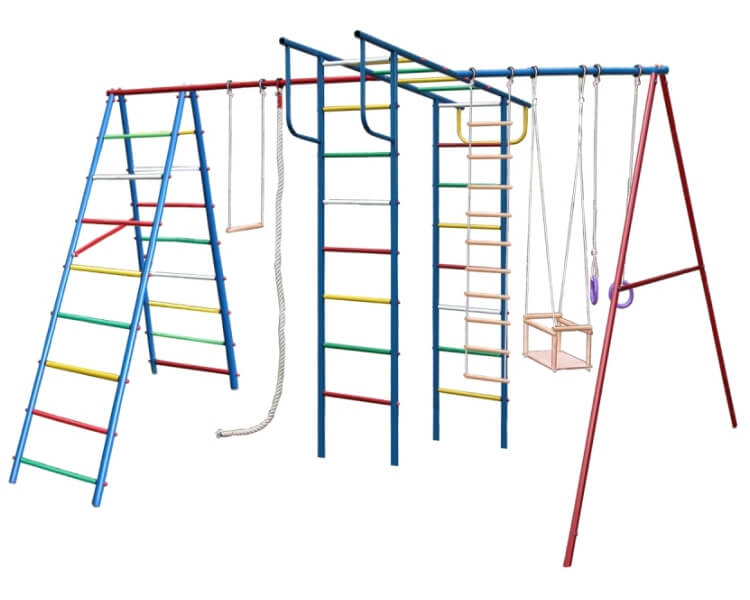 Стойки синие и красные, ступени разноцветные.