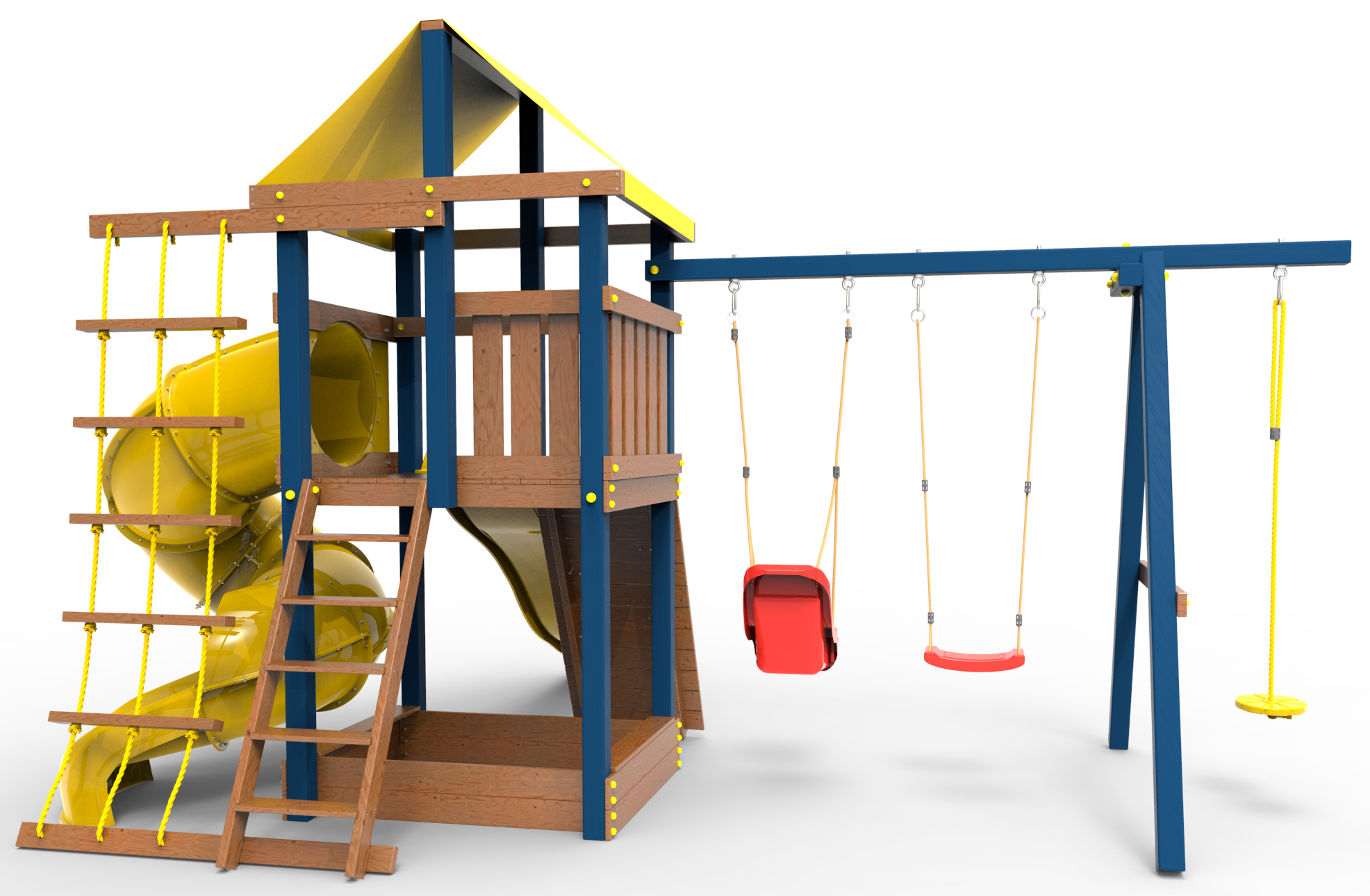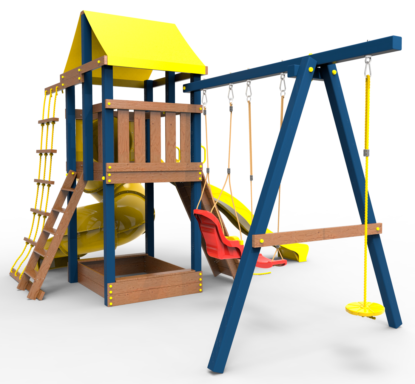 Все столбы и качельная балка площадки выполнена из высокопрочного клеёного бруса камерной сушки сечением 90х90мм.