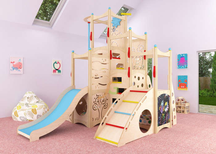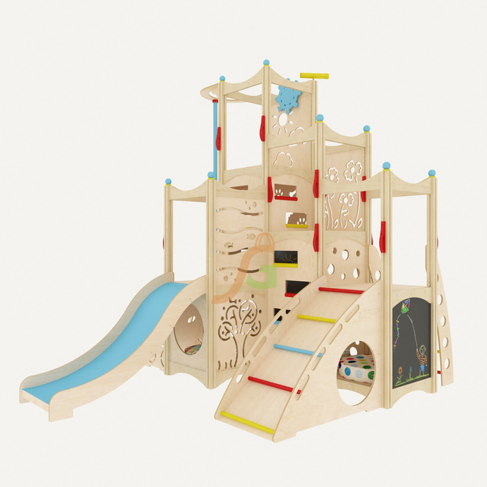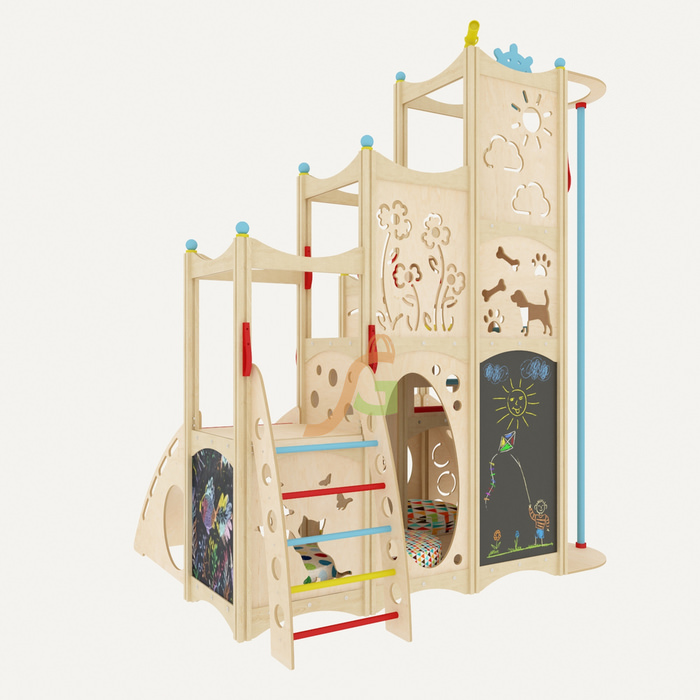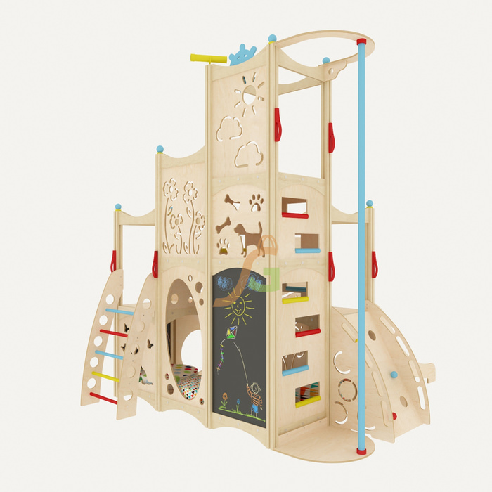 Для изготовления конструкции используется фанера из берёзы, толщина которой составляет 15 мм. Гладкую поверхность, сохранность эстетичного вида обеспечивает масляная пропитка безопасного состава. Дети будут много времени проводить в игровом домике, поэтому в её оформлении сохраняется натуральность древесины, присутствуют только базовые оттенки. Это необходимо для того, что нервная система не раздражалась. При сборке щиты монтируются надёжными креплениями.