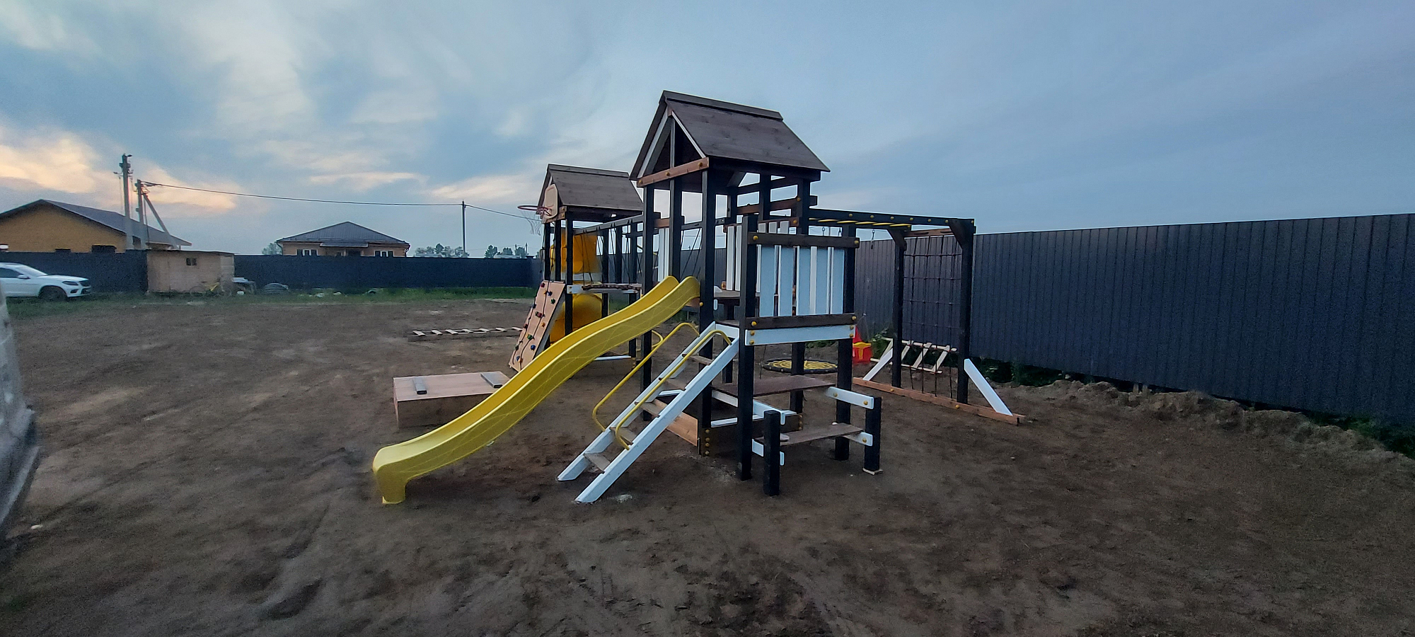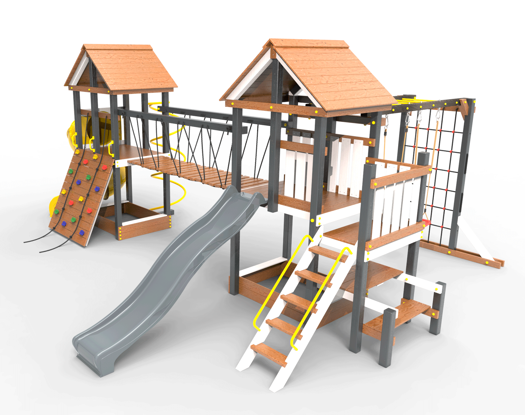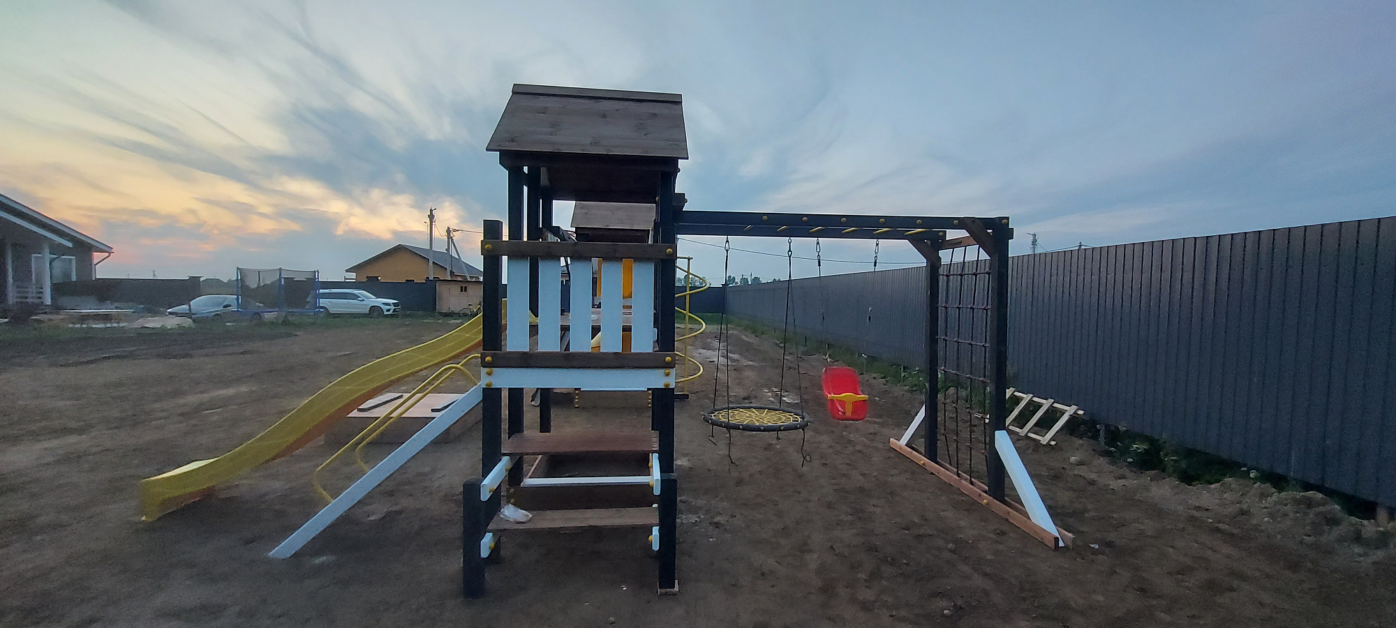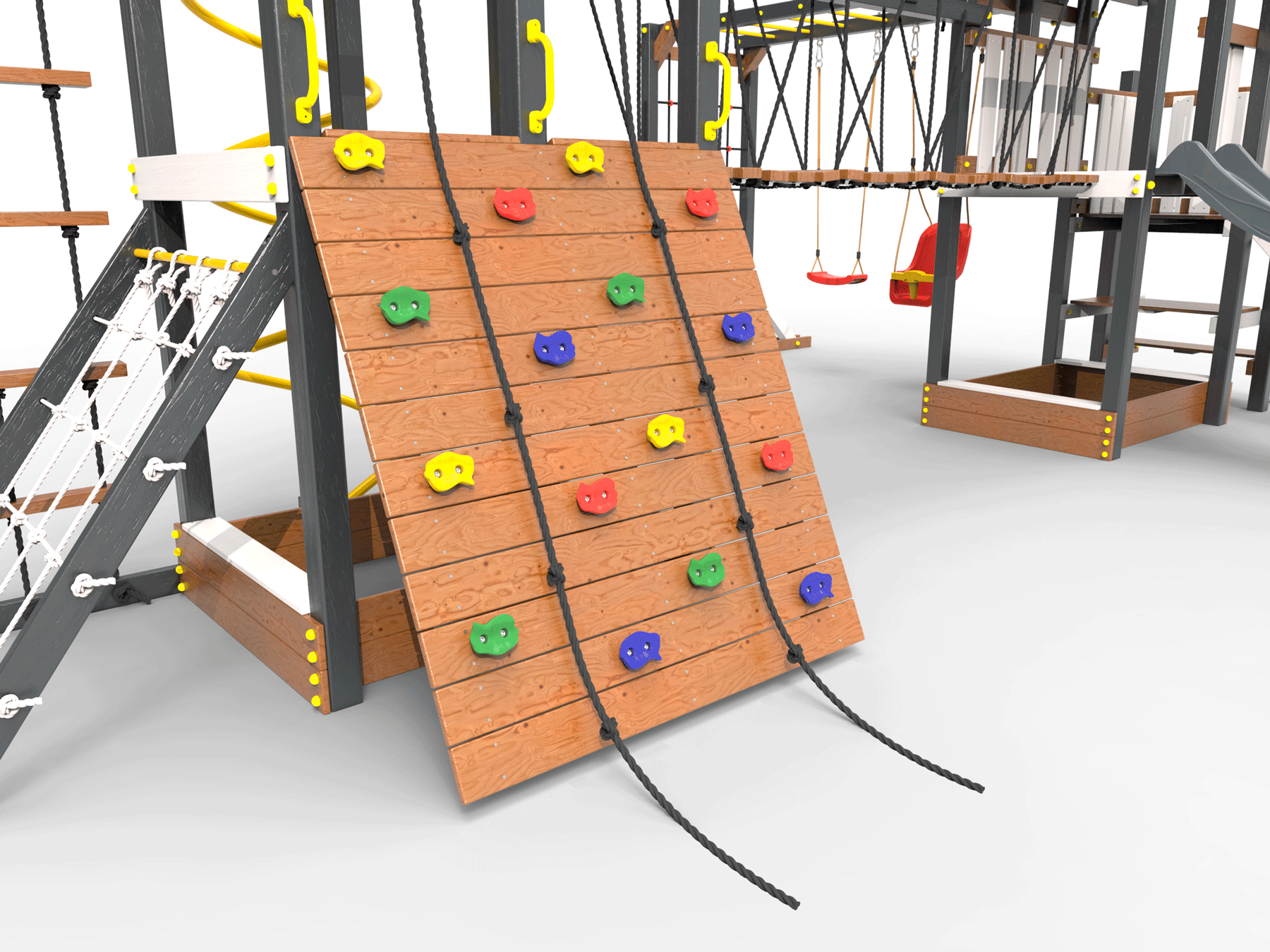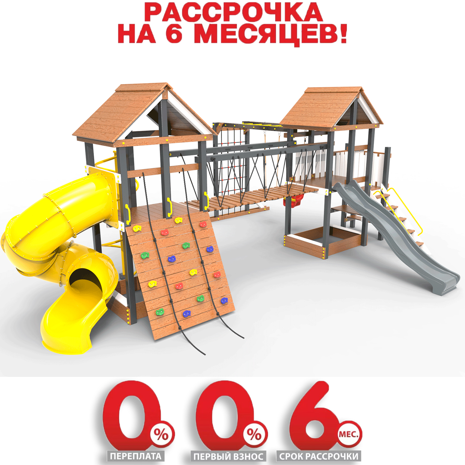 Обращаем Ваше внимание, что фактический цвет детской площадки может отличаться от представленных фото на сайте. Специфика окраски нетоксичными пропитками и красителями допускает отклонения в цветовой гамме отгружаемых изделий. Также обратите внимание, что фактический цвет может отличаться из-за цветопередачи устройства на котором Вы смотрите фото. Производитель оставляет за собой право менять цвет отдельных деталей и комплектующих(включая пластик, канаты и пр.), при этом сохраняя весь функционал и характеристики товара.