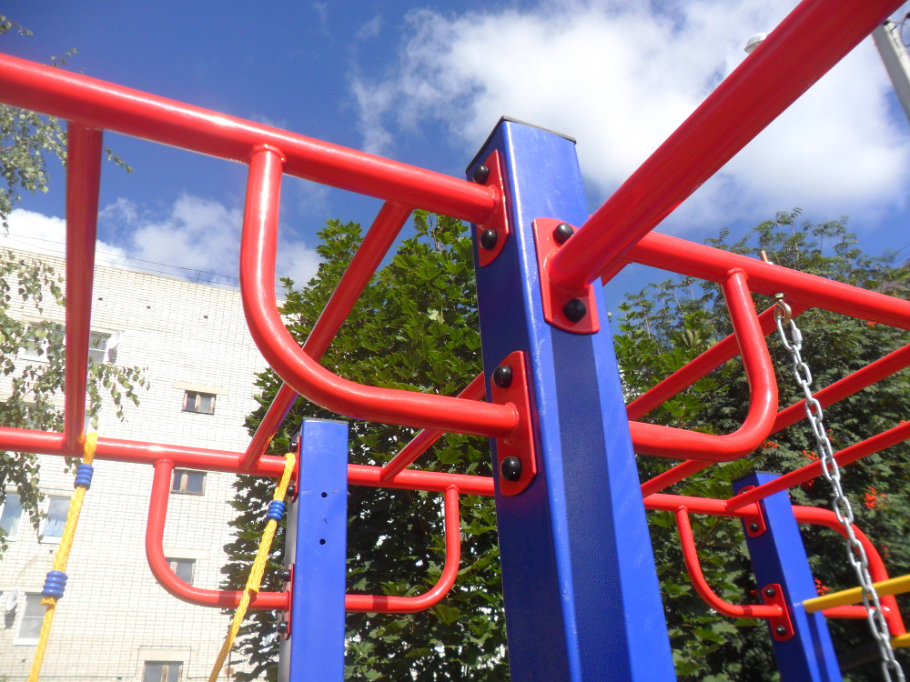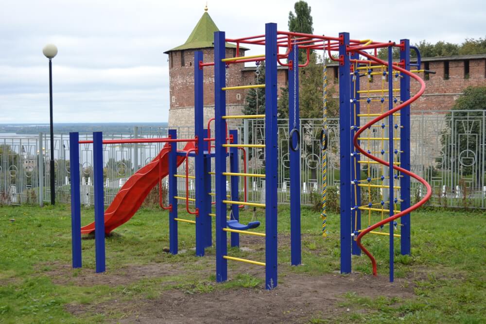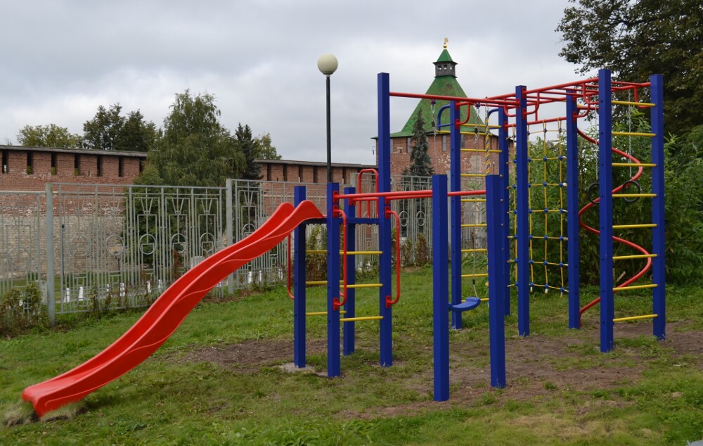 - Канат, кольца, качели пластиковые на веревочном подвесе, сетка для лазания, горка пластик.