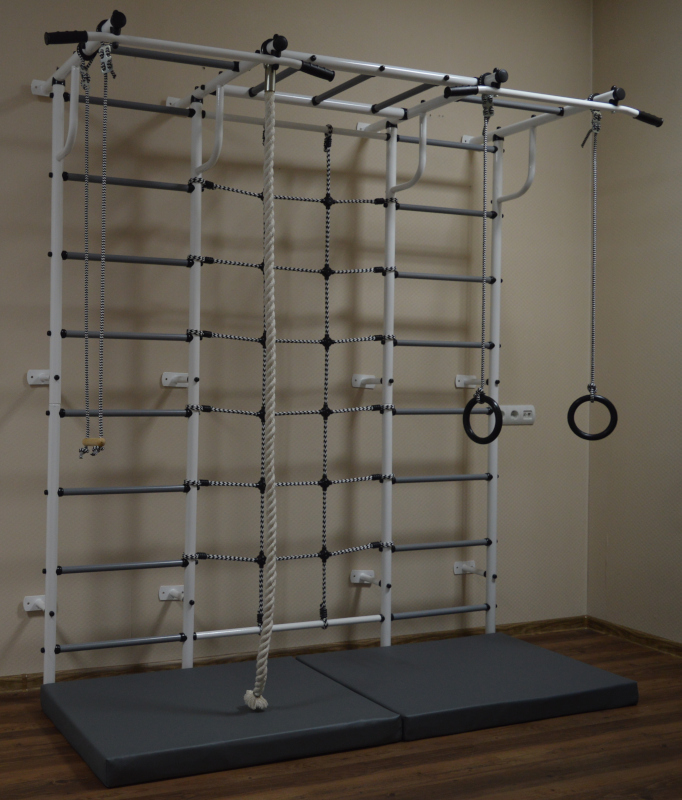 Канат, трапеция, кольца гимнастические, сетка для лазания или комбинированная трехрядная лестница.