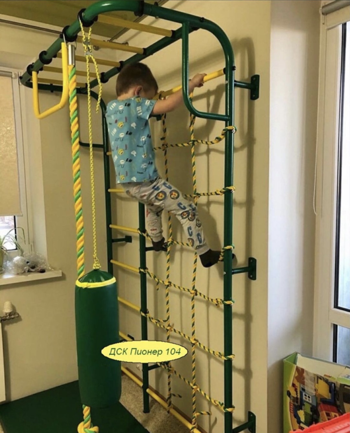 Комплектация Макси: канат, трапеция, кольца гимнастические, сетка для лазания, мат с чехлом из кожзама 1,6х0,66м, груша боксерская, тарзанка.