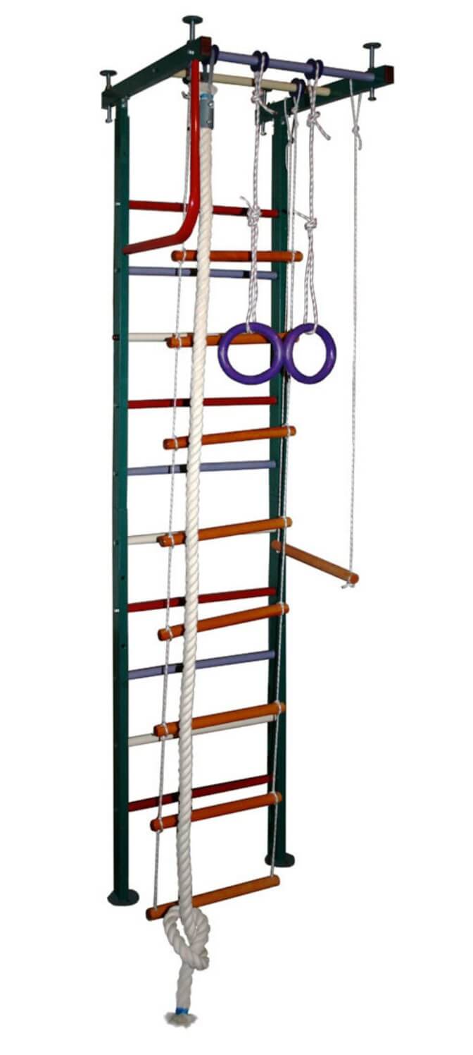 Комплектация: металлическая шведская стенка, "Г"-образный турник, канат, кольца гимнастические, трапеция