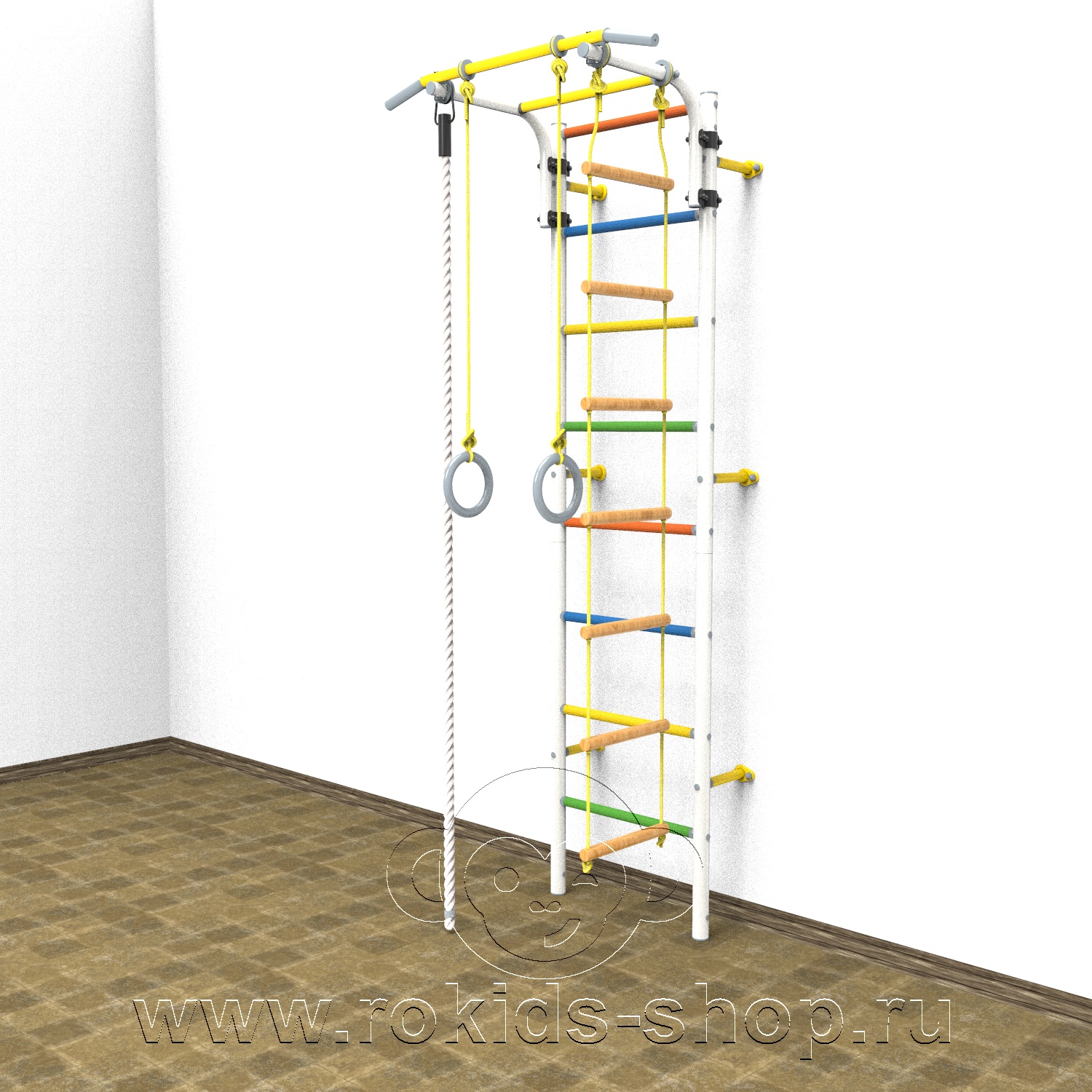 Детский спортивный комплекс «Атлет-2Ц», ПВХ, цветные ступени, цвет белый .Каркас комплекса изготовлен из трубы диаметром 42 мм с порошковой покраской. Ступеньки изготовлены из трубы 25 мм, имеют массажное и противоскользящее ПВХ покрытие.