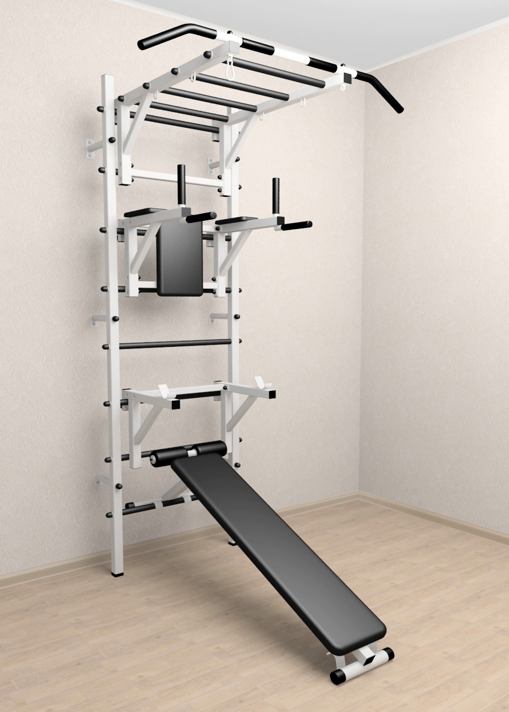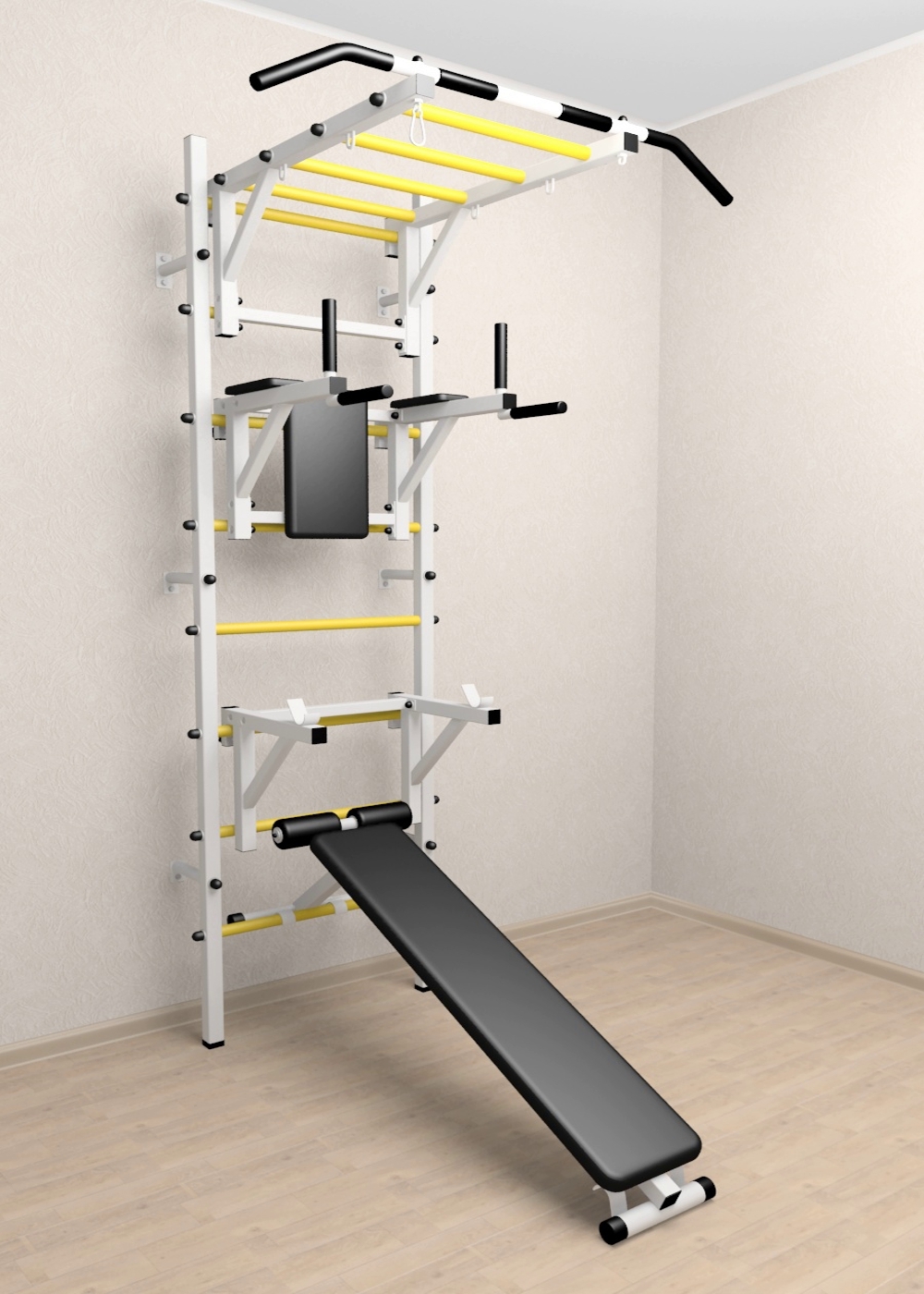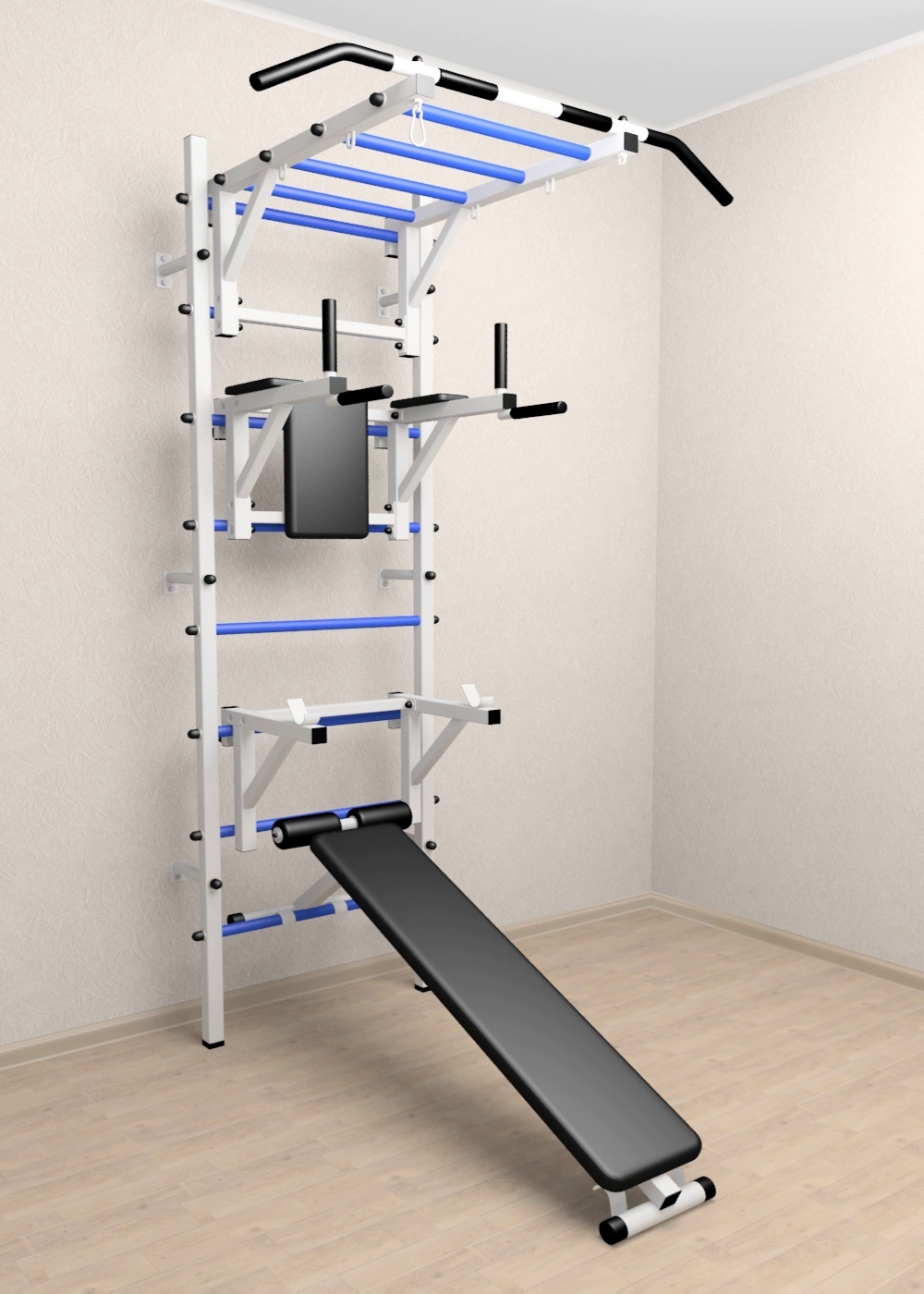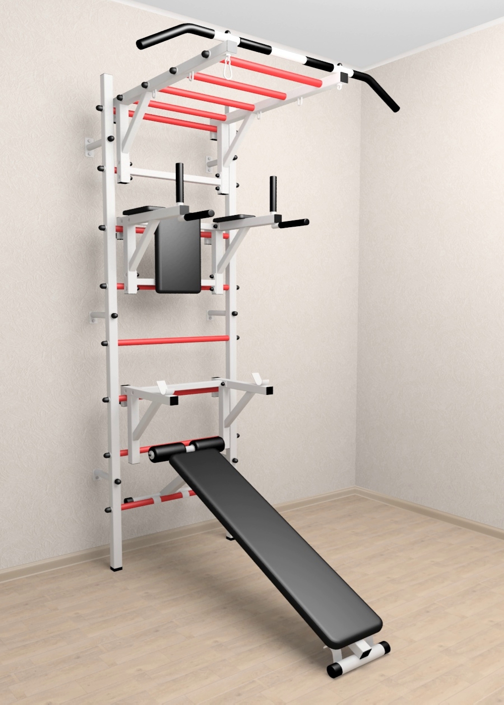 Стойки шведской стенки Sv Sport стандарт изготовлены из профильной трубы 40 х 40 х 2 мм. Ступени изготовлены из круглой, стальной трубы, покрытой резиной (не скользят, не натирают мозоли, не прокручиваются, не имеют запаха, приятны на ощупь). Устанавливается к стене при помощи 6 кронштейнов. На перекладину, в местах хватов, одеты резиновые ручки.