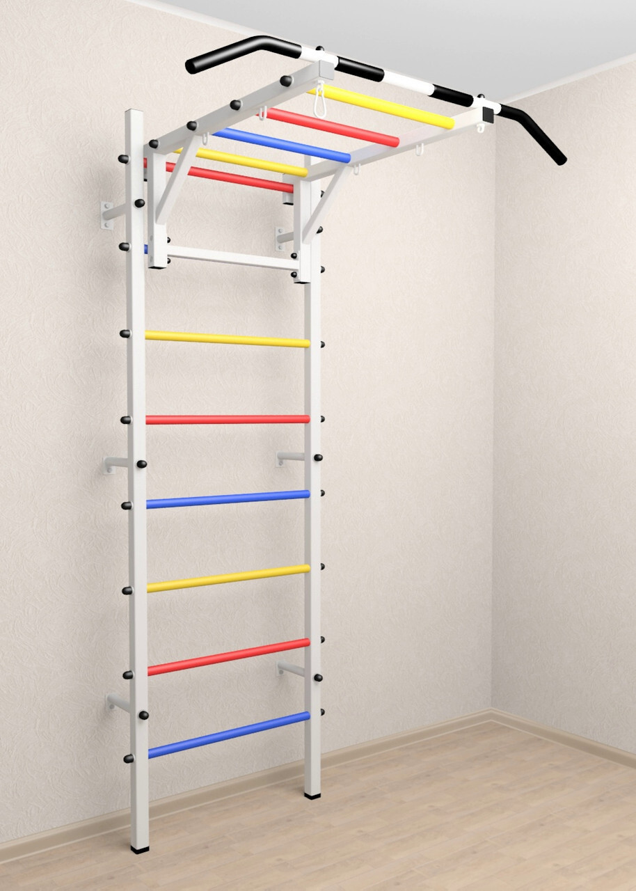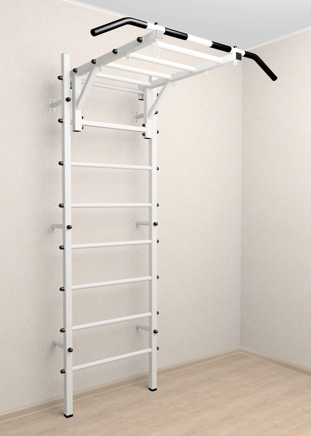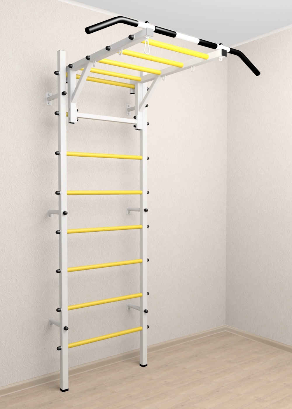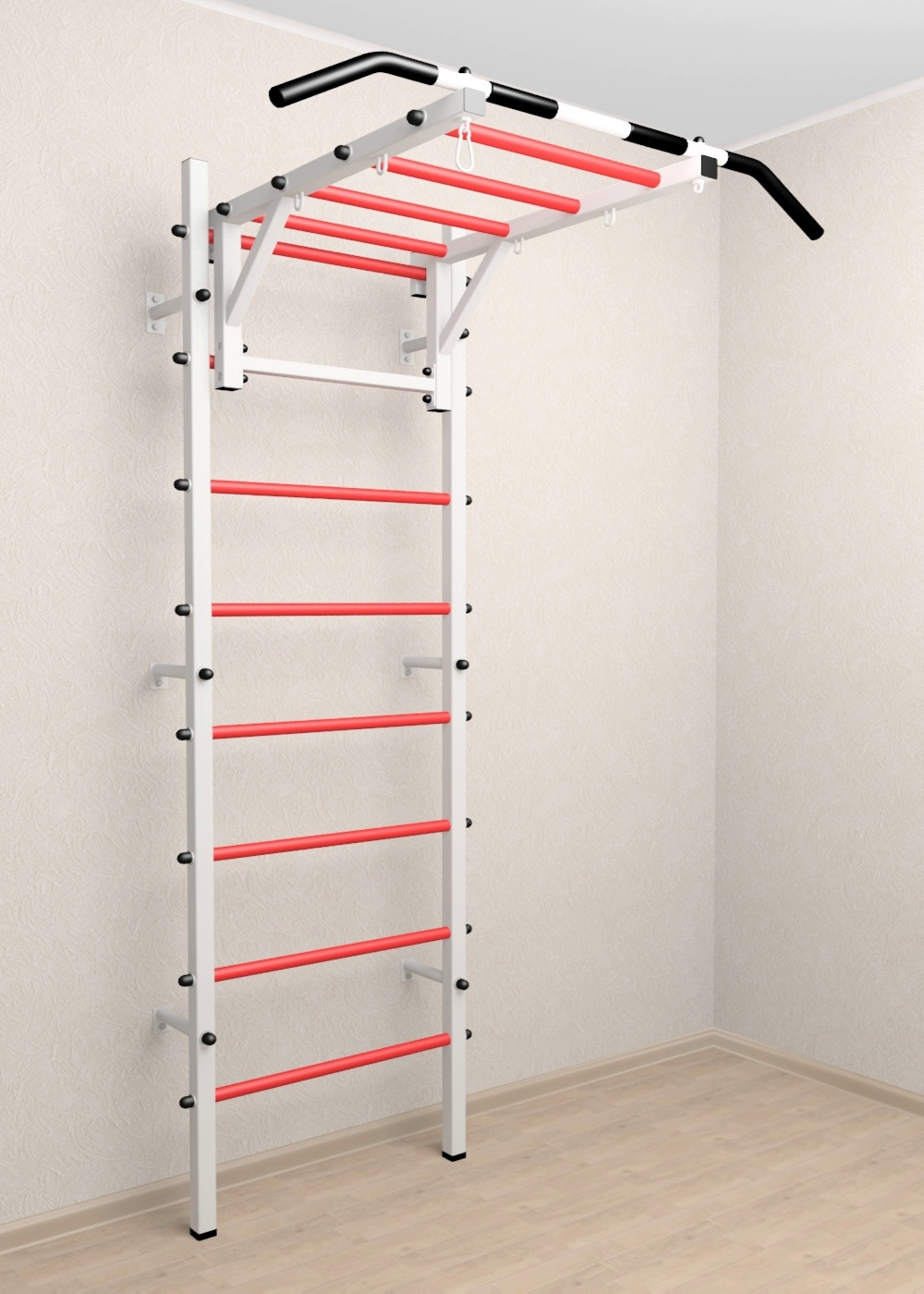 Стойки шведской стенки Sv Sport усиленные изготовлены из профильной трубы 60 х 40 х 2 мм. Ступени изготовлены из круглой, стальной трубы, покрытой резиной (не скользят, не натирают мозоли, не прокручиваются, не имеют запаха, приятны на ощупь). Устанавливается к стене при помощи 6 кронштейнов. На перекладину, в местах хватов, одеты резиновые ручки.