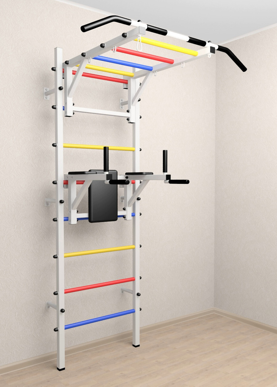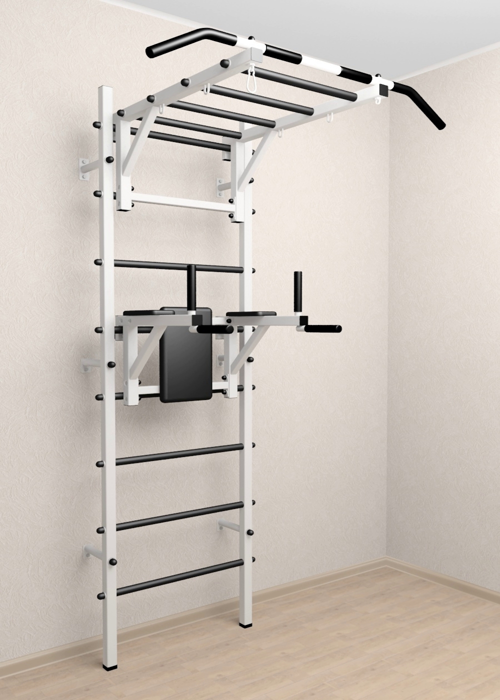 Стойки шведской стенки Sv Sport усиленные изготовлены из профильной трубы 60 х 40 х 2 мм. Ступени изготовлены из круглой, стальной трубы, покрытой резиной (не скользят, не натирают мозоли, не прокручиваются, не имеют запаха, приятны на ощупь). Устанавливается к стене при помощи 6 кронштейнов. На перекладину, в местах хватов, одеты резиновые ручки.