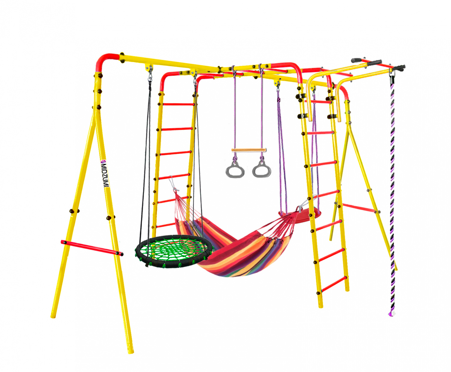 Торговый Дом Midzumi представляет новинку Уличный Детский спортивный комплекс Midzumi Chikara Akarui Large L в новом цветовом решении - солнечный день. Этот спортивный комплекс показывает разнообразие модельного ряда продукции Midzumi. Прочная металлическая конструкция позволяет выдерживать до 100 кг. Крепление Комплекса осуществляется с помощью бетонирования. Midzumi Chikara Akarui Large L состоит из каркаса двух металлических лестниц с рукоходом, передвижного турника, двух разных навесных пластиковых качелей, подвесного гамака, каната и колец с перекладиной.