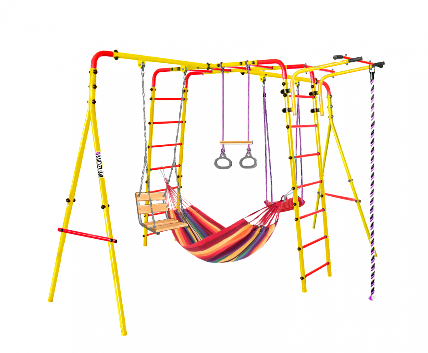 Торговый Дом Midzumi представляет новинку Уличный Детский спортивный комплекс Midzumi Chikara Akarui Universal в новом цветовом решении - солнечный день. Этот спортивный комплекс показывает разнообразие модельного ряда продукции Midzumi. Прочная металлическая конструкция позволяет выдерживать до 100 кг. Крепление Комплекса осуществляется с помощью бетонирования. Midzumi Chikara Akarui Universal состоит из каркаса двух металлических лестниц с рукоходом, передвижного турника, двух разных навесных качелей, подвесного гамака, каната и колец с перекладиной.