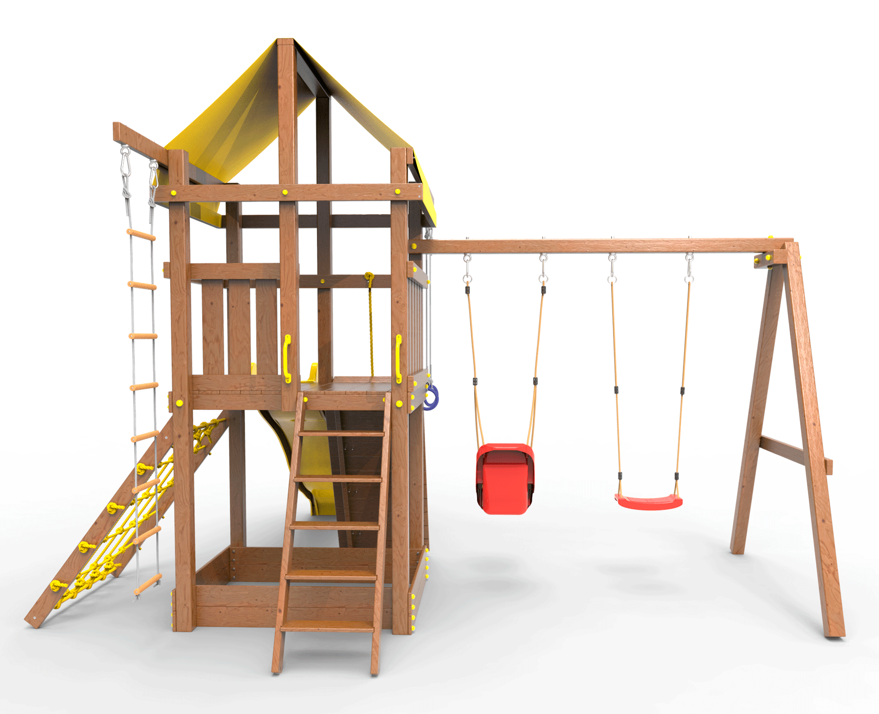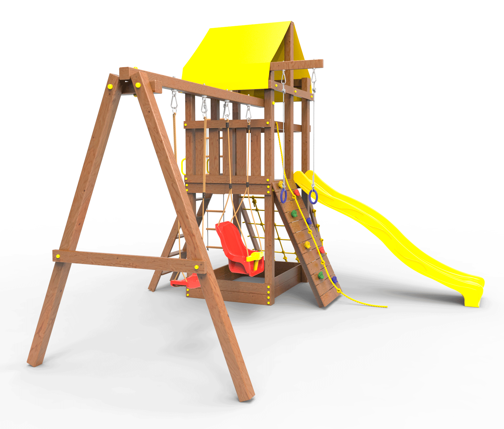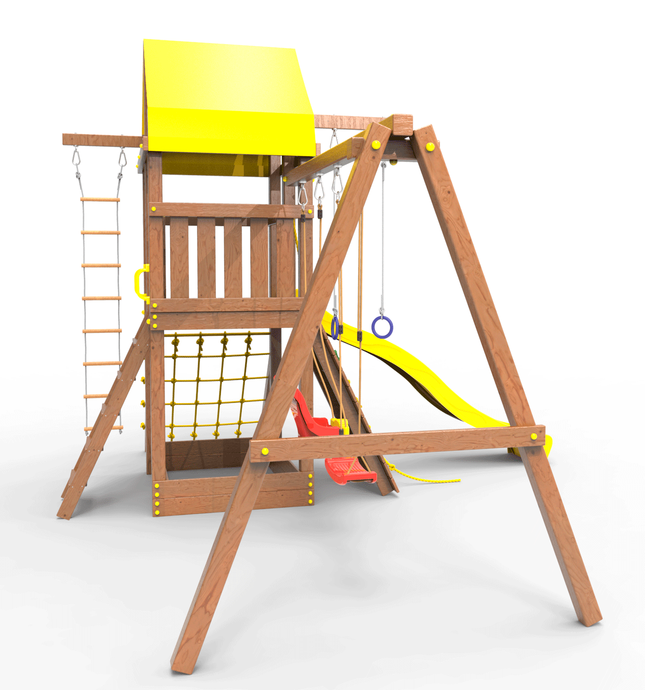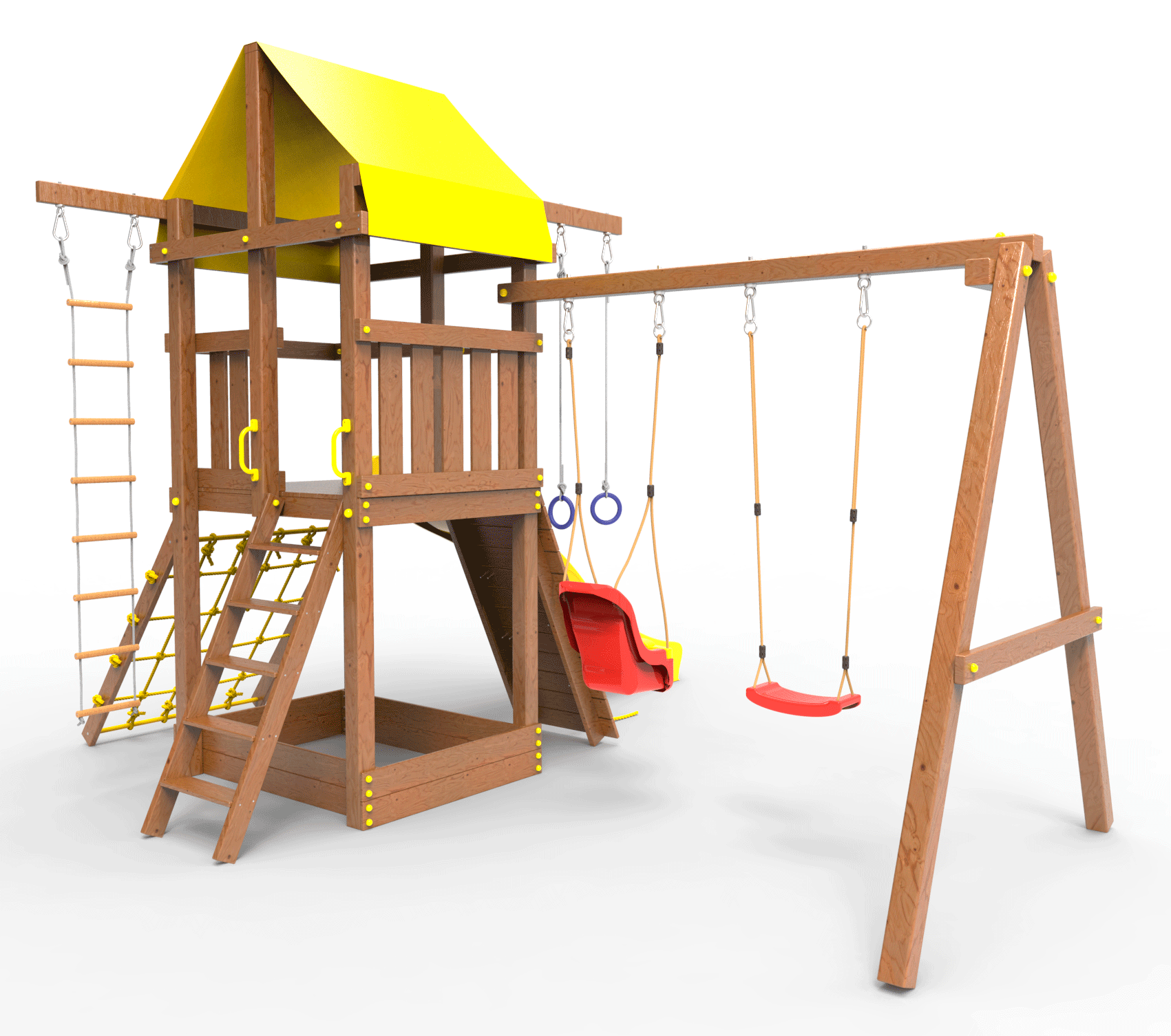 Все столбы и качельная балка площадки выполнена из высокопрочного клеёного бруса камерной сушки сечением 90х90мм.