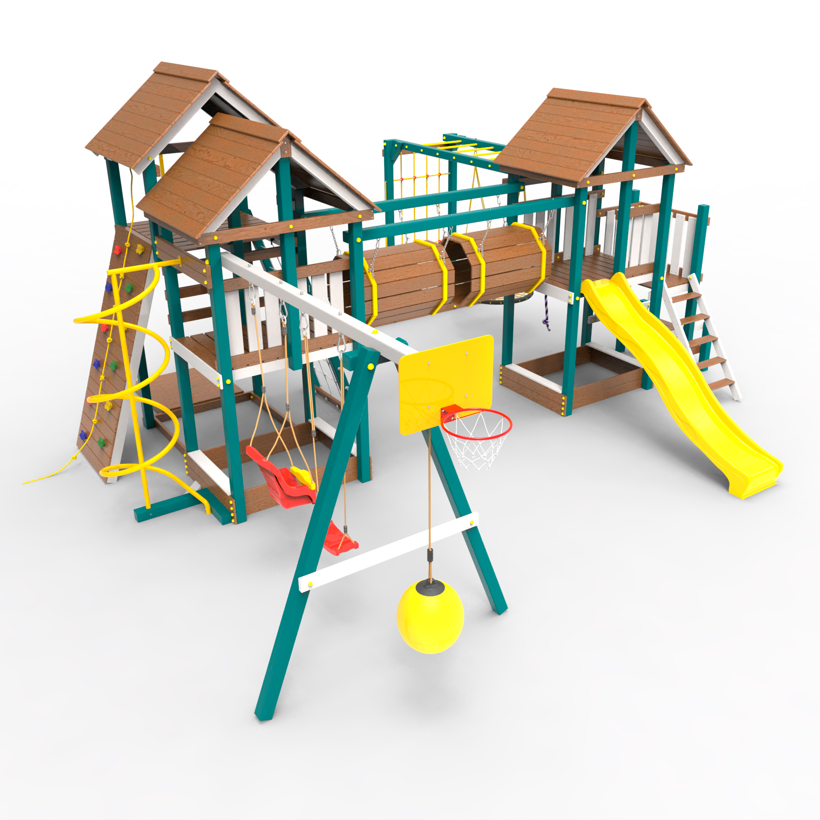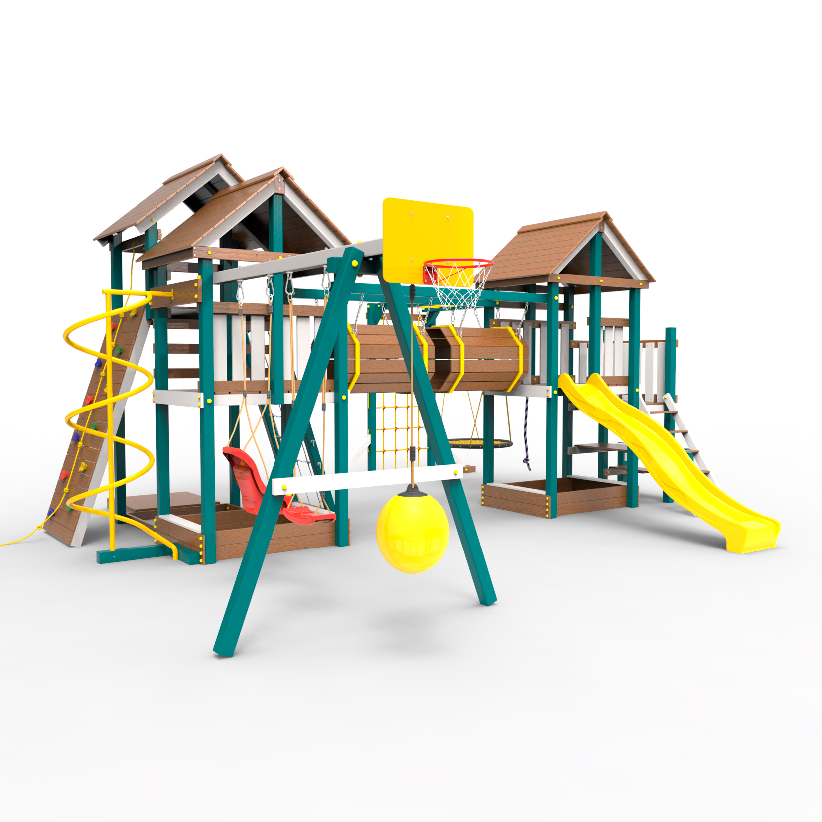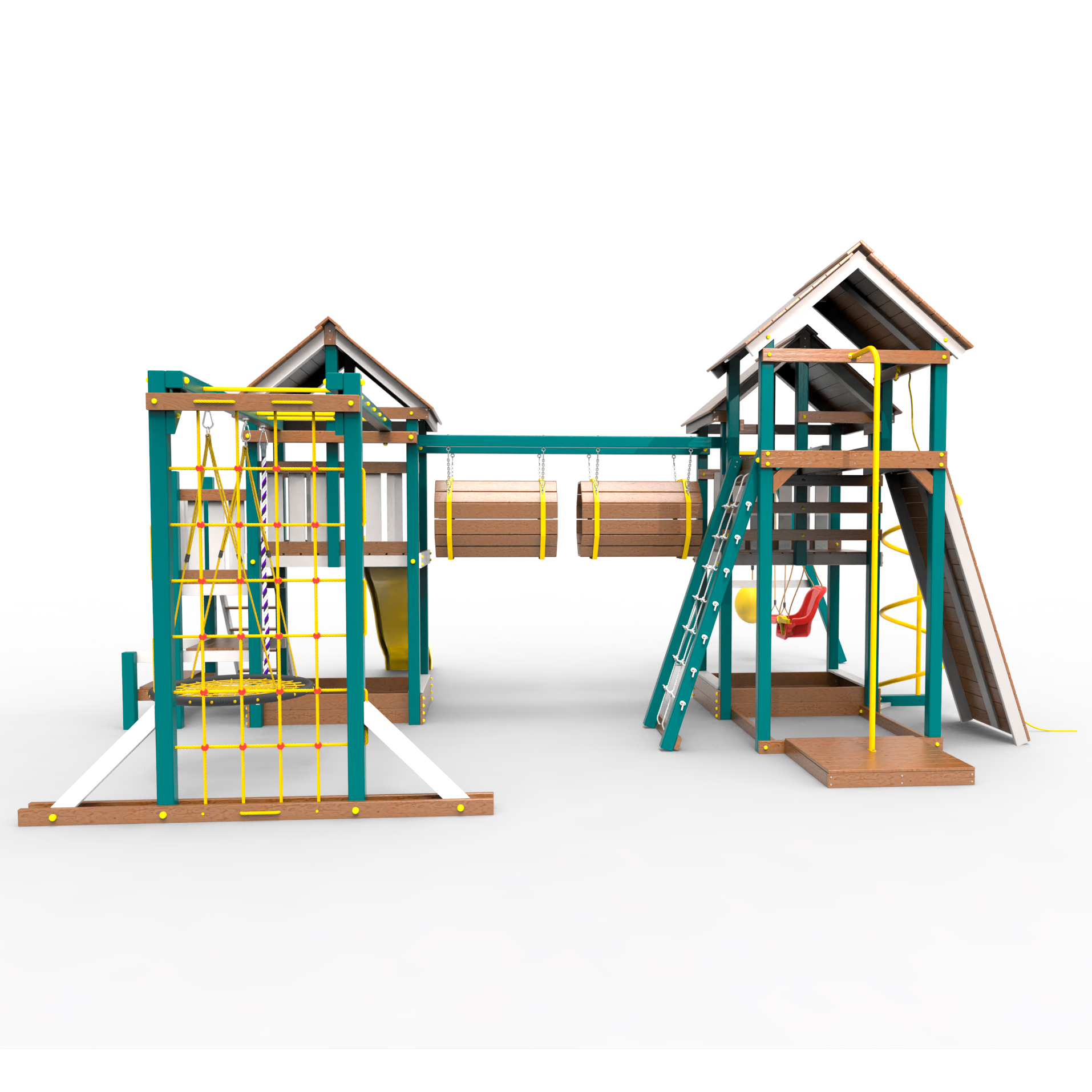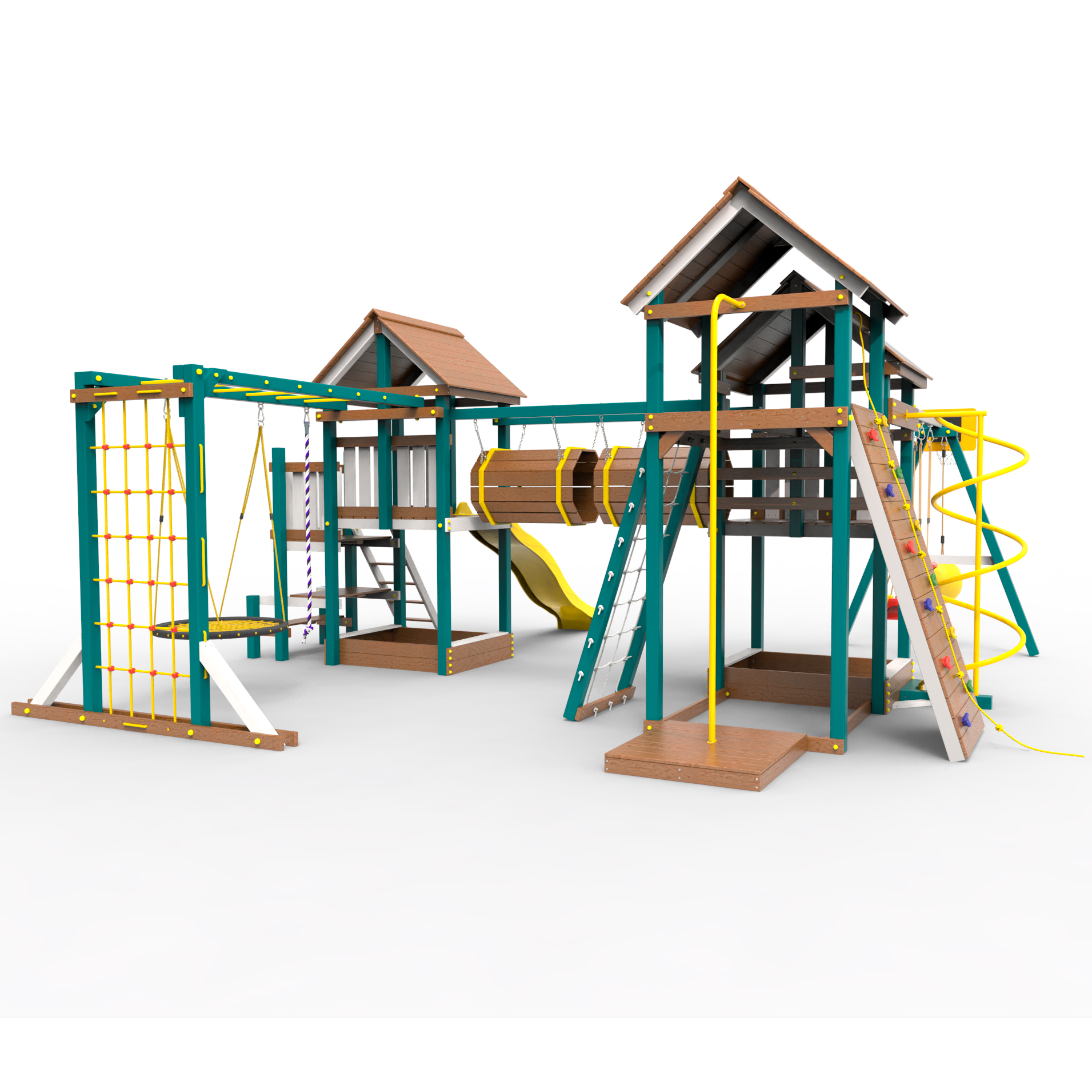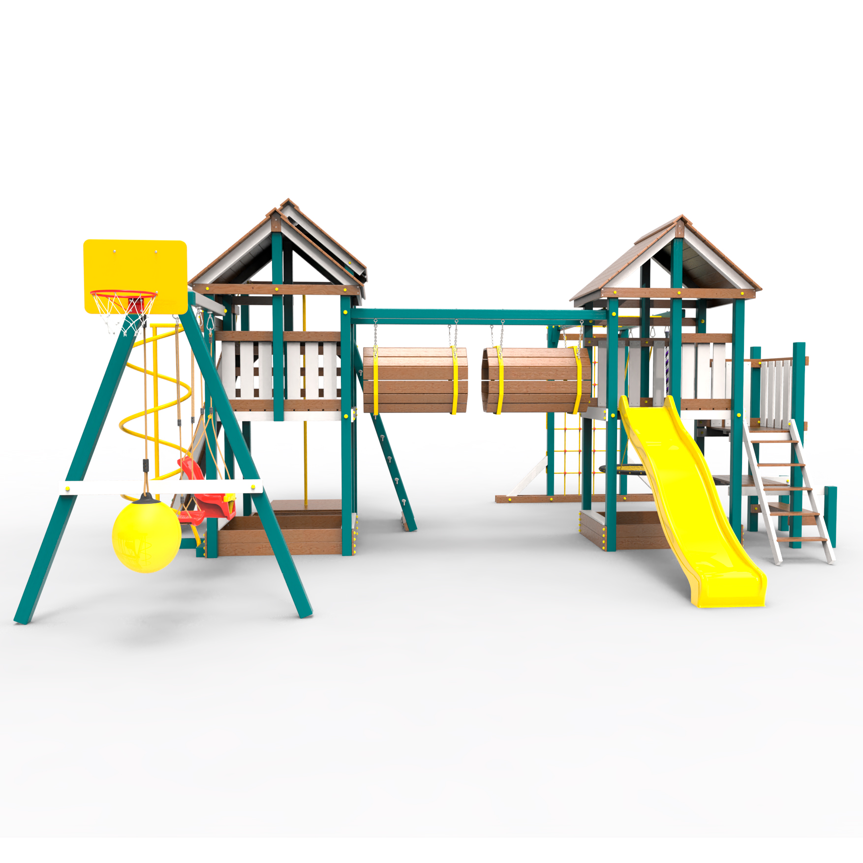 Два домика|Песочница|Лестница|Шторм-трап|Скалодром|Рукоход|Шведская стенка|Турник|Руфер|Баскетбольная корзина|Мостик|Горка|Спираль|Волна|Сеть для лазания|Качели |