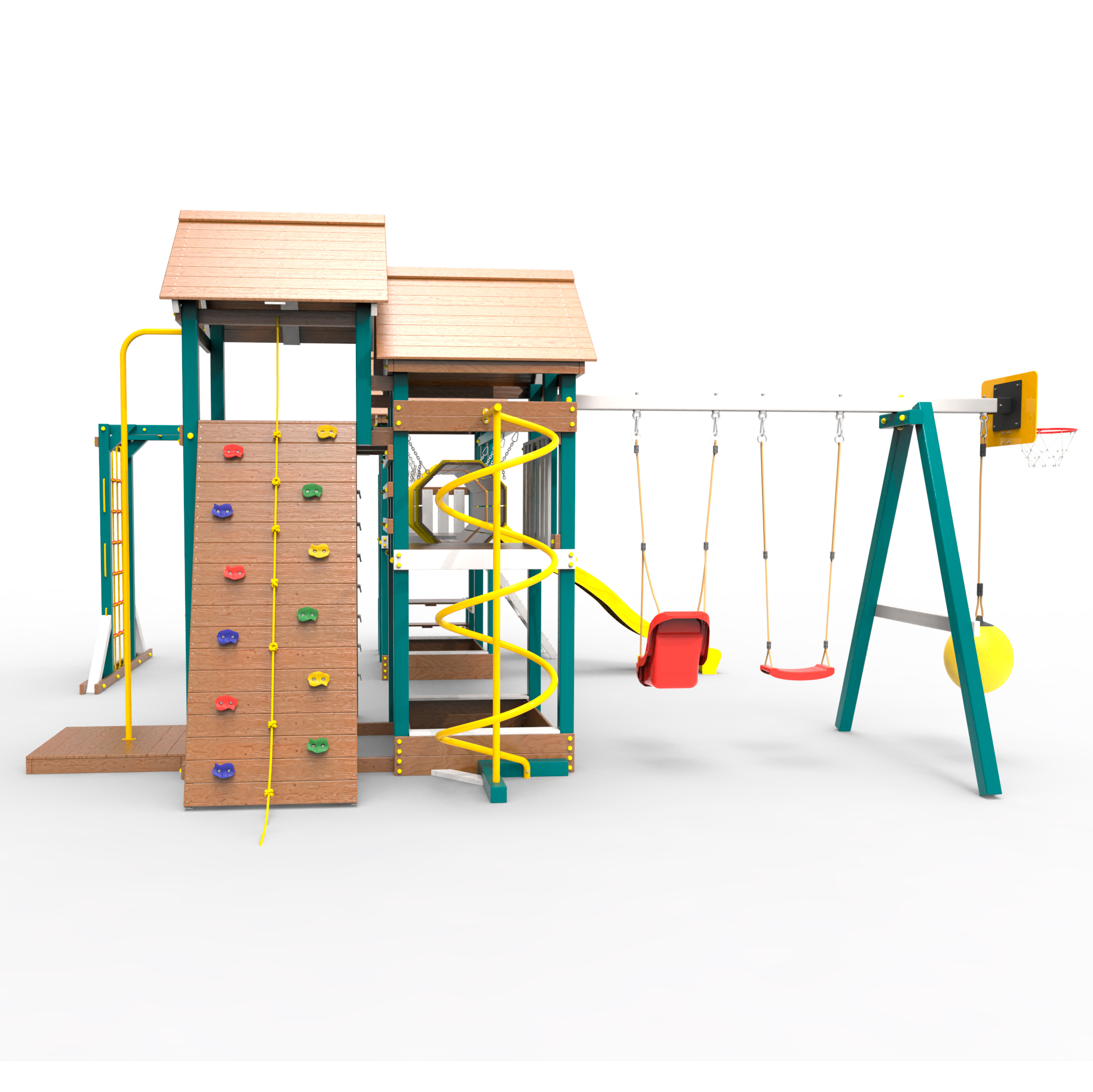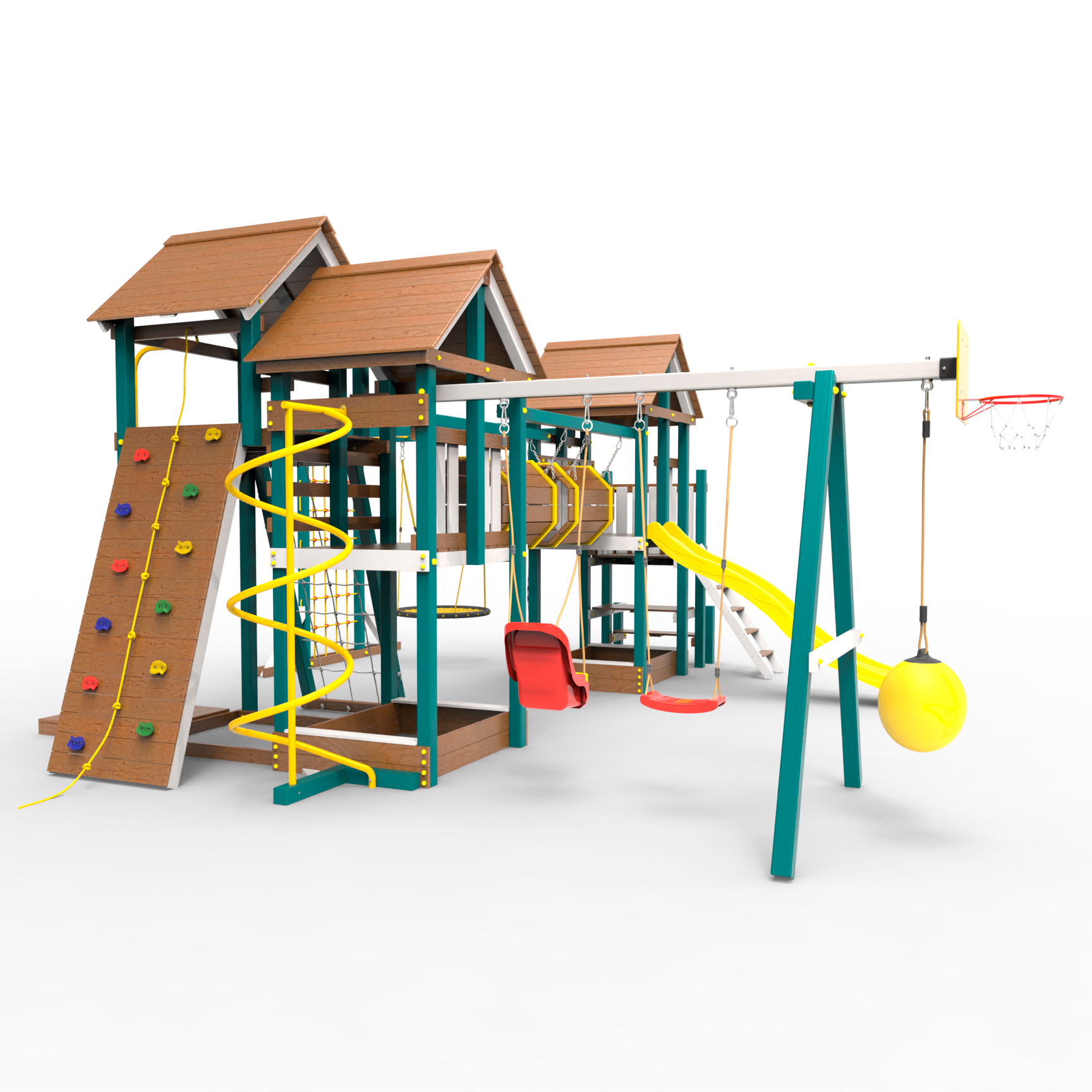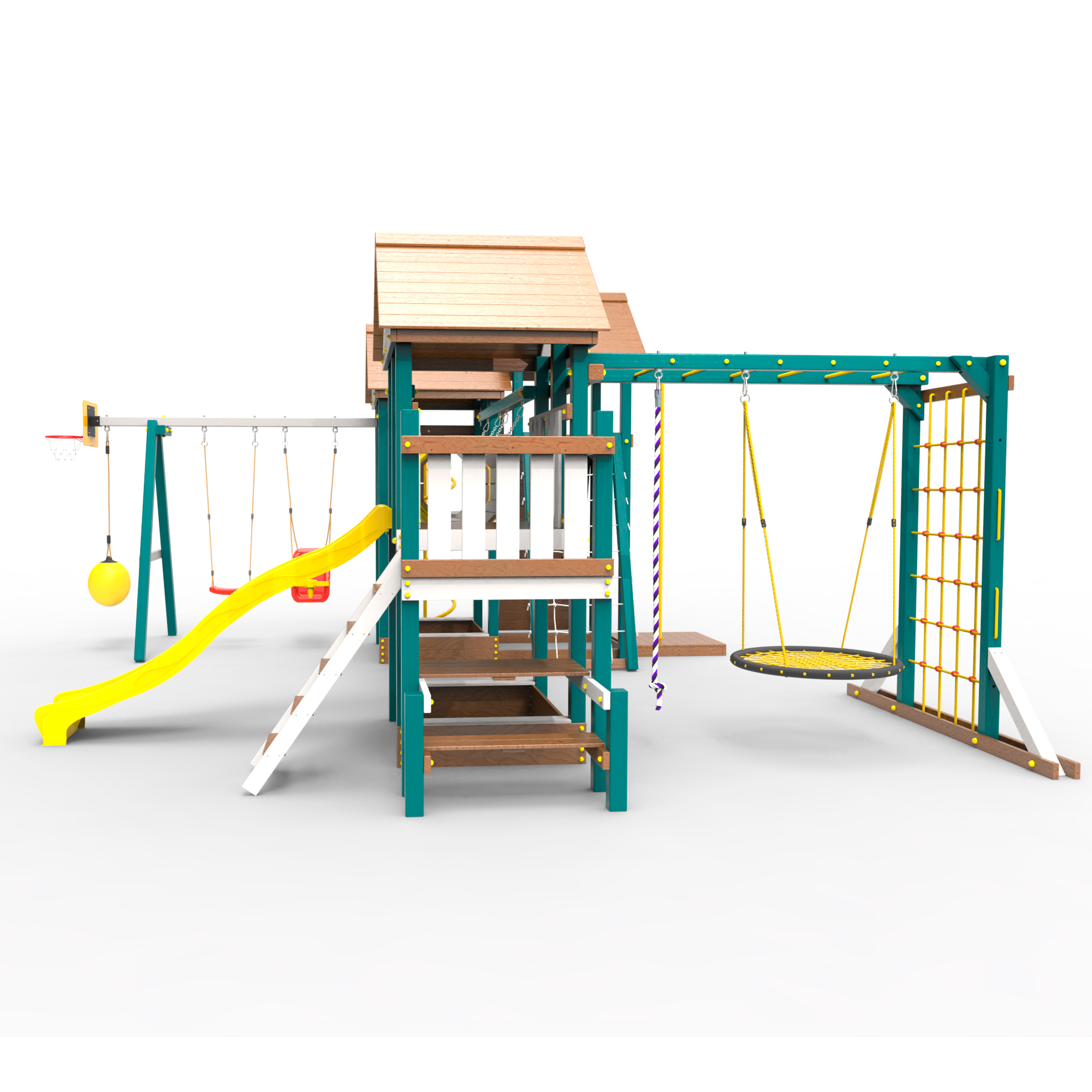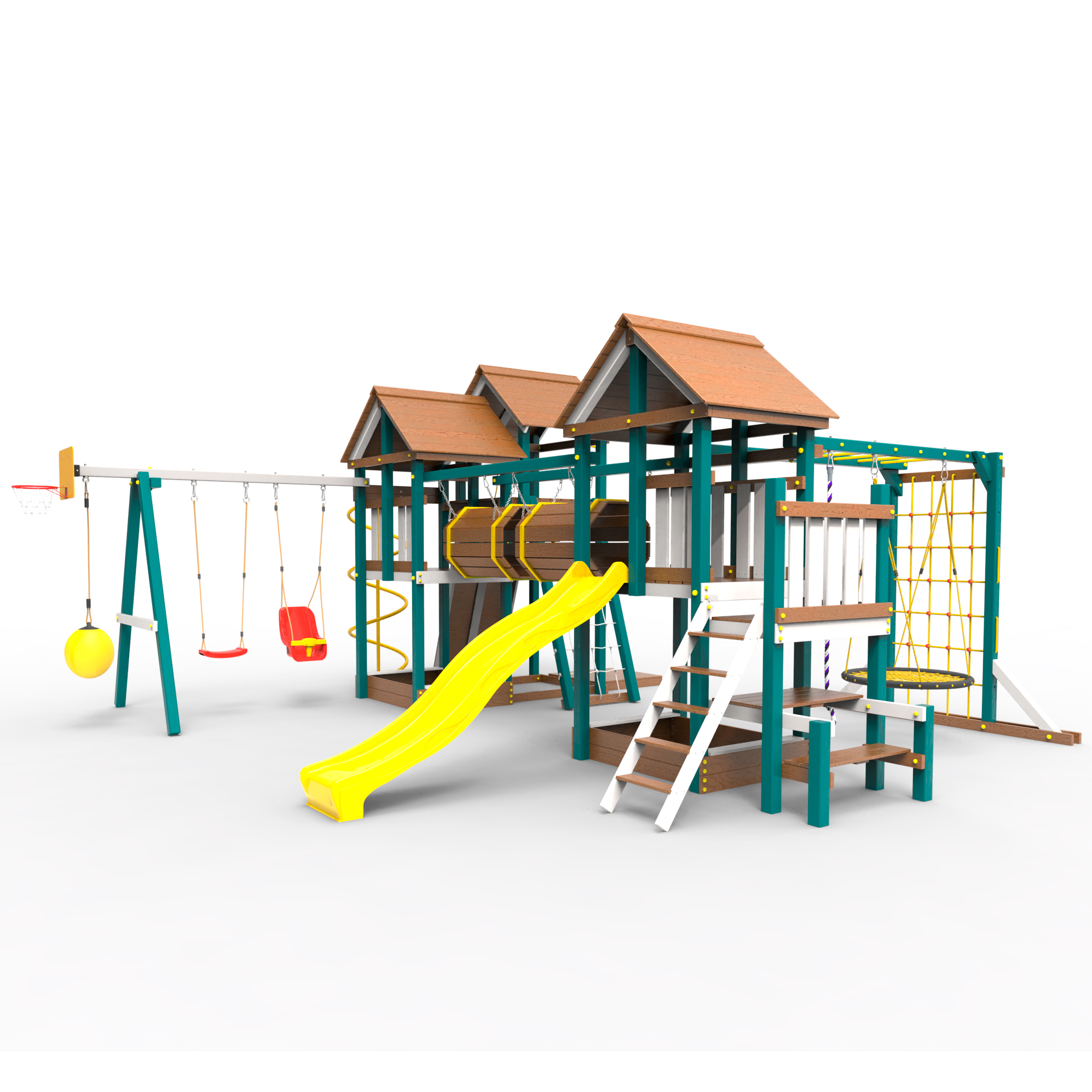 Два домика|Песочница|Лестница|Шторм-трап|Скалодром|Рукоход|Шведская стенка|Турник|Руфер|Баскетбольная корзина|Мостик|Горка|Спираль|Волна|Сеть для лазания|Качели |