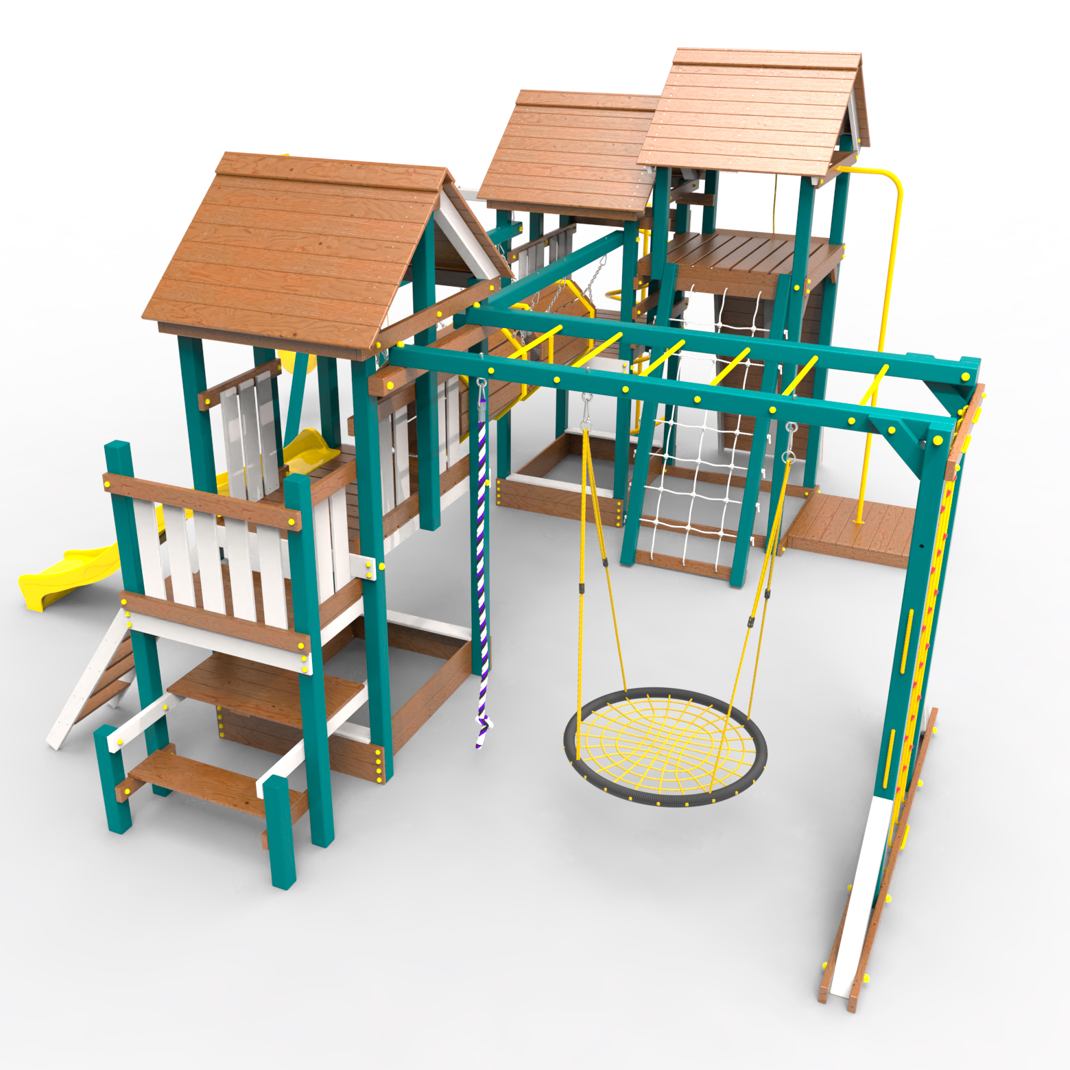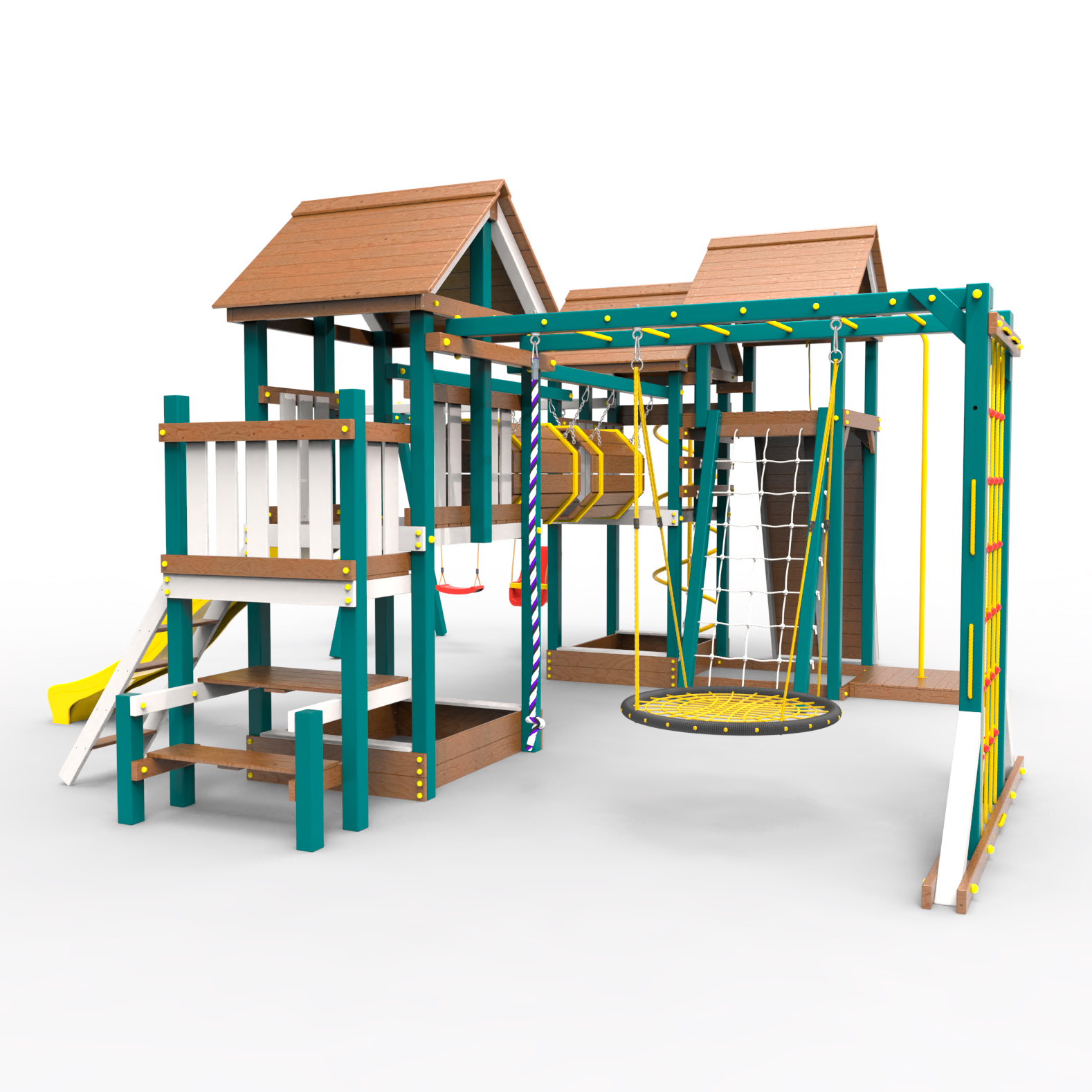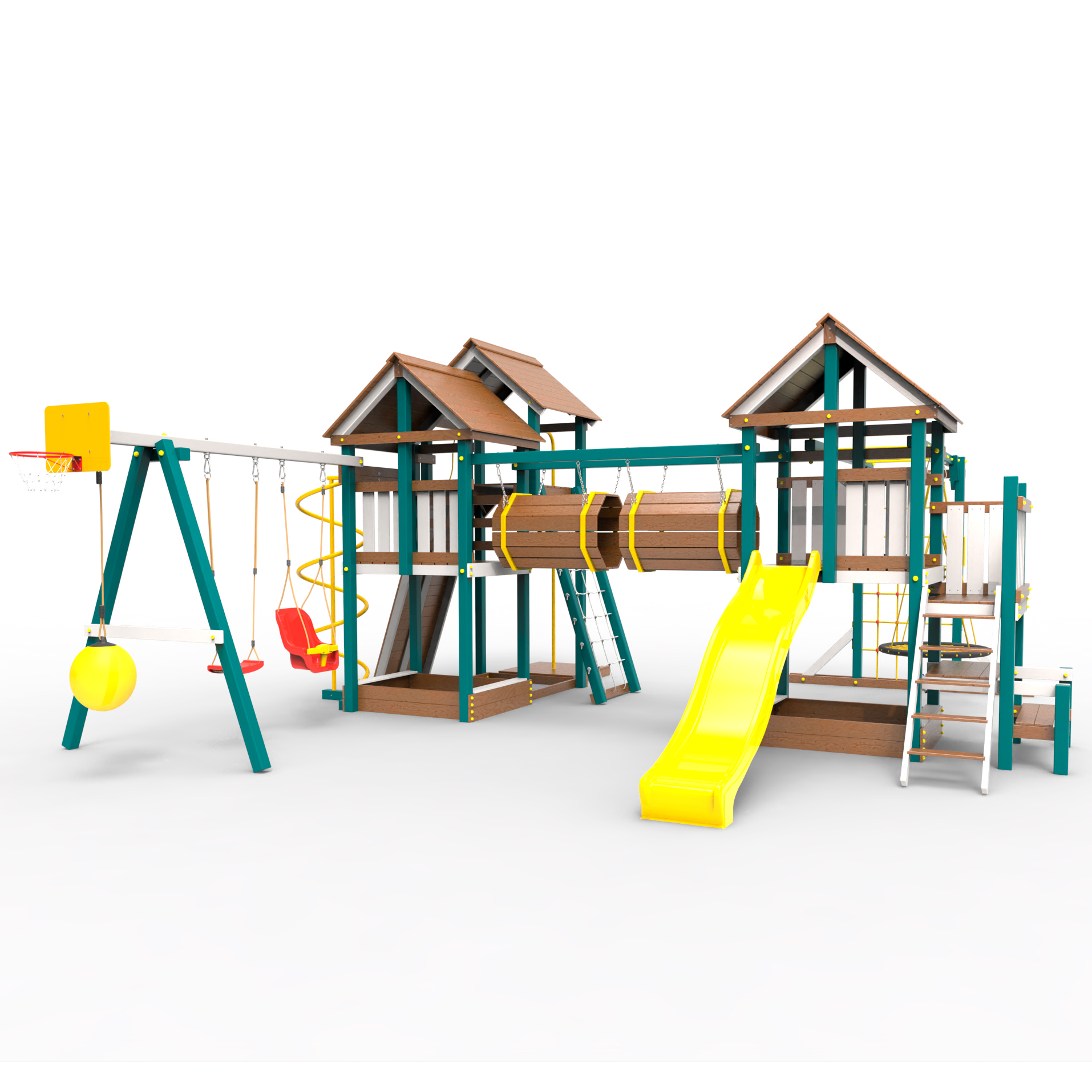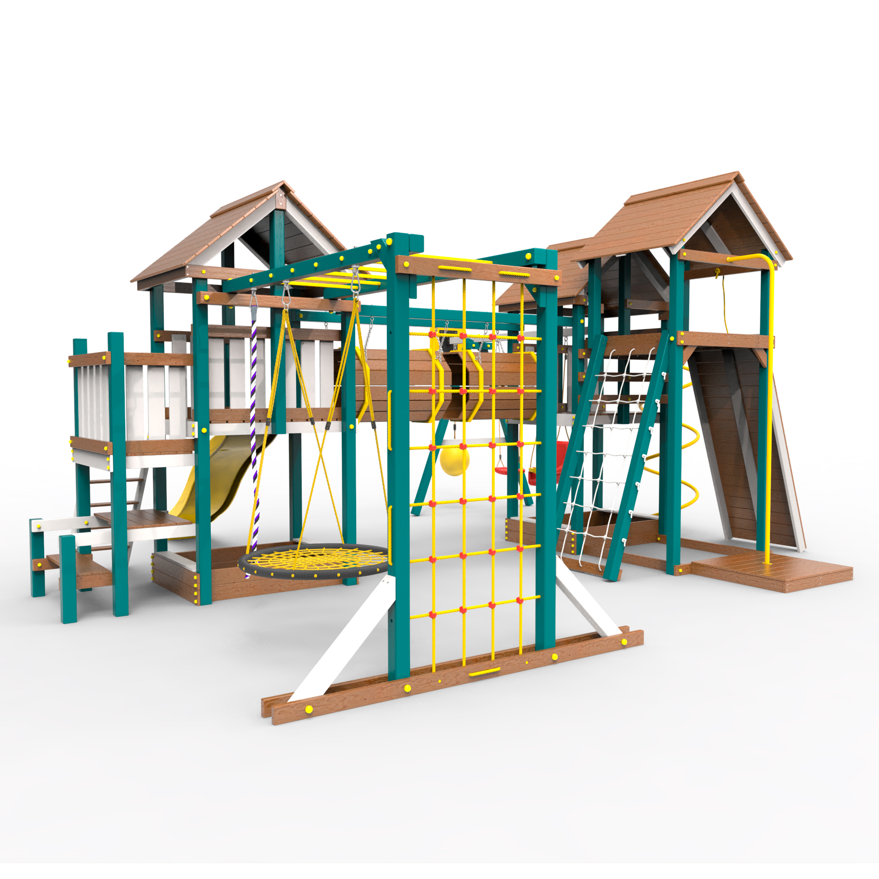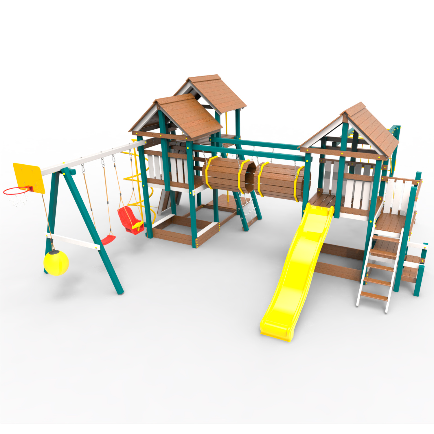 Два домика|Песочница|Лестница|Шторм-трап|Скалодром|Рукоход|Шведская стенка|Турник|Руфер|Баскетбольная корзина|Мостик|Горка|Спираль|Волна|Сеть для лазания|Качели |