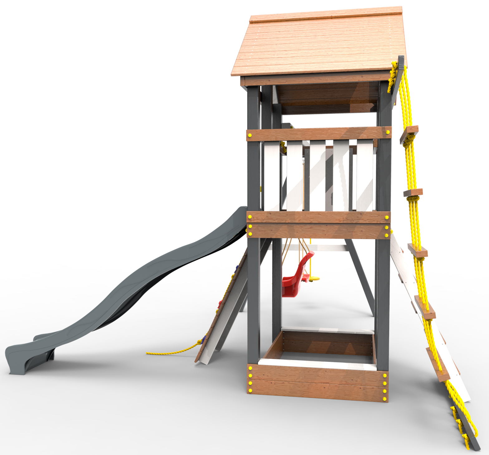 Детская площадка «Пикник Ультра 2.3 » является одной из вариантов комплектации флагманской модели "Ультра" и представляет собой двухуровневую конструкцию, на первом уровне которой расположена песочница, а второй этаж представляет собой игровое пространство под деревянной крышей.  Конструкция оснащена качельной балкой, повышенной прочности, которая имеет 5 креплений для качелей или любого другого навесного оборудования, шторм-трапом ,горкой и скалодромом! .