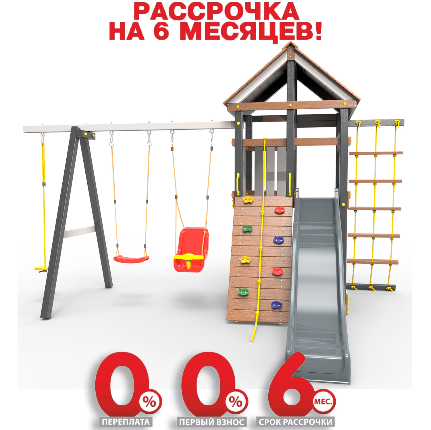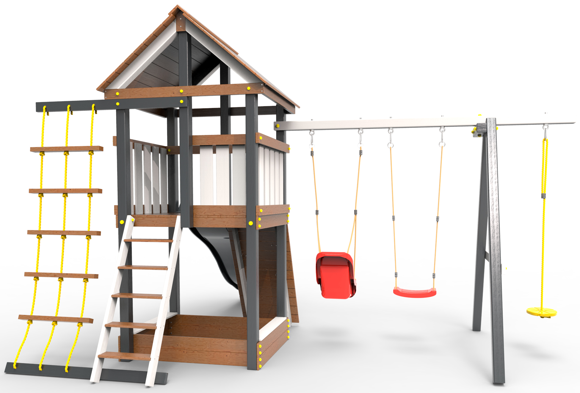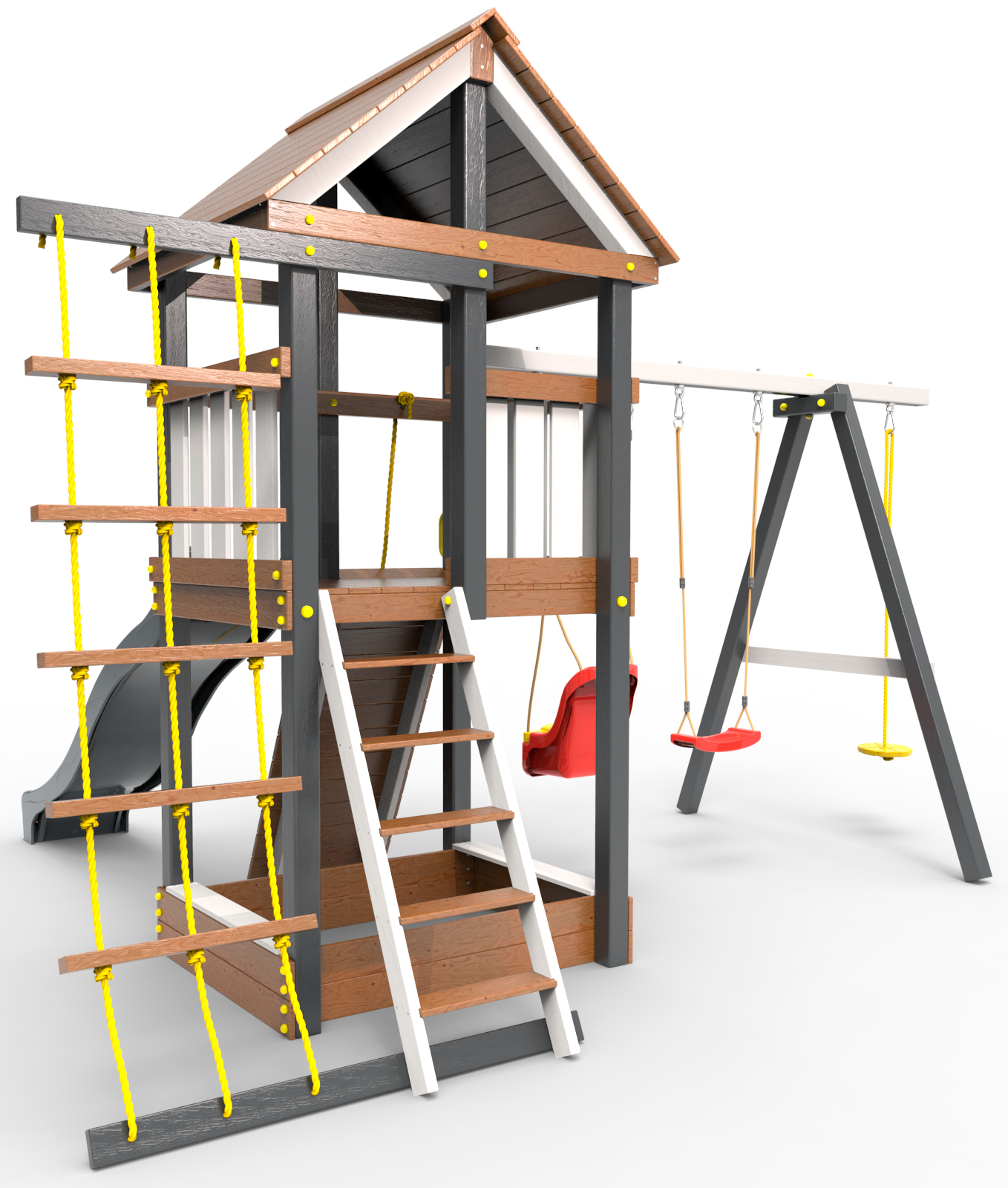 • Комплектация качели для малышей / качели долька / ручки (1 пара) / деревянная крыша / шторм трап (веревочная лестница) / тарзанка