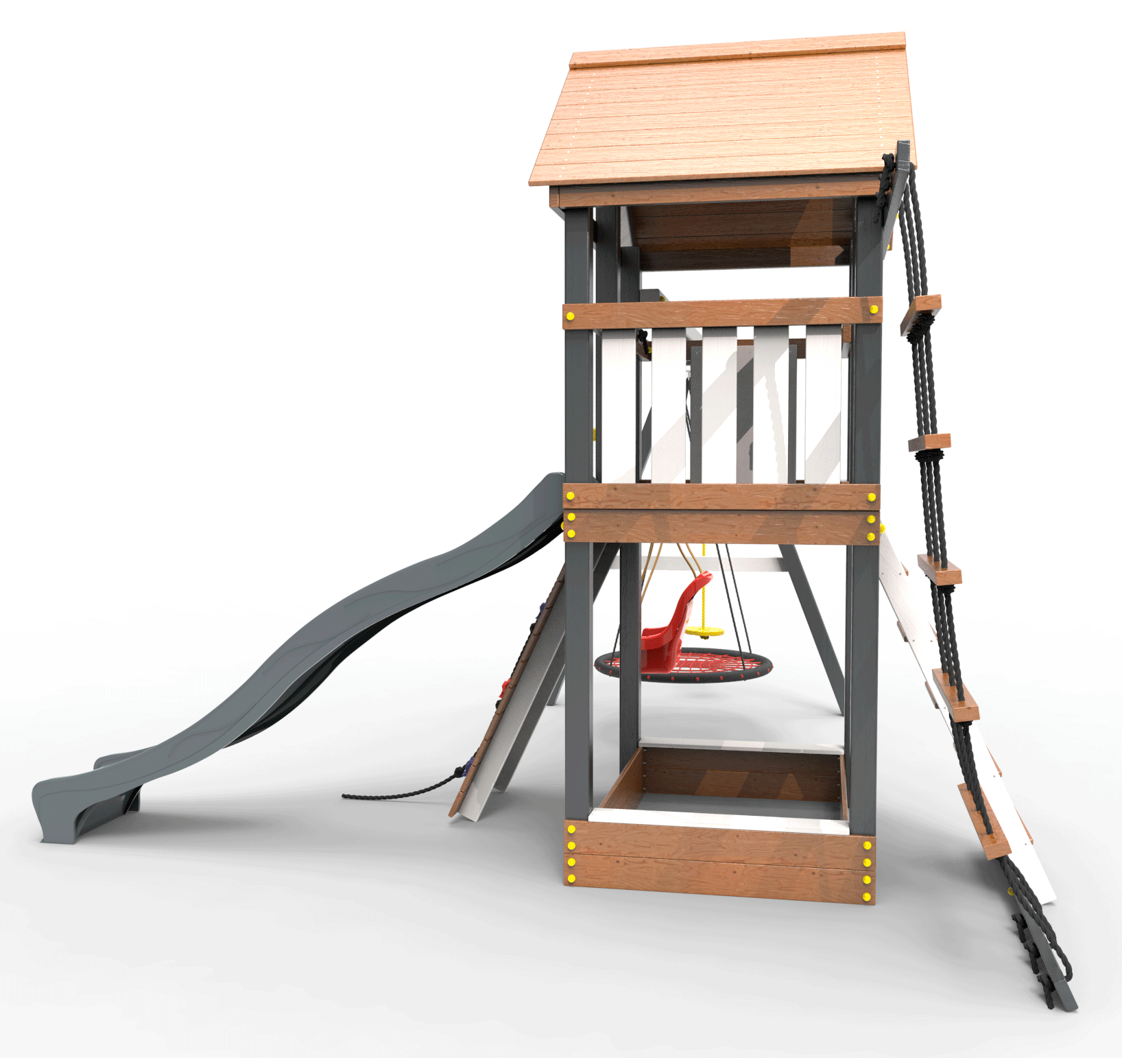 Детская площадка «Пикник Ультра 2.1 » является одной из вариантов комплектации флагманской модели "Ультра" и представляет собой двухуровневую конструкцию, на первом уровне которой расположена песочница, а второй этаж представляет собой игровое пространство под деревянной крышей.  Конструкция оснащена качельной балкой, повышенной прочности, которая имеет 5 креплений для качелей или любого другого навесного оборудования, шторм-трапом ,горкой и скалодромом! .