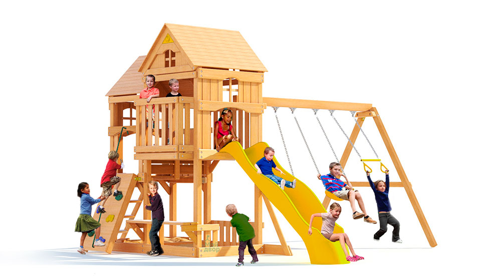 Cреднеразмерная игровая площадка с большим игровым фортом и балконом MoyDvor Панорама — настоящий «Хит продаж», который сочетает в себе доступную цену, оптимальный размер, солидный внешний вид и улучшенное качество материалов.