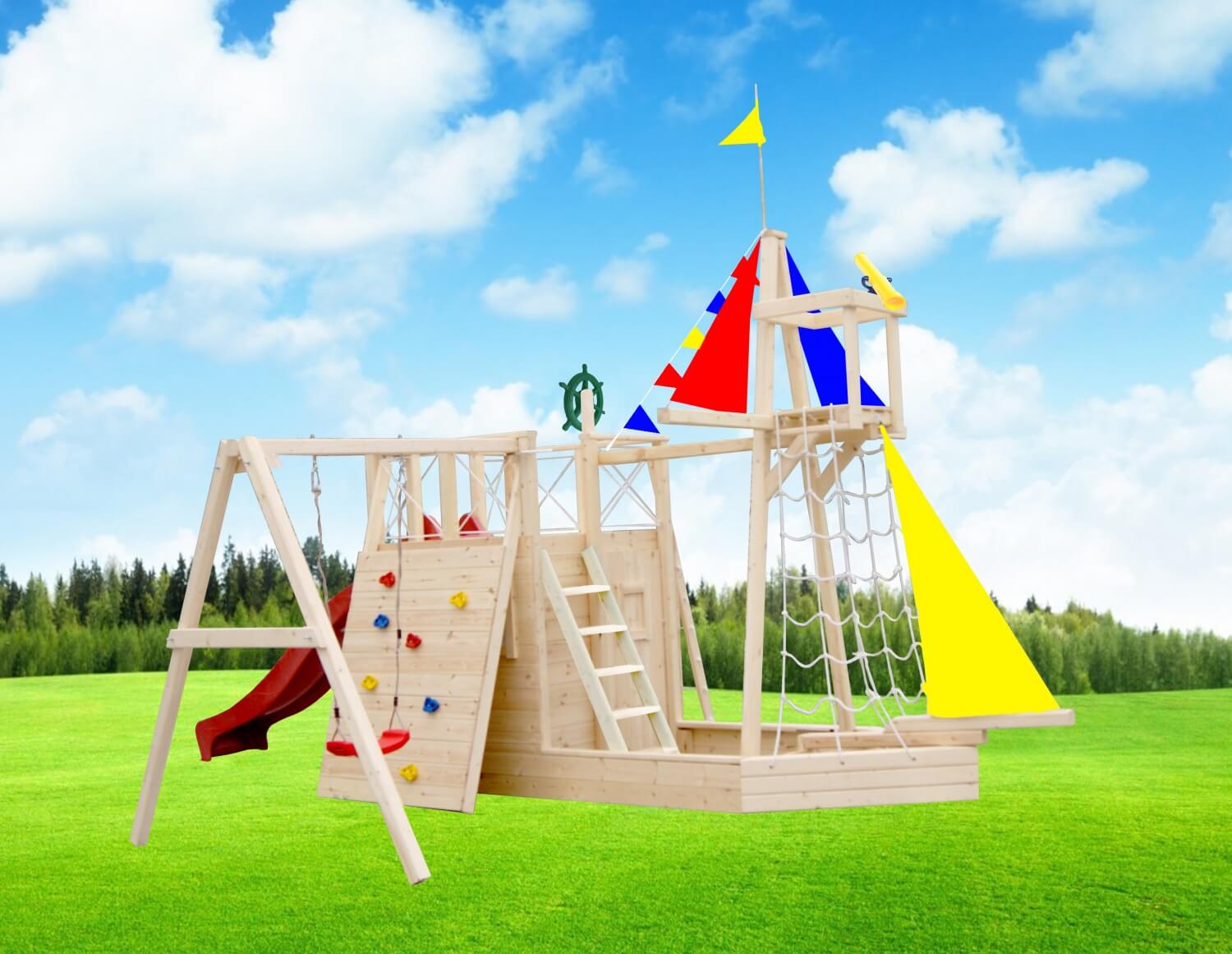 Большой корабль под настоящими парусами умчит вашего ребенка в мир его фантазий, где можно найти клад на островах, посетить невиданные страны, подружиться с необычными морскими обитателями. Такое чудо увлечет любого малыша! А благодаря тому, что в комплектацию «Корабля Океан» входят и классические элементы детских площадок: горка, качели, песочница, скалодром, сеть для лазания и домик – игры будут разнообразнее и полезнее.