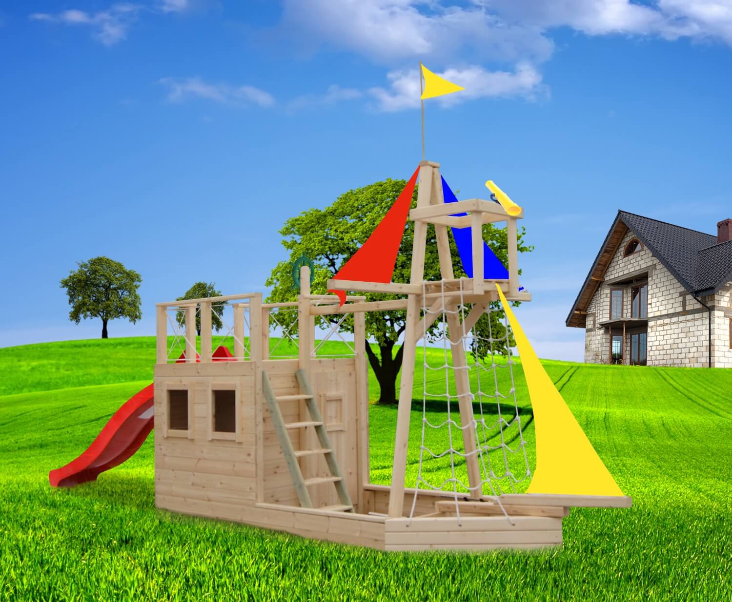 Только представьте корабль с парусами, наполняемыми ветром, с настоящей смотровой площадкой, штурвалом и уютной каютой - и все это в распоряжении вашего маленького путешественника. С такой площадкой малышу никогда не будет скучно, будь он пиратом, отважным капитаном или милой принцессой. Площадь корабля и его конструкция позволяет разыгрывать бесчисленное множество сценариев игр, а также Вы легко сможете дополнить детскую площадку спортивными и игровыми элементами, чтобы малышу стало еще веселее.