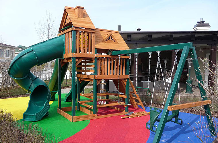 Детская площадка «Горец 2» представляет трехуровневую конструкцию. На первом этаже располагаются песочница и столик со скамейками. Второй представляет собой игровое пространство под крышей. Третий этаж – башня с пристроенными горкой-трубой и большой горкой. Особый колорит и индивидуальный стиль дачной площадке «Горец 2» придает крыша сложной конфигурации с имитацией слуховых окон и печной трубы.