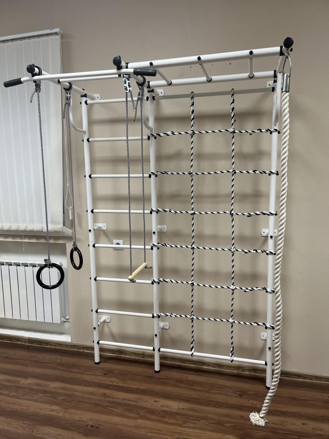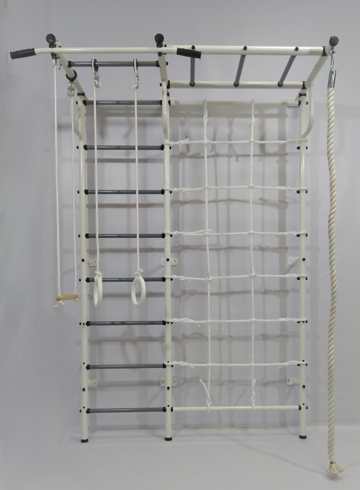 Канат, трапеция, кольца гимнастические, сетка для лазания с пластиковыми черепашками.