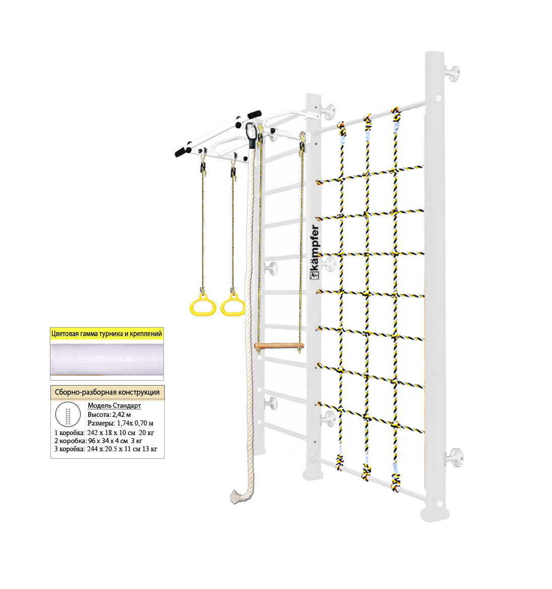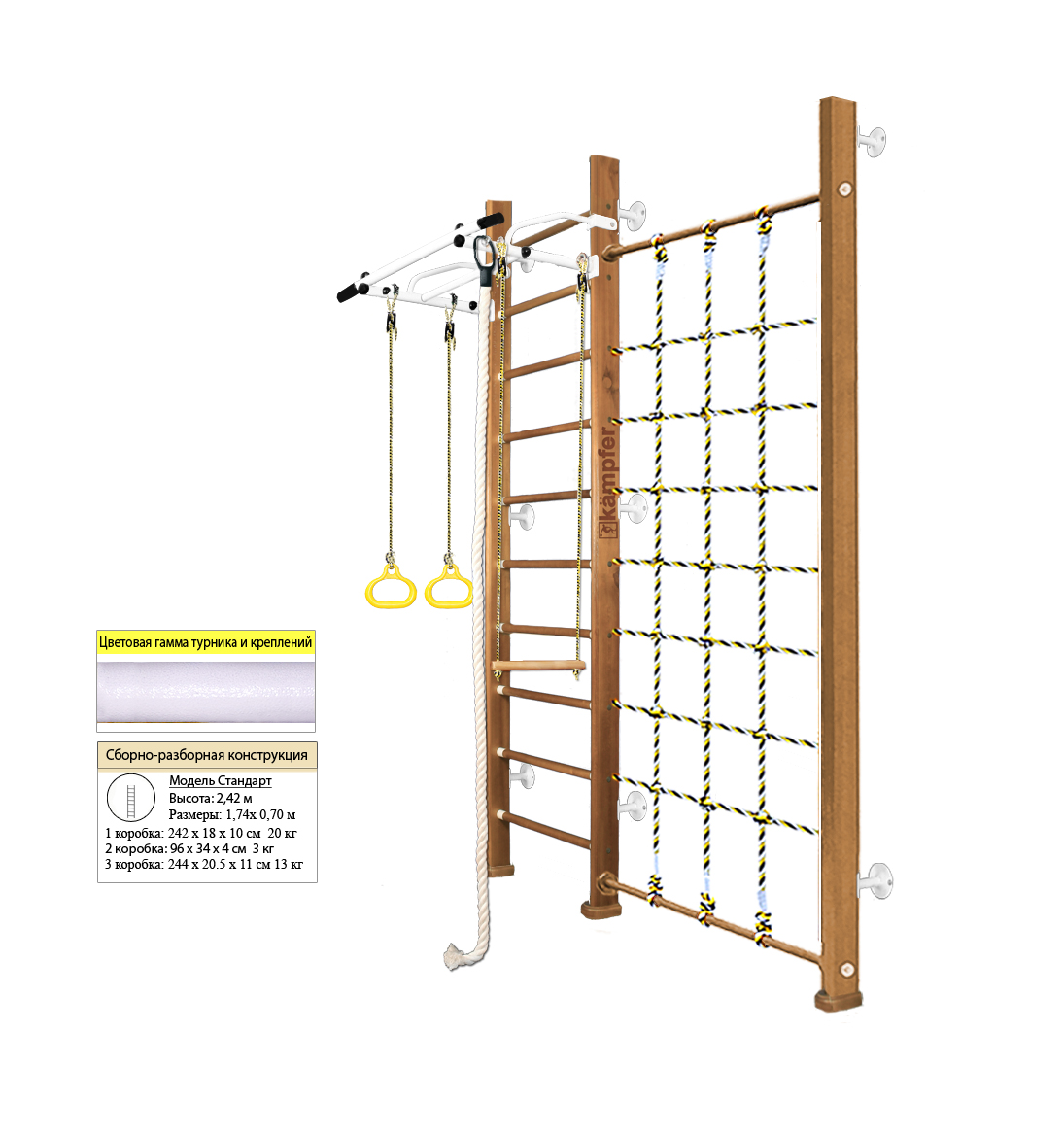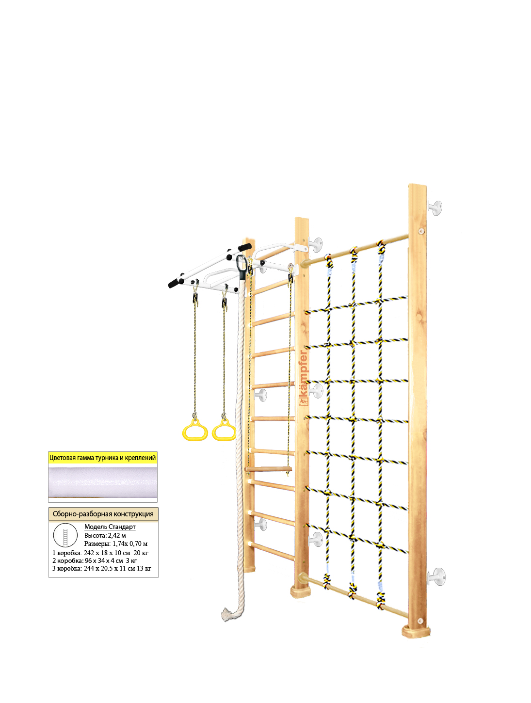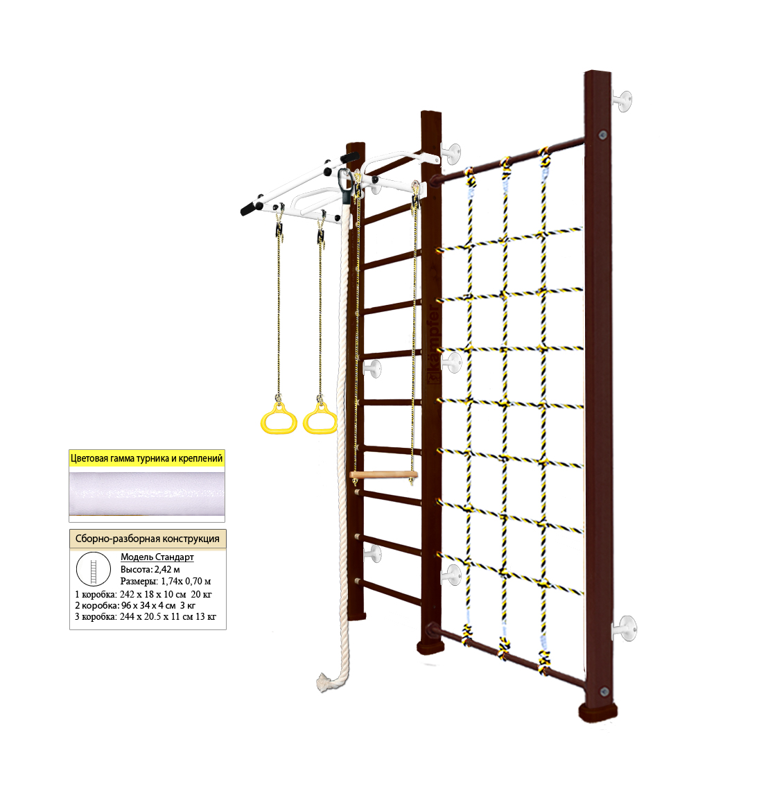 — Общая ширина шведской стенки включая стойку с сеткой и выступ рукоятки турника: 174 см