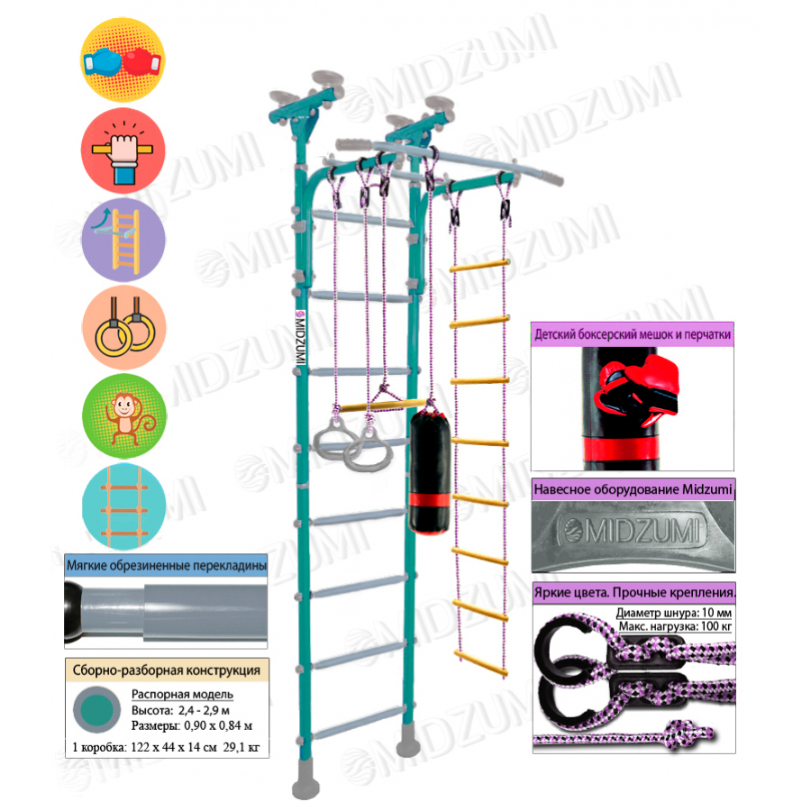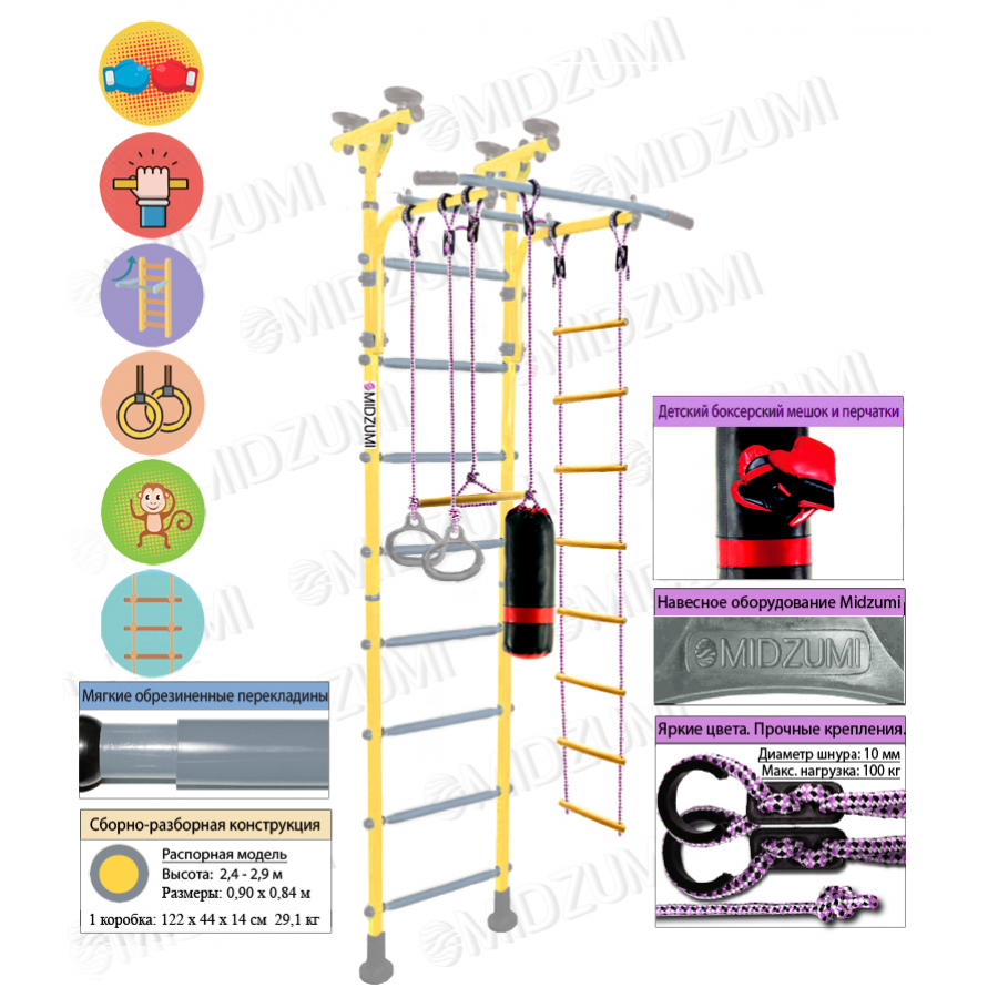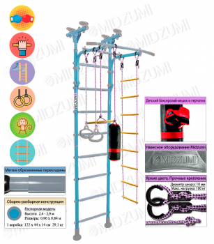 Детский спортивный комплекс Midzumi Banji Boxing имеет прочную металлическую конструкцию, которая позволяет выдерживать до 100 кг.