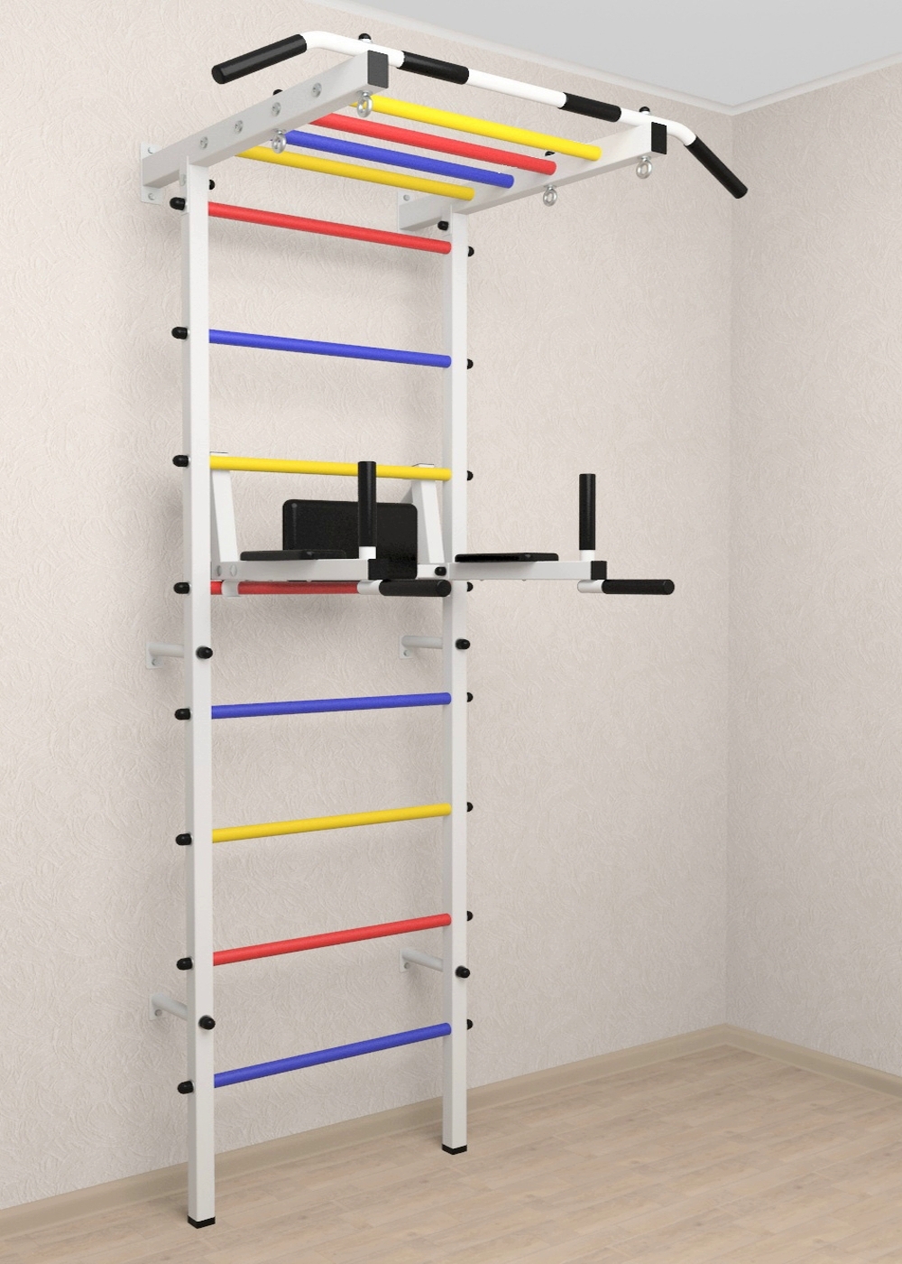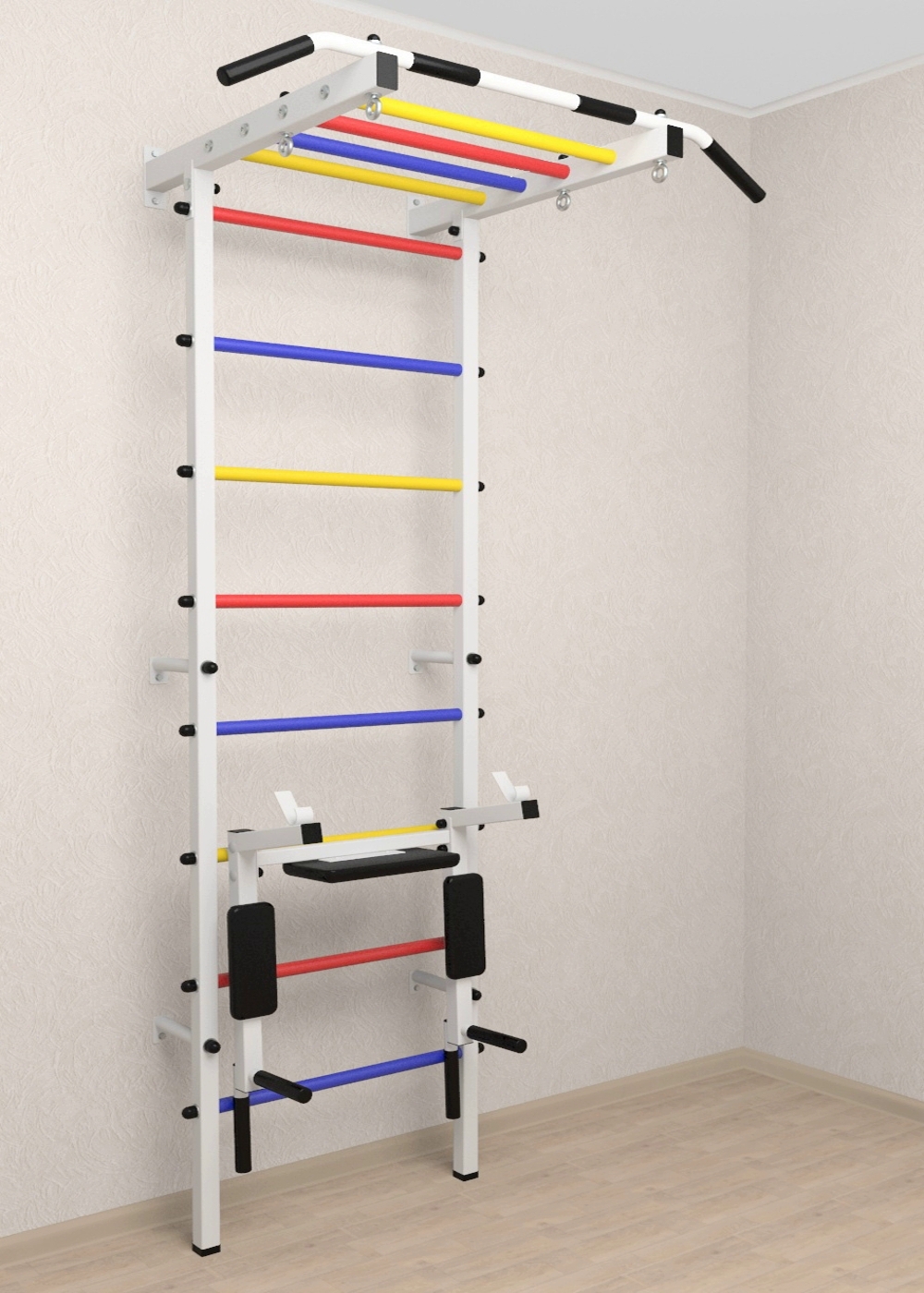 • Цвет покраски: белый; Цвет фурнитуры: черный; Цвет ступеней: черный, разноцветный, синий, желтый, красный.