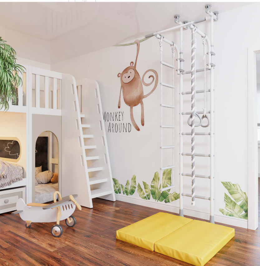 Пастельный цвет ступеней гармонично сочетается с серым корпусом, спортивный уголок стильно выглядит в любом интерьере.