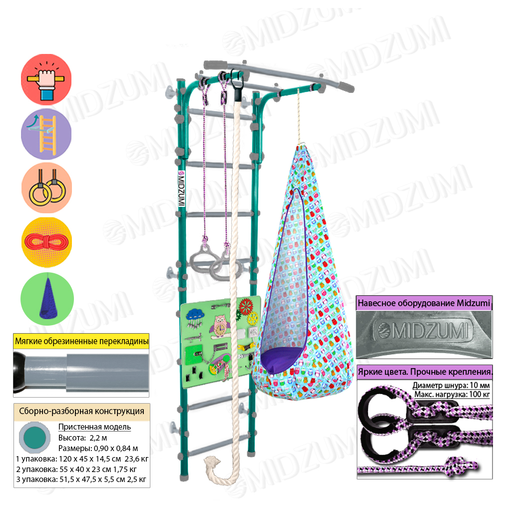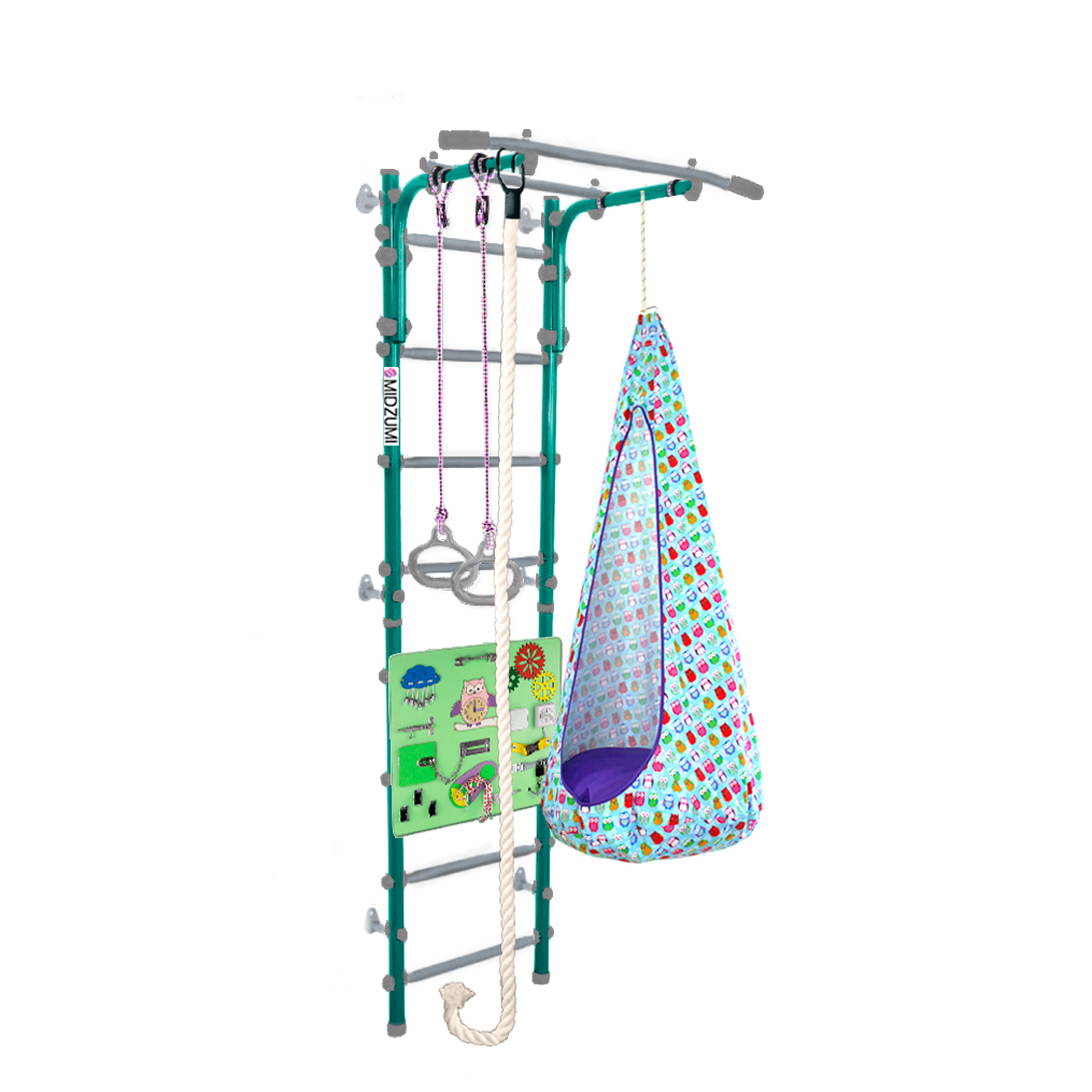 Комплектация: основа - металлическая шведская стенка с турником, гимнастические кольца, канат, качели-кокон, бизиборд.