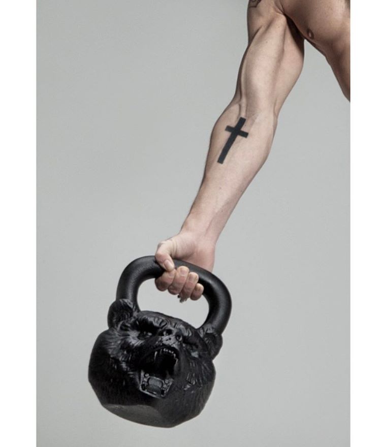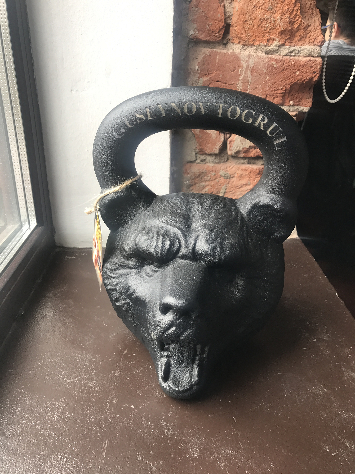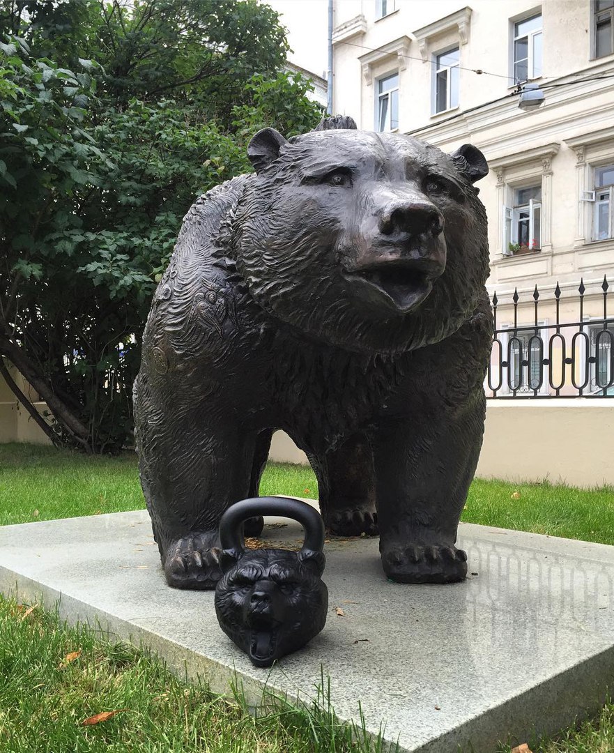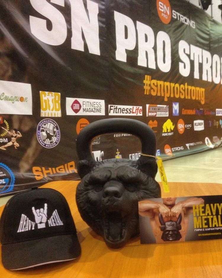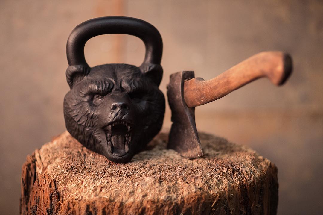 Гиря Медведь. Есть в трех вариантах: 16, 24 и 32 килограмма. Выполнена из чугуна в виде головы медведя, черного цвета. Гиря хорошо сбалансирована и снабжена ручкой, очень удобной для хвата.