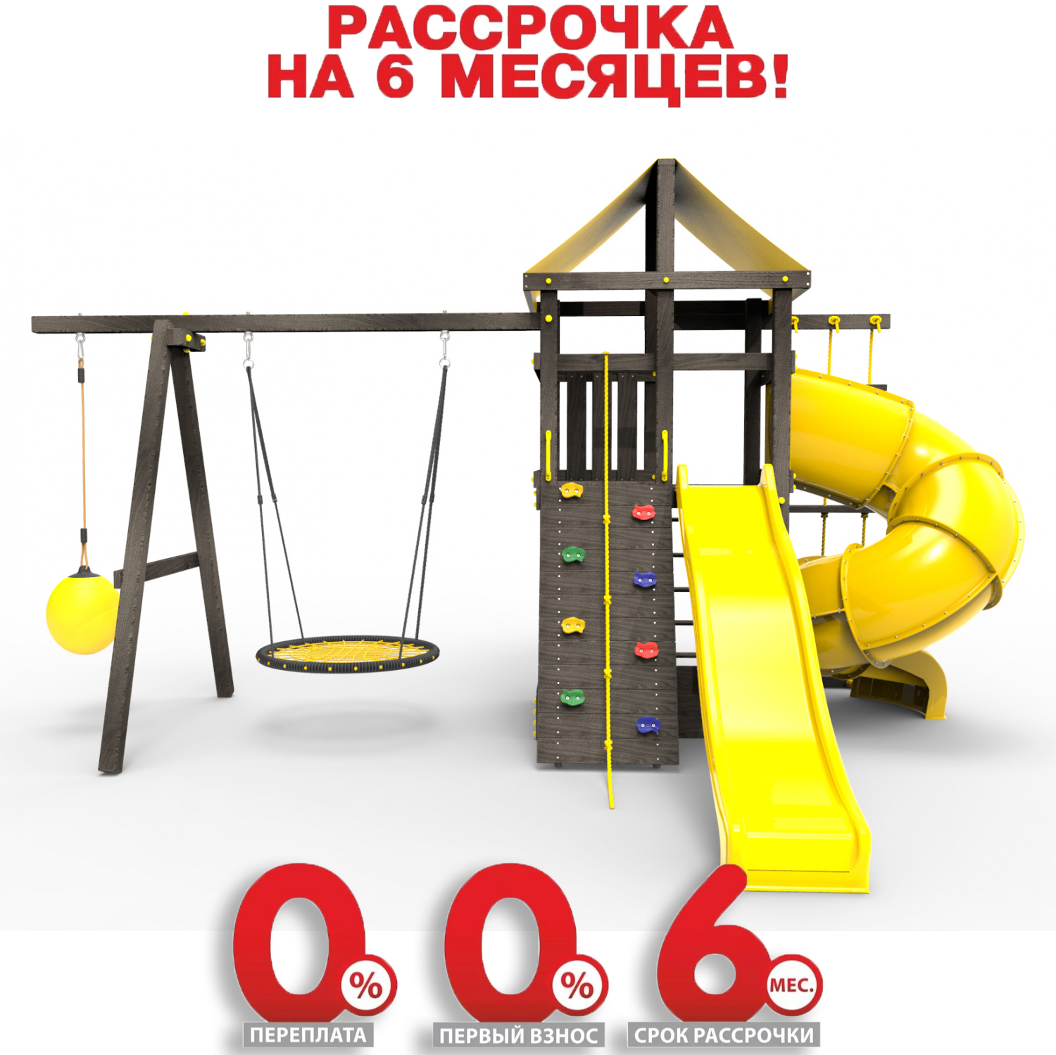 Обращаем Ваше внимание, что фактический цвет детской площадки может отличаться от представленных фото на сайте. Специфика окраски нетоксичными пропитками и красителями допускает отклонения в цветовой гамме отгружаемых изделий. Также обратите внимание, что фактический цвет может отличаться из-за цветопередачи устройства на котором Вы смотрите фото.