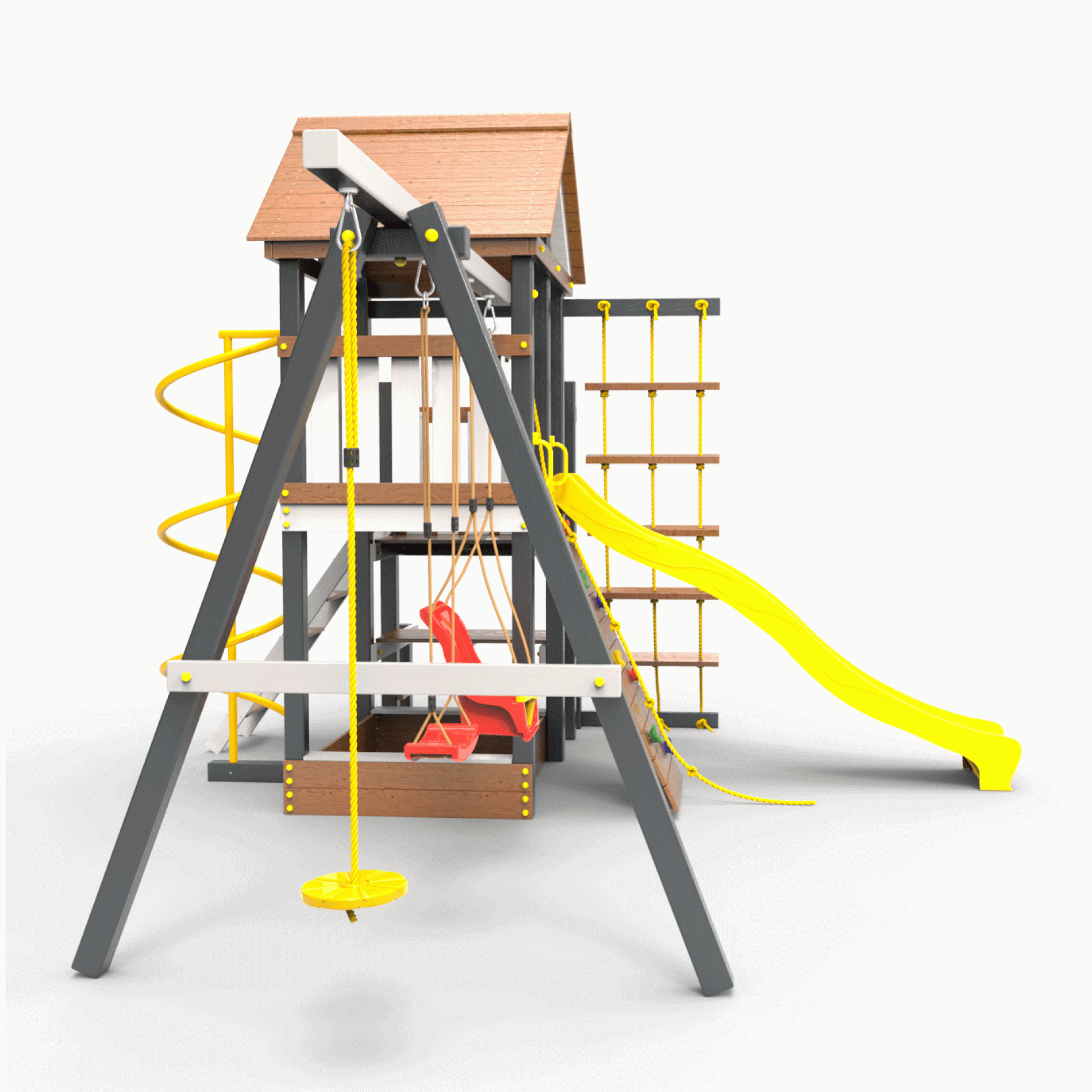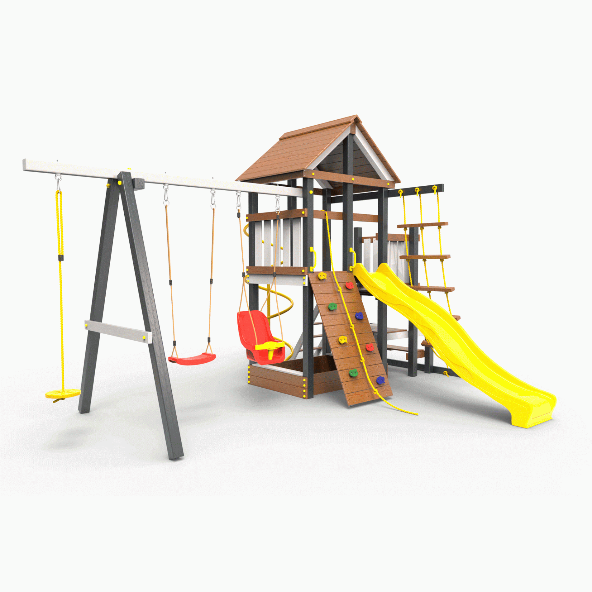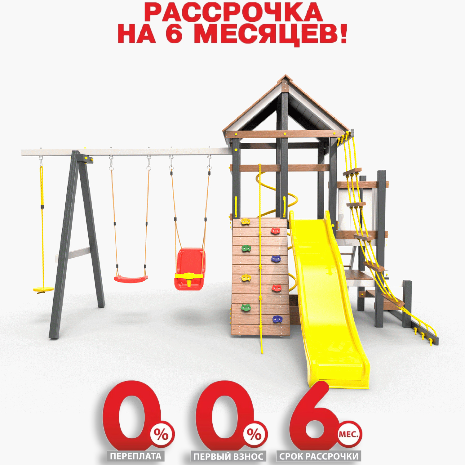 Обращаем Ваше внимание, что фактический цвет детской площадки может отличаться от представленных фото на сайте. Специфика окраски нетоксичными пропитками и красителями допускает отклонения в цветовой гамме отгружаемых изделий. Также обратите внимание, что фактический цвет может отличаться из-за цветопередачи устройства на котором Вы смотрите фото. Производитель оставляет за собой право менять цвет отдельных деталей и комплектующих(включая пластик, канаты и пр.), при этом сохраняя весь функционал и характеристики товара.
