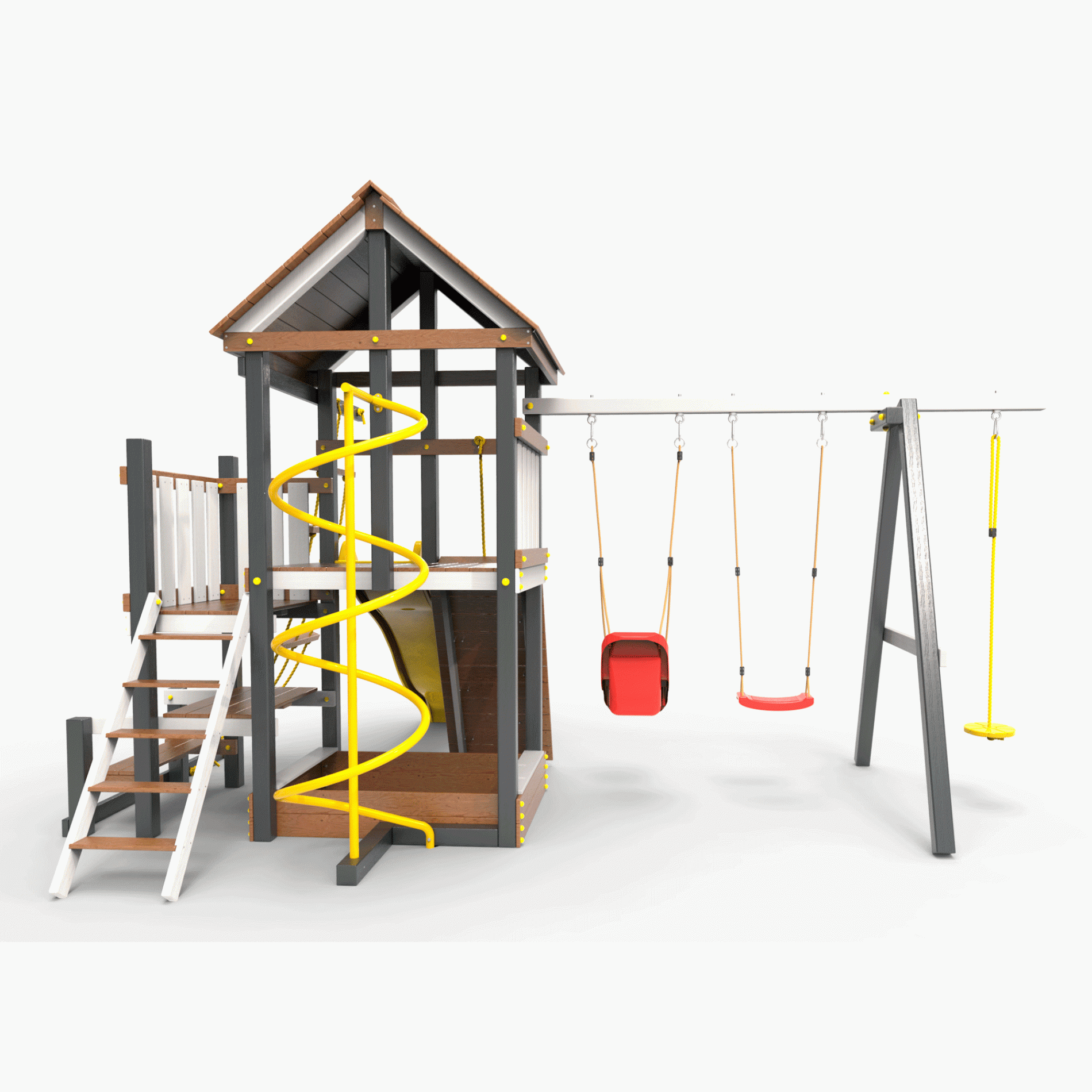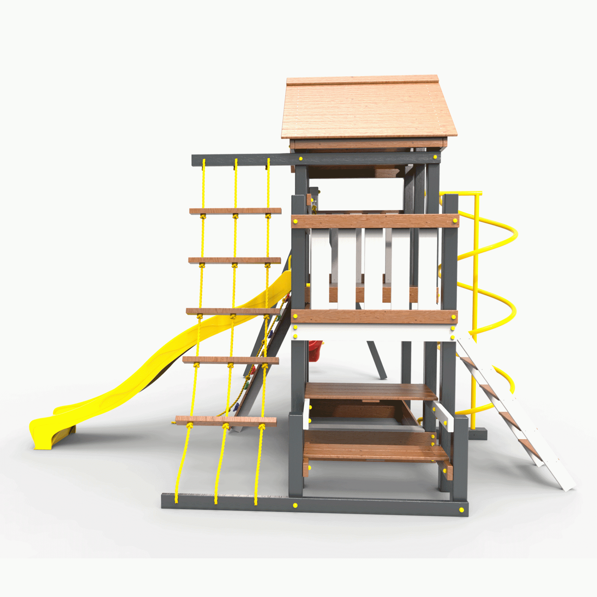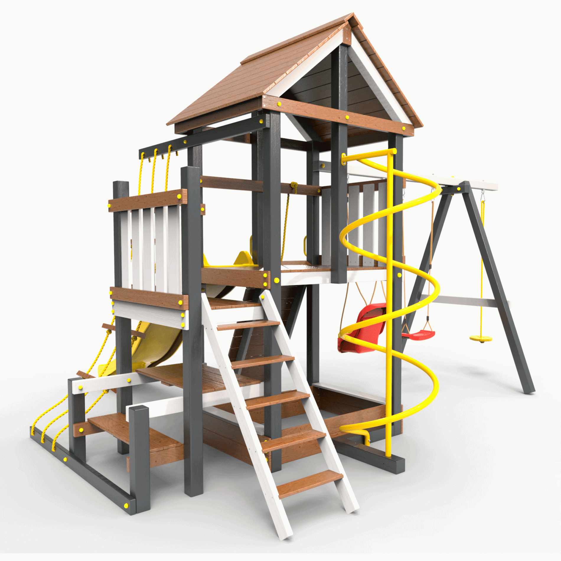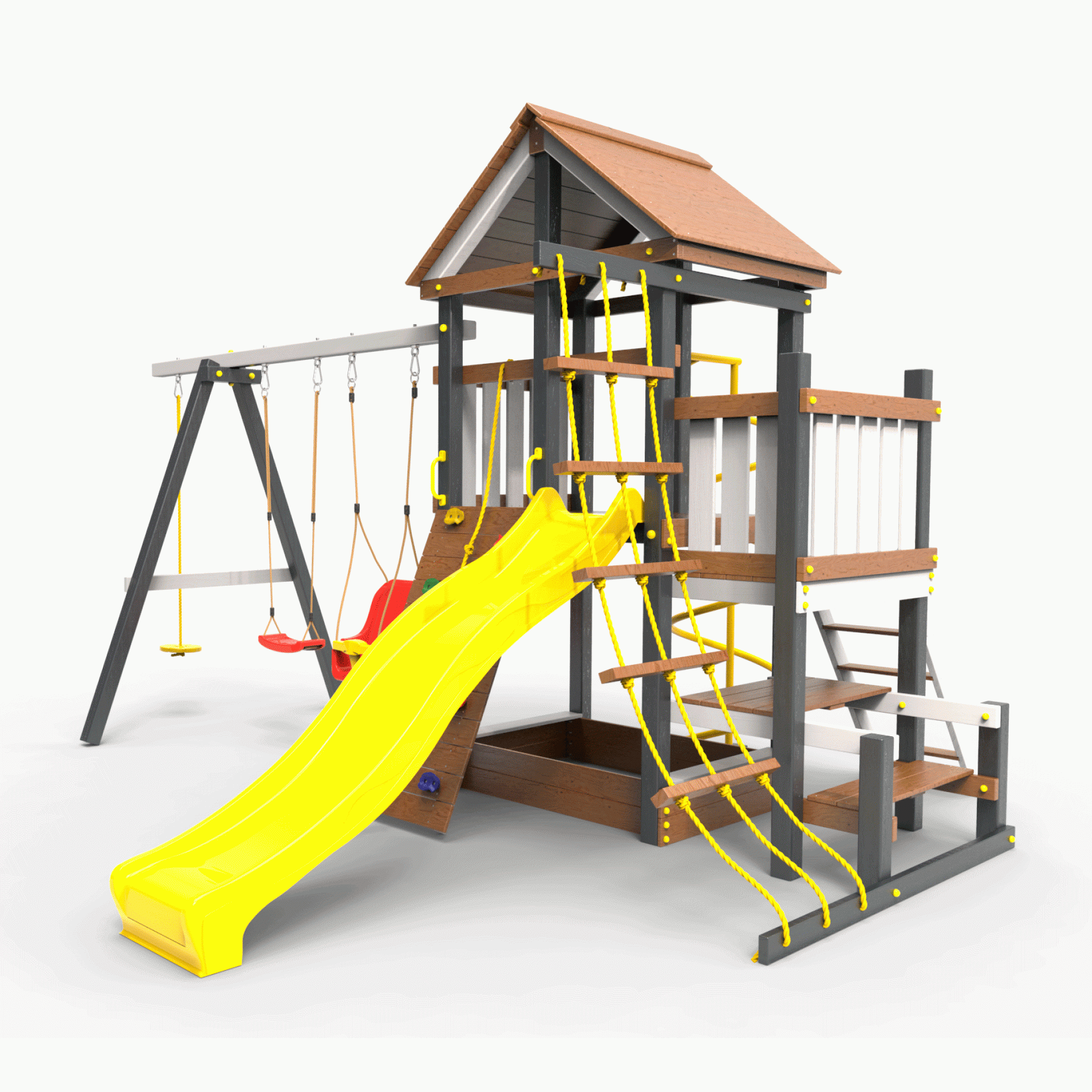 Обращаем Ваше внимание, что фактический цвет детской площадки может отличаться от представленных фото на сайте. Специфика окраски нетоксичными пропитками и красителями допускает отклонения в цветовой гамме отгружаемых изделий. Также обратите внимание, что фактический цвет может отличаться из-за цветопередачи устройства на котором Вы смотрите фото. Производитель оставляет за собой право менять цвет отдельных деталей и комплектующих(включая пластик, канаты и пр.), при этом сохраняя весь функционал и характеристики товара.