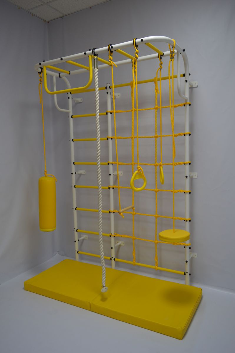 Комплектация Макси: канат, трапеция, кольца гимнастические, сетка для лазания, мат с чехлом из кожзама 1,6х0,66м, груша боксерская, тарзанка.