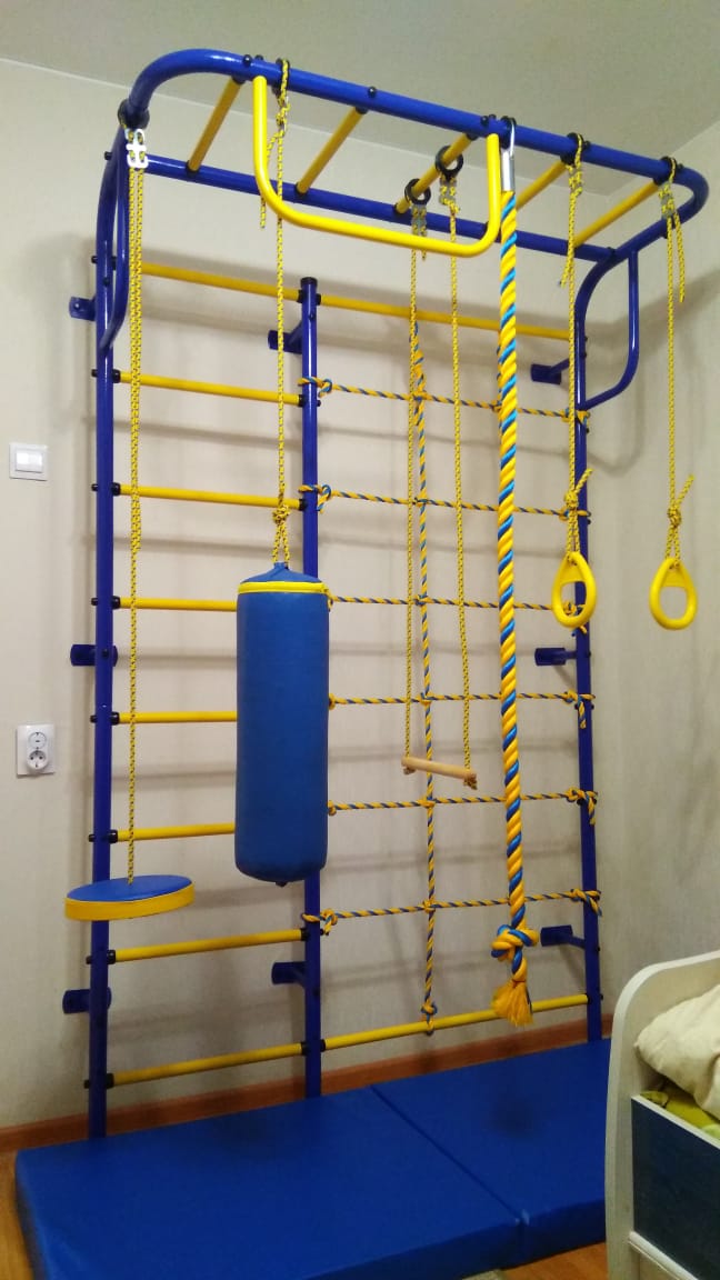 Комплектация Макси: канат, трапеция, кольца гимнастические, сетка для лазания, мат с чехлом из кожзама 1,6х0,66м, груша боксерская, тарзанка.