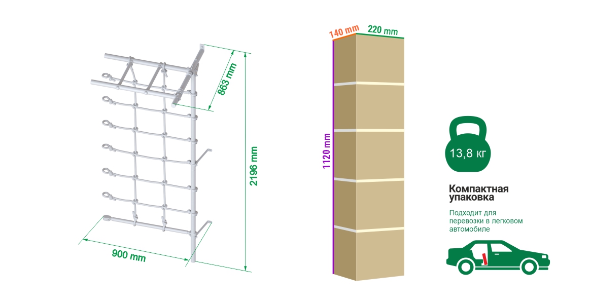 В комплект входит стойка с рукоходом и канатным лазом, а также все необходимые крепежи к стене и к шведской стенке. В целях обеспечения безопасности во время занятий на комплексе, рекомендуется дополнить комплект матом.