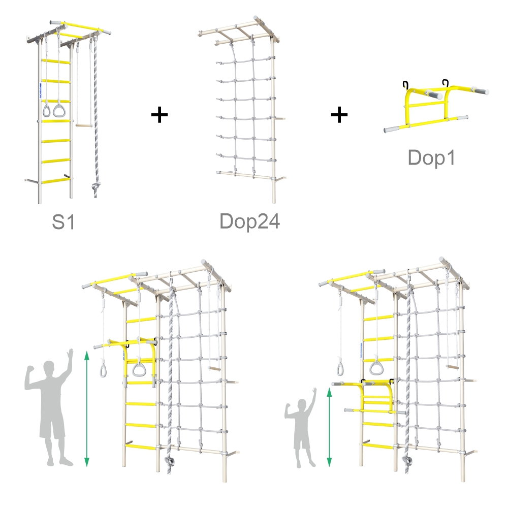 Комплекс дополнен игровыми элементами для различных возрастных групп. Комплект включает в себя: шведскую стенку, турник, кольца, трапецию, турник-брусья «2 в 1», рукоход, сетку лаза и канат. Конструкция комплекта подобна Шведской стенке ROMANA S7, но в ROMANA S1 PRO (Комплект №10) более широкая лестница, которую дополняет Турник-брусья «2 в 1». С таким дополнением по желанию детей можно легко и быстро изменить уровень турника, а также за пару секунд сменить турник на брусья и провести полноценную тренировку.