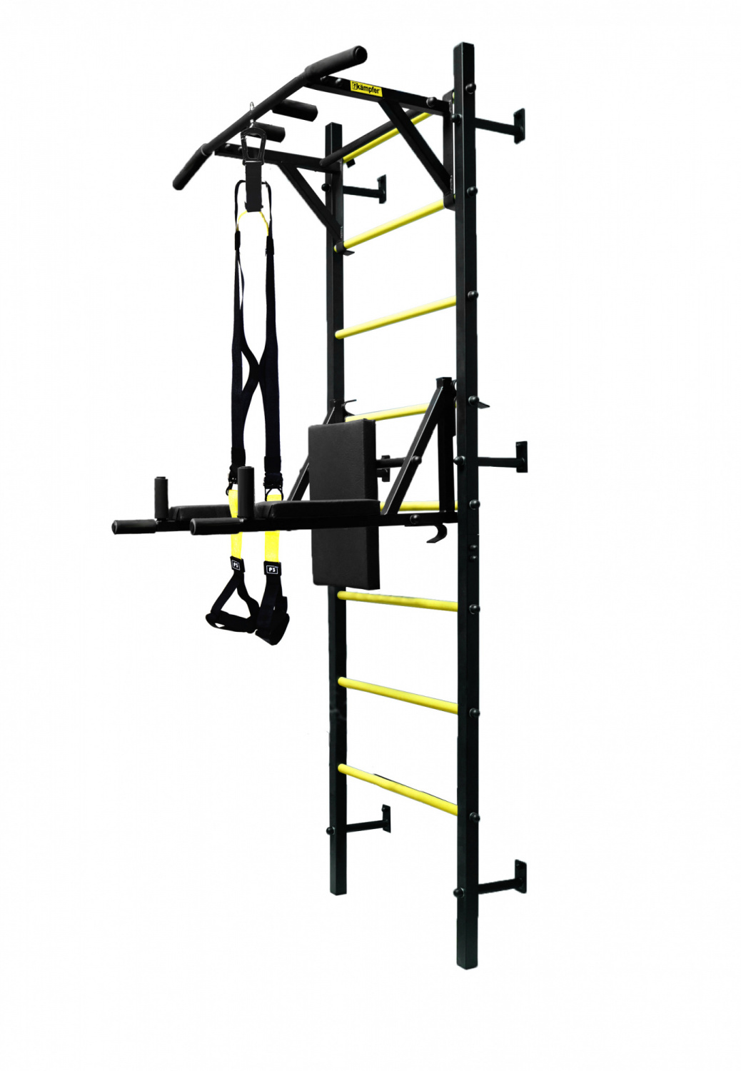 Kampfer Germes Powerful является многофункциональным спортивным снарядом для домашних тренировок всей семьи так как совмещает в себе функционал сразу нескольких тренажеров: турник с различными хватами, универсальные спортивные брусья для отжиманий при перевороте превращаются в держатель штанги, а так же петли TRX которые крепятся к спортивному комплексу и позволяют выполнить множество упражнений, на развитие мышц пресса и рук. Турник передвижной, устанавливается под размер пользователя. Шведская стенка изготовлена из толстостенного металлопроката с использованием надежных сварных соединений в среде защитного газа и качественных болтовых соединений. Конструкция окрашена порошковой краской с повышенной стойкостью к сколам и царапинам. В отличии от аналогичных моделей Professional, которые имеют цельнолитые вертикальные стойки шведской стенки, модель Powerful - имеет более компактную, сборную конструкцию стоек шведской стенки, что значително облегчает ее перевозку и сборку-установку. Прочная металлическая конструкция позволяет выдерживать до 250 кг, что позволяет проводить силовые нагрузки с гантелями и штангой.