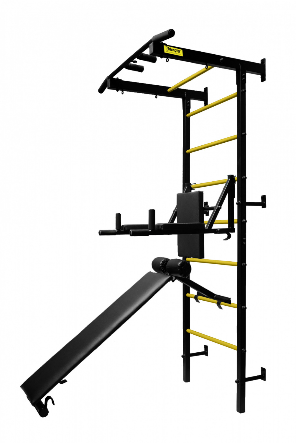 Kampfer Sirius Powerful является многофункциональным спортивным снарядом для домашних тренировок всей семьи так как совмещает в себе функционал сразу нескольких тренажеров: турник с различными хватами, универсальные спортивные брусья для отжиманий при перевороте превращаются в держатель штанги, а так же скамья для пресса и жима лежа. Конструкция позволяет размещать навесное оборудование на разной высоте для комфортных занятий людей с разным ростом. Шведская стенка изготовлена из толстостенного металлопроката с использованием надежных сварных соединений в среде защитного газа и качественных болтовых соединений. Конструкция окрашена порошковой краской с повышенной стойкостью к сколам и царапинам. В отличии от аналогичных моделей Professional, которые имеют цельнолитые вертикальные стойки шведской стенки, модель Powerful - имеет более компактную, сборную конструкцию стоек шведской стенки, что значително облегчает ее перевозку и сборку-установку. Прочная металлическая конструкция позволяет выдерживать до 250 кг, что позволяет проводить силовые нагрузки с гантелями и штангой.