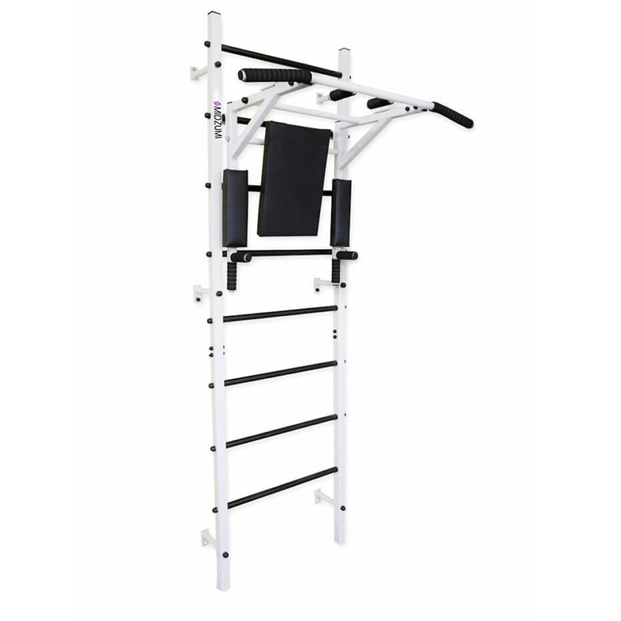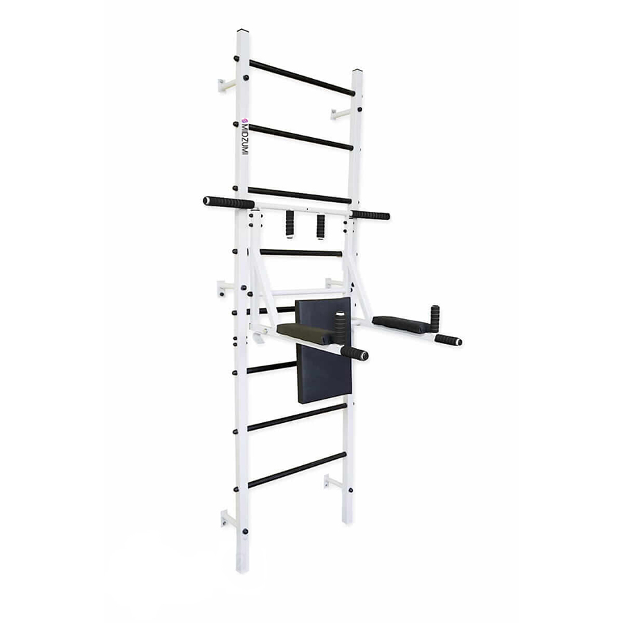 Универсальная модель оборудована многофункциональным турником 3в1 (турник+брусья+пресс), с помощью которого можно работать с разными группами мышц не привлекая дополнительное оборудование. Белое исполнение шведской стенки в сочетании с черными прорезиненными ступенями и хватами не только защитит руки от скольжения, но и выглядит практично. Прочная металлическая конструкция позволяет выдерживать нагрузку до 250 кг. Рассчитан в первую очень на занятия взрослому, но возможно заниматься и ребенку.